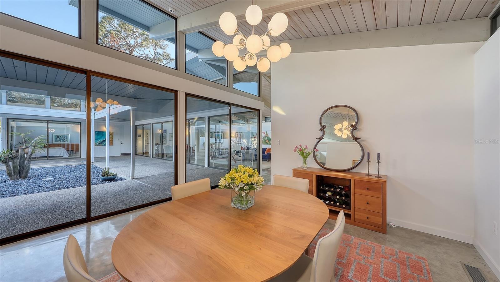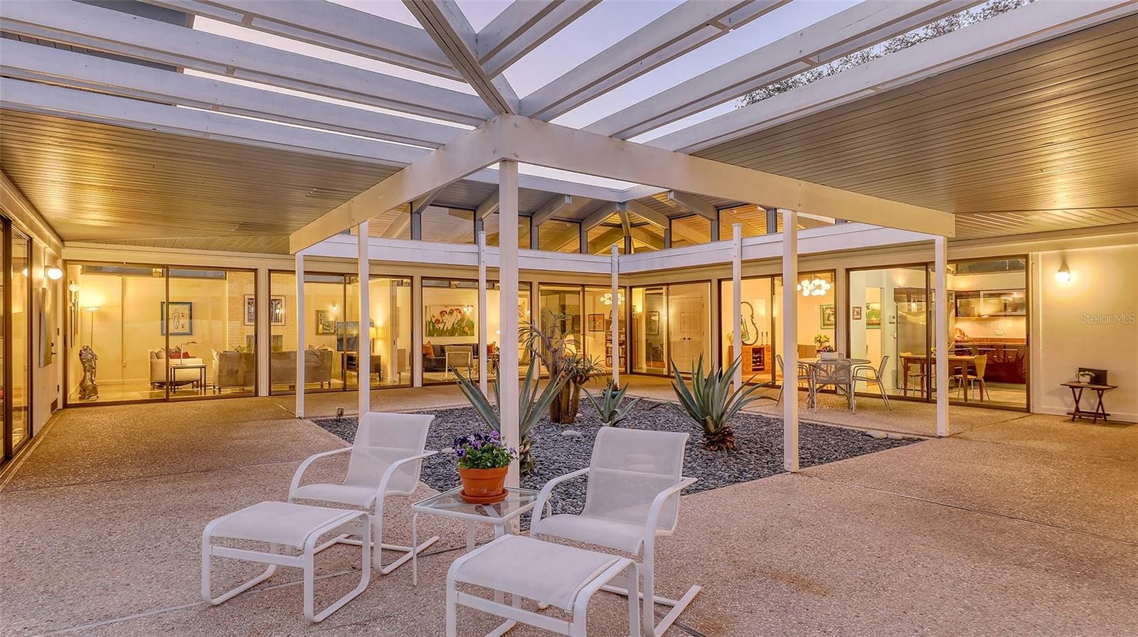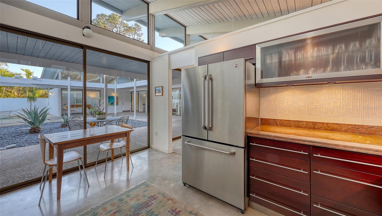 A rare opportunity to own a piece of Sarasota’s architectural history—The Bechtel House, designed in 1967 by Tim Seibert of Siebert Architects, AIA, one of the leading firms of the Sarasota School of Architecture. Thoughtfully renovated around 2009 by former owner/architect Al Bender, with assistance from Sam Holladay of the Seibert office, the home preserves its historic character while incorporating modern updates. This mid-century modern residence exemplifies the iconic style, featuring soaring ceilings, clerestory windows, and sliding glass walls that open to walled gardens and a saltwater pool. The vaulted 12-foot wood-beamed ceilings and varied heights create an abundance of natural light and openness, complemented by sleek polished concrete floors. With 2,520 square feet of interior living space, the home feels remarkably spacious. The open and airy living room flows seamlessly into a family room with a fireplace. A central courtyard anchors the design, with most rooms opening to this private outdoor sanctuary through sliding glass doors. The updated kitchen blends modern functionality with historic charm, featuring newer cabinetry, a glass tile backsplash, and stainless-steel appliances, including a Thermador induction cooktop, range, microwave, and GE refrigerator and dishwasher. A cozy breakfast nook near the sliding doors is perfect for intimate meals, while the adjacent dining room offers ample space for entertaining. Off the two-car garage is a separate studio office, ideal as a third bedroom or creative space. The bedroom wing includes a spacious primary suite with a walk-in closet and a thoughtfully renovated ensuite bath, highlighted by a glass-framed walk-in shower that extends into the garden for a serene, spa-like experience. The stunning courtyard offers more than 2,000 square feet of outdoor living space. Glass walls seamlessly connect the interior to the private garden courtyard. A river-rock lanai deck surrounds the large saltwater pool, providing a tranquil retreat, while a grassy yard behind the courtyard offers space for pets or gardening. Situated in the highly desirable Whitfield area, this home is a true representation of mid-century modern design. Nearby attractions include the Ringling Museum of Art, the historic 1920s-era Sara Bay Country Club, Ringling College of Art & Design, SRQ International Airport, Downtown Sarasota, marinas, museums, shopping, dining, and world-renowned beaches. This one-of-a-kind mid-century modern masterpiece is awaiting a discerning buyer who appreciates its historic and artistic significance.