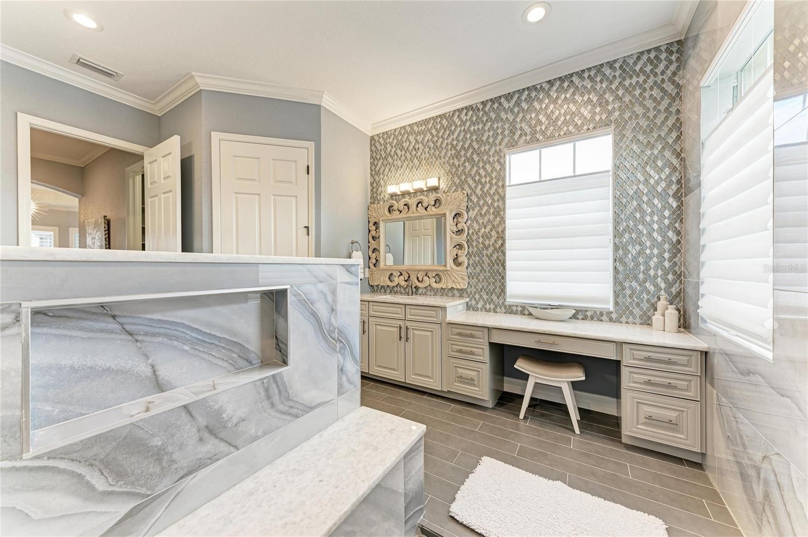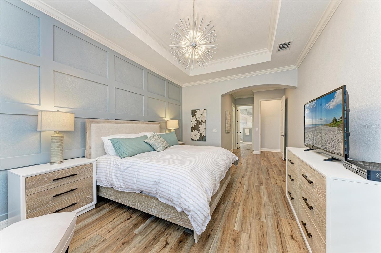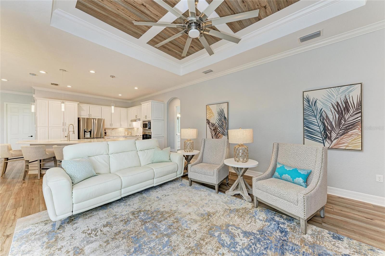 A truly remarkable, one-of-a-kind estate residence awaits in the exclusive, gated resort community of River Strand Golf & Country Club. Thoughtfully designed with over $230,000 in HIGH-END UPGRADES AND PROFESSSIONAL INTERIOR DESIGN, this extraordinary home commands attention from its prominent oversized corner lot and delivers an elevated lifestyle at every turn. Inside, the traditional floor plan has been masterfully reimagined. The wall once separating the dining room and kitchen has been removed, creating an open, sophisticated flow. A stylish office now graces the entry, while the former formal living area has been transformed into an impressive grand dining salon, complete with a chic dry bar—perfect for elegant entertaining. The chef’s kitchen is a showpiece, boasting brand-new custom cabinetry, counter-height quartz surfaces, and a beautifully designed pantry. Offered FURNISHED, this residence exudes luxury with custom lighting, designer feature walls, and quartz finishes carried through every guest bath. The primary suite is a true retreat, offering direct lanai access, a generous walk-in with a fully customized closet system, and a spa-inspired bath featuring a makeup vanity, new sinks and counters, statement mirrors, and a one-of-a-kind shower. Throughout the home, wide-plank luxury vinyl adds warmth and sophistication. Step outside to the gorgeous lanai designed for true resort-style living. A heated saltwater pool and spa with tanning ledge sits atop pristine travertine pavers, while a brand-new custom outdoor kitchen—complete with built-in grill, beverage cooler, and bar—invites effortless entertainment. All of this is framed by the beautiful golf and water views that River Strand is known for creating your own serene retreat! Additional upgrades include full interior and exterior paint, custom window treatments and blinds, and an enhanced three-car garage featuring epoxy flooring and custom cabinetry. Three beautifully appointed guest suites and two full guest baths—one serving as a convenient pool bath—ensure comfort for all. River Strand itself is a crown jewel, offering 27 holes of championship golf, a refined CLUBHOUSE with fine dining and a grille room, two resort pools with spas, six satellite pools, dual fitness centers, exceptional tennis and pickleball facilities and numerous social and fitness events and activities. The club is currently undergoing a multi-million-dollar transformation, promising refreshed amenities including an enhanced clubhouse, expanded pool and tiki bar dining, and elevated outdoor dining. Perfectly located just minutes from I-75, The Marketplace with Costco, Target and an exciting lineup of new restaurants and shops. All this and close to the stunning beaches of Florida’s Gulf Coast. You will love calling this your next home, once you experience River Strand at its best, you may never want to leave!