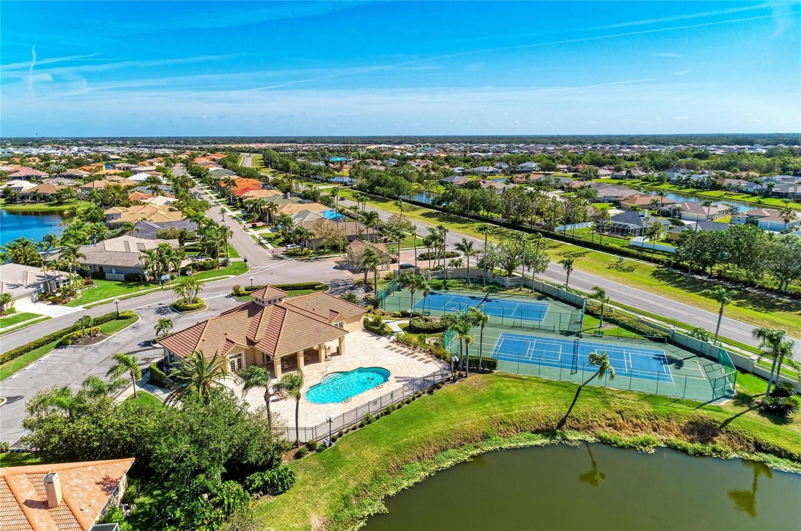 Welcome home to this beautiful lakefront retreat on a delightful street, tucked inside a peaceful, gated community with low HOA fees and resort-style amenities. This well-maintained home offers 4 spacious bedrooms, 3 full baths, and 3-car garage. High ceilings and luxury vinyl flooring throughout create a bright, open feel, while the kitchen shines with quartz countertops, newer appliances, gas range, and Bosch dishwasher—perfect for everyday living and entertaining alike. Enjoy long lake views from the comfort of your home and take in unforgettable sunset skies that make every evening feel special. Step outside to soak up the sun, relax and unwind on the spacious lanai with heated pool, perfect for enjoying the serene surroundings and even visiting Roseate Spoonbills. Lanai sliders are fully stackable and offer an unobstructed view. Recent updates include a tiled roof (2024), brand new washer and dryer and refreshed lanai deck and walkways. Home also features a bifold library murphy bed, luxury vinyl flooring throughout, built-in bookcases, as well as roll-down/electronic hurricane shutters and generator, adding both value and peace of mind. Located within an A-rated school district, inclusive of Tatum Ridge, a perennial 5-star, A-rated elementary school. Rothenbach Park and The Celery Fields are also nearby where outdoor enthusiasts enjoy biking, jogging and walking trails. Just one mile to the Publix shopping plaza and only minutes to Lakewood Ranch Main Street and Waterside Place. Easy access to UTC, our sandy Gulf beaches, Sarasota's Main Street, theaters, museums and symphony. Home is ideally situated without sacrificing the serenity of east county living. The Laurel Lakes community truly elevates the lifestyle even further, featuring a recently renovated community center with a resort-style pool, pickleball, and basketball. This is Florida living at its best— gated, beautiful, relaxed, lakefront, pool, a coveted 3-car garage, and ready to enjoy. There is no CDD. Schedule your private showing today and envision the lifestyle that awaits.