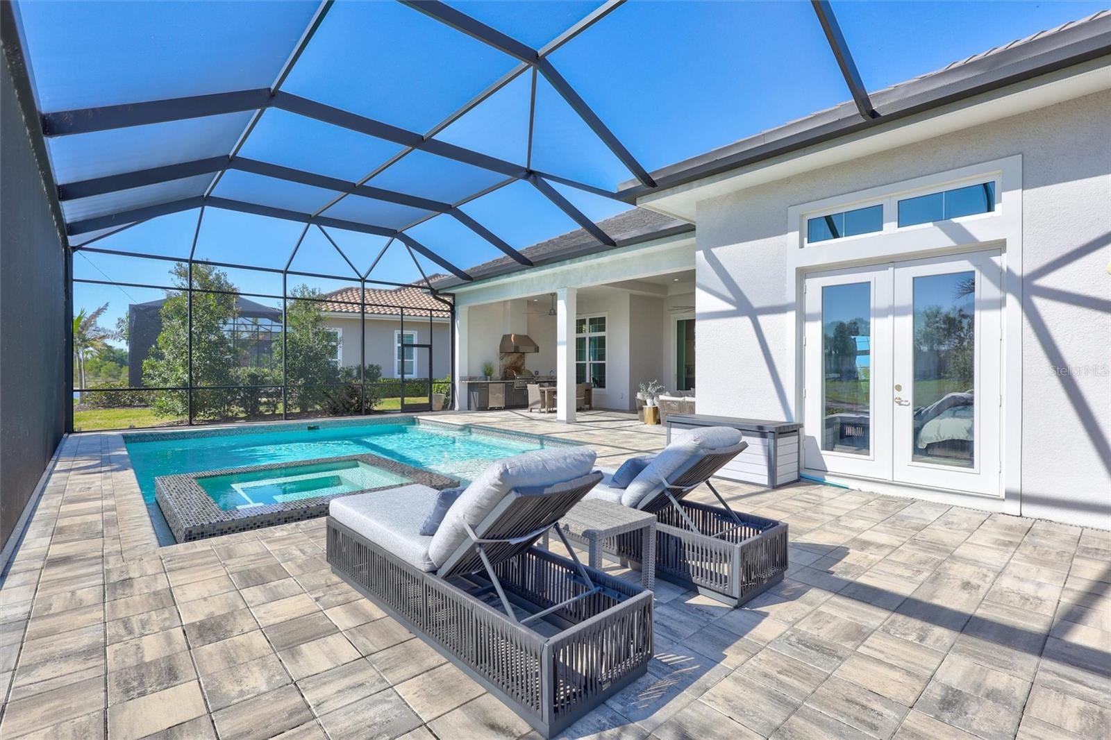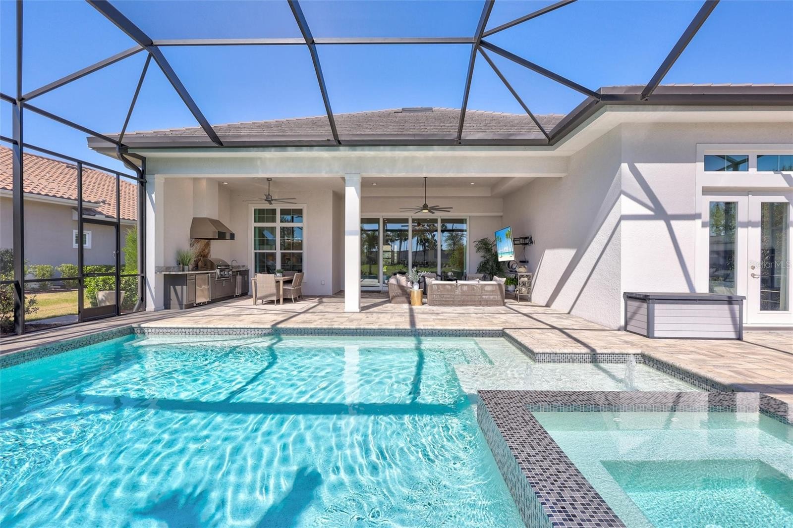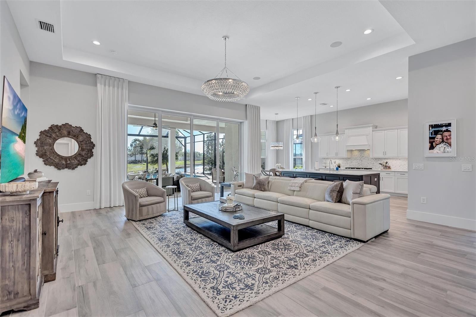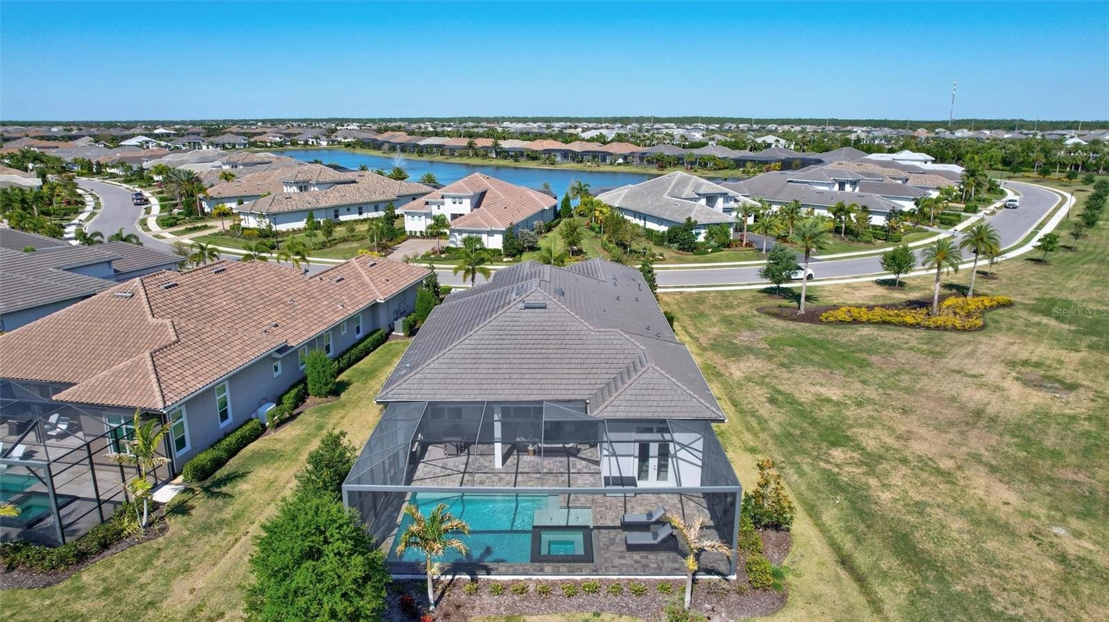 Experience refined Florida living in this beautifully appointed residence within the renowned Lake Club, where comfort, style, and thoughtful design come together in one of Lakewood Ranch’s most sought-after communities. Ideally positioned on a premium water-view homesite, this 2022-built home captures tranquil pond sunsets from its generously sized covered lanai, complete with a panoramic screened enclosure, finished ceilings, and a fully equipped summer kitchen. Spanning just under 3,000 square feet, the home features an open-concept great room enhanced by soaring ceilings and elegant porcelain plank tile flooring throughout the main living areas. The chef’s kitchen is both functional and stylish, complete with quartz countertops, soft-close cabinetry with pull-out shelving, and a suite of stainless steel appliances, including a gas cooktop and convection oven. Thoughtful enhancements include professionally installed landscape lighting in both the front and rear of the home, as well as a custom outdoor kitchen and smart home upgrades, including a fully automated AV system. Additional interior features include impact-rated windows and doors and upgraded lighting throughout, creating a polished, move-in-ready environment. The spacious primary suite offers a relaxing retreat with a spa-inspired bathroom featuring dual vanities, a walk-in shower, and a freestanding soaking tub. Step outside to your own private outdoor oasis, highlighted by a heated saltwater pool and spa, a generously sized covered lanai with finished ceilings, and a fully equipped summer kitchen—perfect for entertaining or simply enjoying the serene water views. The three-car garage offers ample space and functionality, featuring epoxy flooring and added conveniences such as whole-home surge protection. Located within the gated community of The Lake Club, residents enjoy access to exceptional amenities and are just minutes from Waterside Place, UTC, Main Street Lakewood Ranch, and the area’s renowned Gulf Coast beaches. Situated in an X flood zone, this home offers both peace of mind and an elevated lifestyle in one of the region’s premier locations. Schedule your private showing today and discover all that this exceptional property has to offer.