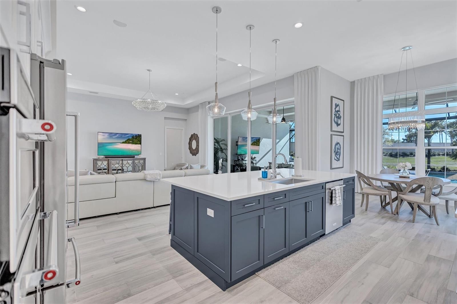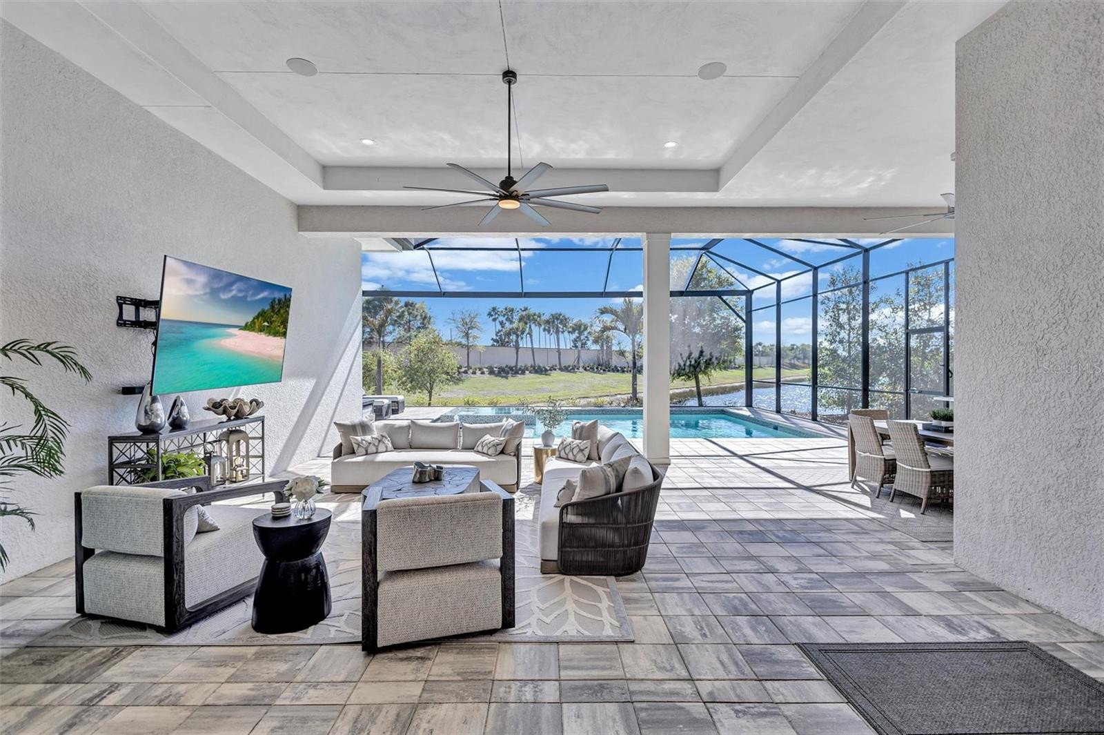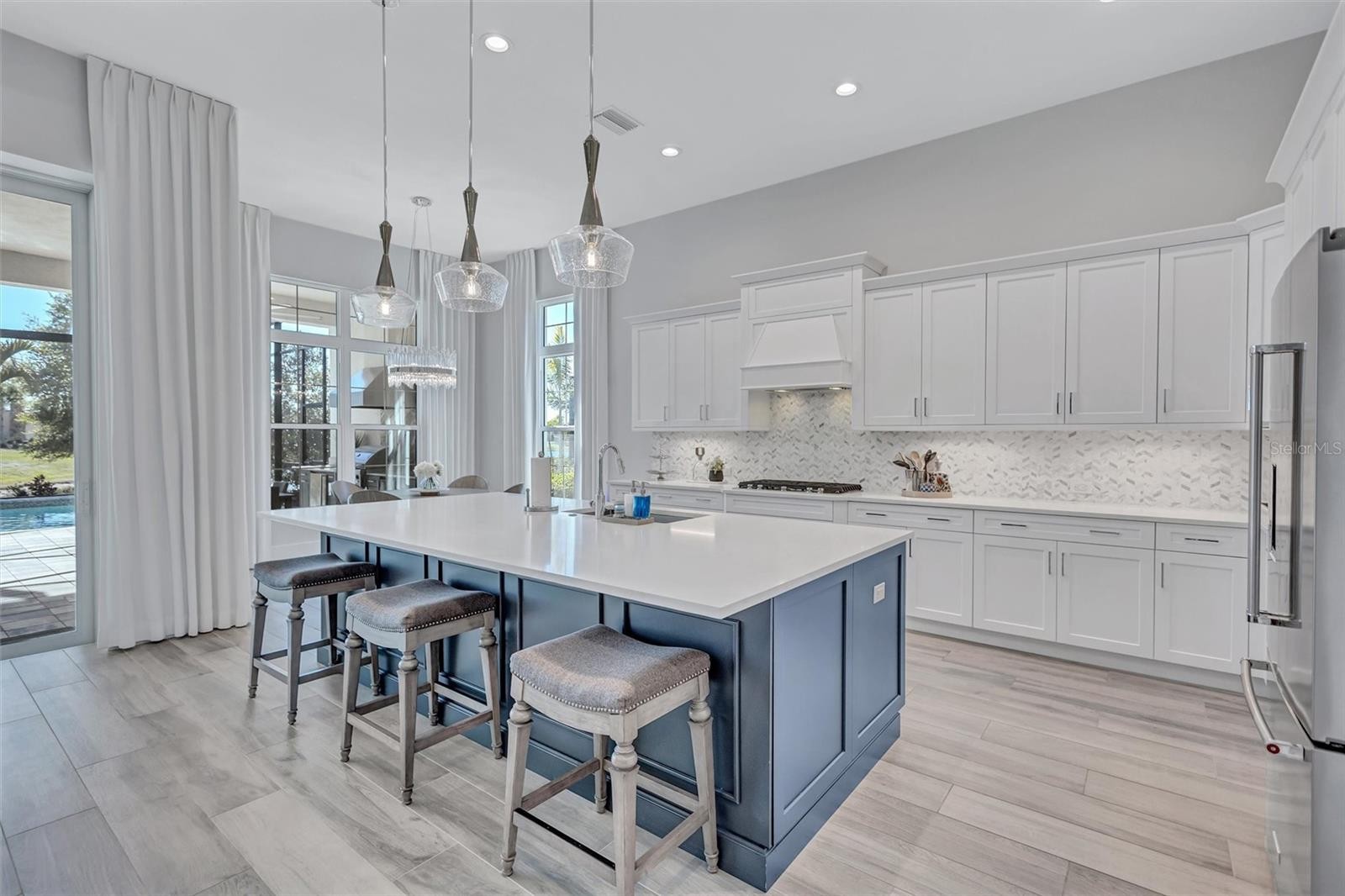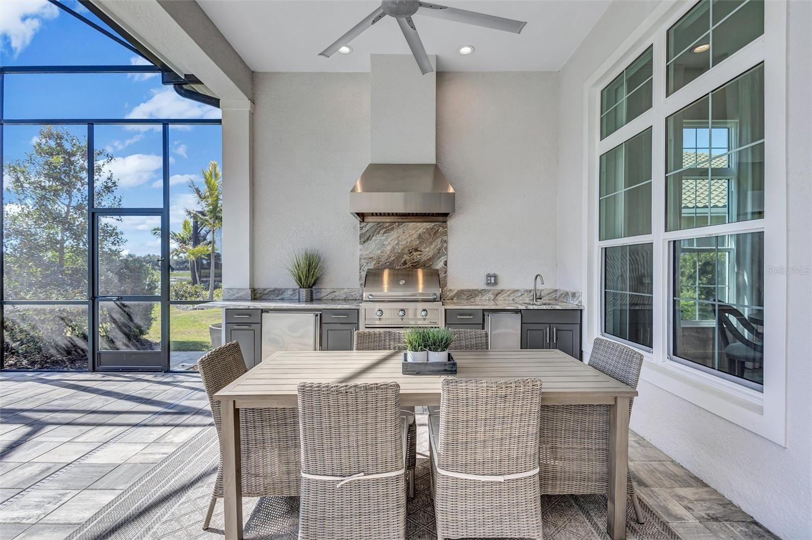 Experience refined Florida living in this beautifully appointed residence within the renowned Lake Club, where comfort, style, and thoughtful design come together in one of Lakewood Ranch’s most sought-after communities. Ideally positioned on a premium water-view homesite, this 2022-built home captures tranquil pond sunsets from its generously sized covered lanai, complete with a panoramic screened enclosure, finished ceilings, and a fully equipped summer kitchen. Spanning just under 3,000 square feet, the home features an open-concept great room enhanced by soaring ceilings and elegant porcelain plank tile flooring throughout the main living areas. The chef’s kitchen is both functional and stylish, complete with quartz countertops, soft-close cabinetry with pull-out shelving, and a suite of stainless steel appliances, including a gas cooktop and convection oven. Thoughtful enhancements include professionally installed landscape lighting in both the front and rear of the home, as well as a custom outdoor kitchen and smart home upgrades, including a fully automated AV system. Additional interior features include impact-rated windows and doors and upgraded lighting throughout, creating a polished, move-in-ready environment. The spacious primary suite offers a relaxing retreat with a spa-inspired bathroom featuring dual vanities, a walk-in shower, and a freestanding soaking tub. Step outside to your own private outdoor oasis, highlighted by a heated saltwater pool and spa, a generously sized covered lanai with finished ceilings, and a fully equipped summer kitchen—perfect for entertaining or simply enjoying the serene water views. The three-car garage offers ample space and functionality, featuring epoxy flooring and added conveniences such as whole-home surge protection. Located within the gated community of The Lake Club, residents enjoy access to exceptional amenities and are just minutes from Waterside Place, UTC, Main Street Lakewood Ranch, and the area’s renowned Gulf Coast beaches. Situated in an X flood zone, this home offers both peace of mind and an elevated lifestyle in one of the region’s premier locations. Schedule your private showing today and discover all that this exceptional property has to offer.