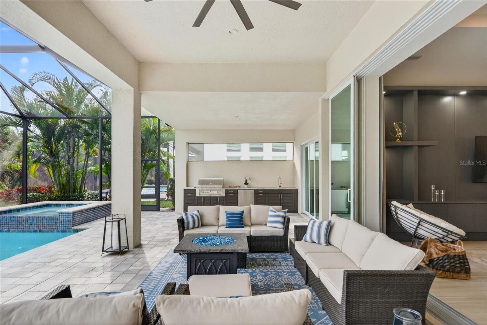 Beautifully appointed Aragon model, on a larger Estate lot, located within the sought-after Isles by Toll Brothers, this residence is perfectly positioned amid mature landscaping with tranquil sunrise and preserve views from the lanai. Offering three bedrooms, three-and-a-half baths, a den/study, and a formal dining room, the home is thoughtfully designed to balance refined sophistication with inviting comfort. A well-conceived floor plan provides exceptional privacy, with the primary suite intentionally separated from the additional en-suite bedrooms—ideal for both everyday living and hosting guests. Throughout the home, curated finishes elevate every space, including custom wall built-ins and expansive 10-foot pocket sliding glass doors that fully retract, seamlessly connecting the interior to the lanai. Additional upgrades include 13 ft ceilings, wood shutters, hurricane-impact glass, and meticulous attention to detail at every turn. The kitchen serves as a striking centerpiece, anchored by an expansive quartz island and complemented by decorative, soft-close cabinetry—beautifully suited for both entertaining and daily use. The primary suite is a true retreat, featuring dual walk-in closets, sliders to the lanai, and a generously scaled, spa-inspired en-suite bath. Each additional bedroom offers its own private en-suite bath, ensuring comfort and convenience for family and visitors alike. Seamlessly extending the living space outdoors, the expansive lanai is outfitted with a thoughtfully designed outdoor kitchen complete with a beverage station and grill. As evening falls, unwind in the spa and take in the peaceful sounds of nature from the preserve—creating a serene backdrop for both relaxation and entertaining. Luxurious living in the gated, maintenance-free community of The Isles, nestled between The Lake Club and Concession, at its best! The Isles at Lakewood Ranch offers many amenities such as a 65,000 square foot clubhouse, tennis and pickleball courts, basketball court, playground, state of the art fitness center and yoga room, resort-style swimming pool and spa, boardwalk and fishing pier, and a playground and dog park. Centrally located, just off I-75 and a short drive to the award-winning beaches of Siesta Key, Lido, & Anna Maria. This move-in ready home has all the amenities that one would want in this 2025 Best-Selling Multigenerational Planned Community in the Nation.