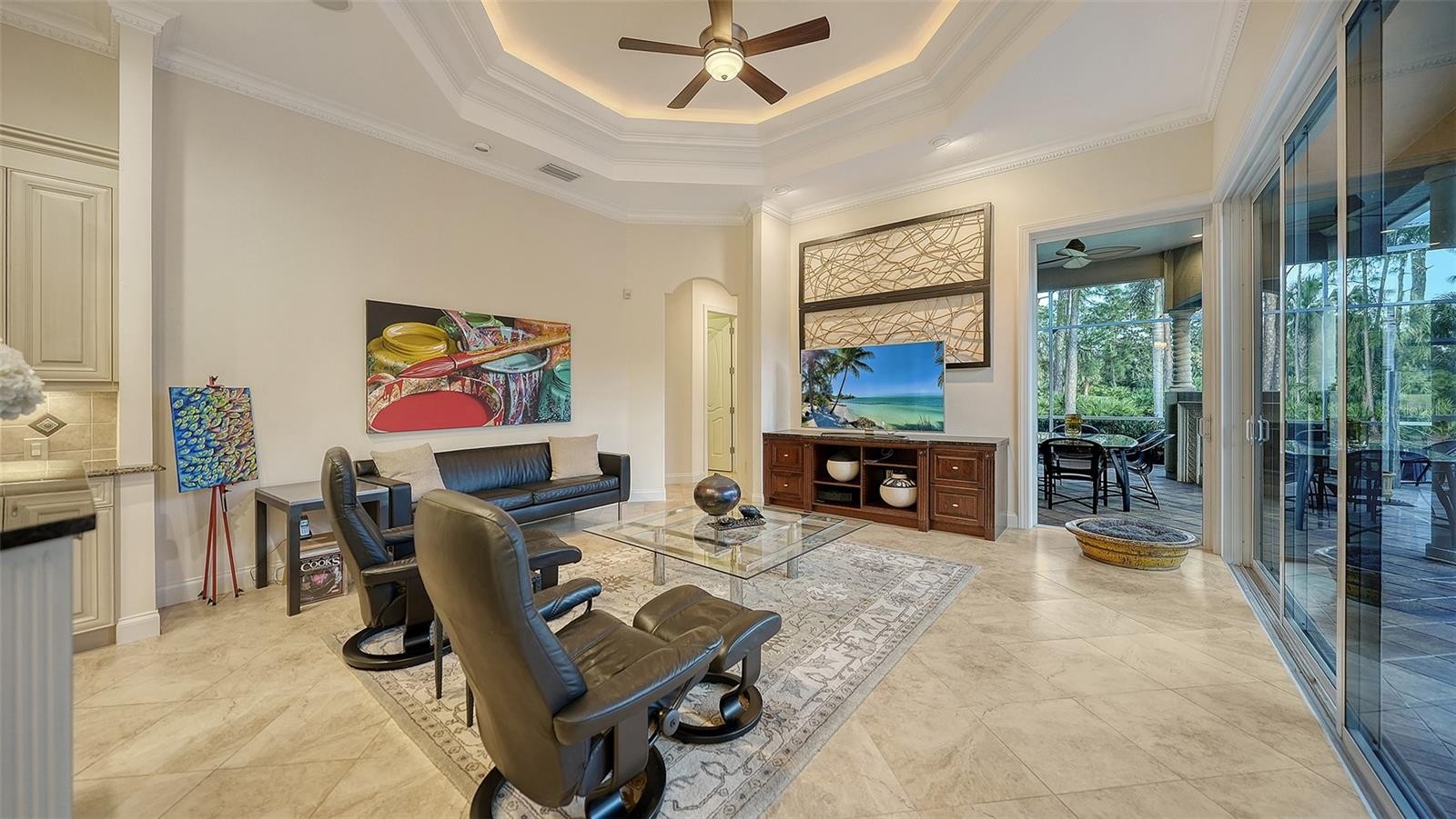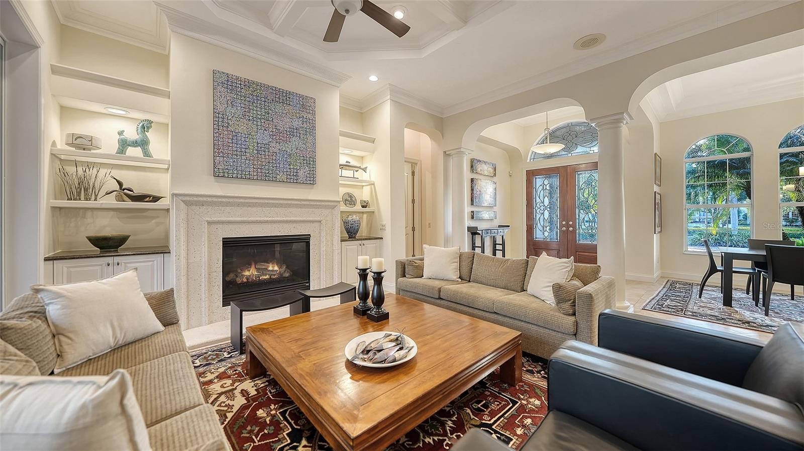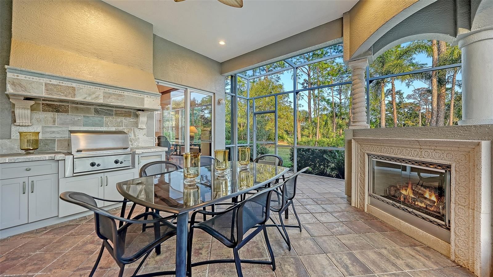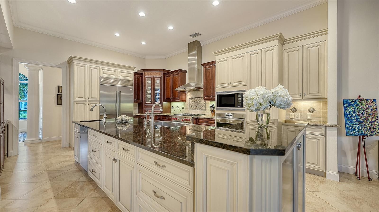 Perfectly positioned on a boulevard and a south-east facing premium homesite capturing perfect views of the 4th fairway in the heart of prestigious Grosvenor Gardens in University Park Country Club. Exceptional custom estate-style home expertly built by Todd Johnston showcasing superior construction, thoughtful design and upgraded finishes throughout. A striking entry greets owners and guests with a stone paver driveway and side-load motor court leading to a 3-car garage plus dedicated golf cart garage. Architectural details throughout, starting at the front with double wood / leaded glass doors. The spaces feature volume and double step ceilings, enhanced crown molding and baseboards, 8’ solid wood doors, upgraded hardware, and abundant recessed lighting. Hard-surface flooring throughout: hardwood and 18” x 18” porcelain tile. A gracious living room features a gas fireplace with coral stone surround, illuminated built-in cabinetry, and expansive stacked sliding glass doors opening to the pool/lanai. A formal dining room with butler’s pantry closet and dry bar sits adjacent to the kitchen, creating an ideal layout for entertaining. The gourmet eat-in kitchen is anchored by an oversized 11-ft island and showcases plenty of organized storage, custom two-tone cabinetry complemented by two-tone granite countertops and premium stainless-steel appliances: Wolf 6-burner gas range, convection oven, Sub-Zero refrigerator, 2 Asko dishwashers, and GE Monogram wine cooler. Seamlessly flowing into the family room with stacked sliding glass doors connecting to the outdoor living areas. The spacious primary suite is a serene retreat with a spa-like bath featuring marble floors, split vanities, oversized walk-in shower, jetted soaking tub, and two custom walk-in closets. Overlooking long views of the greens and fairway, a large private office with custom wood cabinetry and desk provides an ideal work-from-home space. The split plan ensures privacy with two additional first-floor en-suite guest bedrooms with custom closets and a well-placed, stylish powder room. A thoughtfully designed butler’s corridor with extra refrigerator and built-in cabinetry leads to a spacious laundry room, enhancing everyday living and entertaining. The second level offers a versatile bonus room with wet bar and balcony, plus a substantial fourth bedroom with a custom walk-in closet and full bath. A perfect sanctuary for guests or multi-generational living. The home is perfect for seamless indoor-outdoor living, with an expansive screened lanai featuring a stone paver deck, outdoor kitchen with GE Monogram gas grill, gas fireplace with stone surround, and ample covered areas for alfresco entertaining. A heated pool and spa, complete with sun shelf and spillover, create a true resort-style retreat. While broad and open golf course views are the focal point, the home is set back from the fairway and the cart path is on the far side, offering optimal privacy. Residents of University Park Country Club enjoy a sought-after lifestyle, featuring 27 holes of championship golf, fine dining, tennis, pickleball, croquet, state-of-the-art fitness center, and an all-inclusive social calendar. Ideally located near UTC and a short drive to downtown Sarasota, world-class beaches, shopping, dining, entertainment, SRQ International Airport, and I-75, this extraordinary residence offers the very best of Florida’s Gulf Coast living.