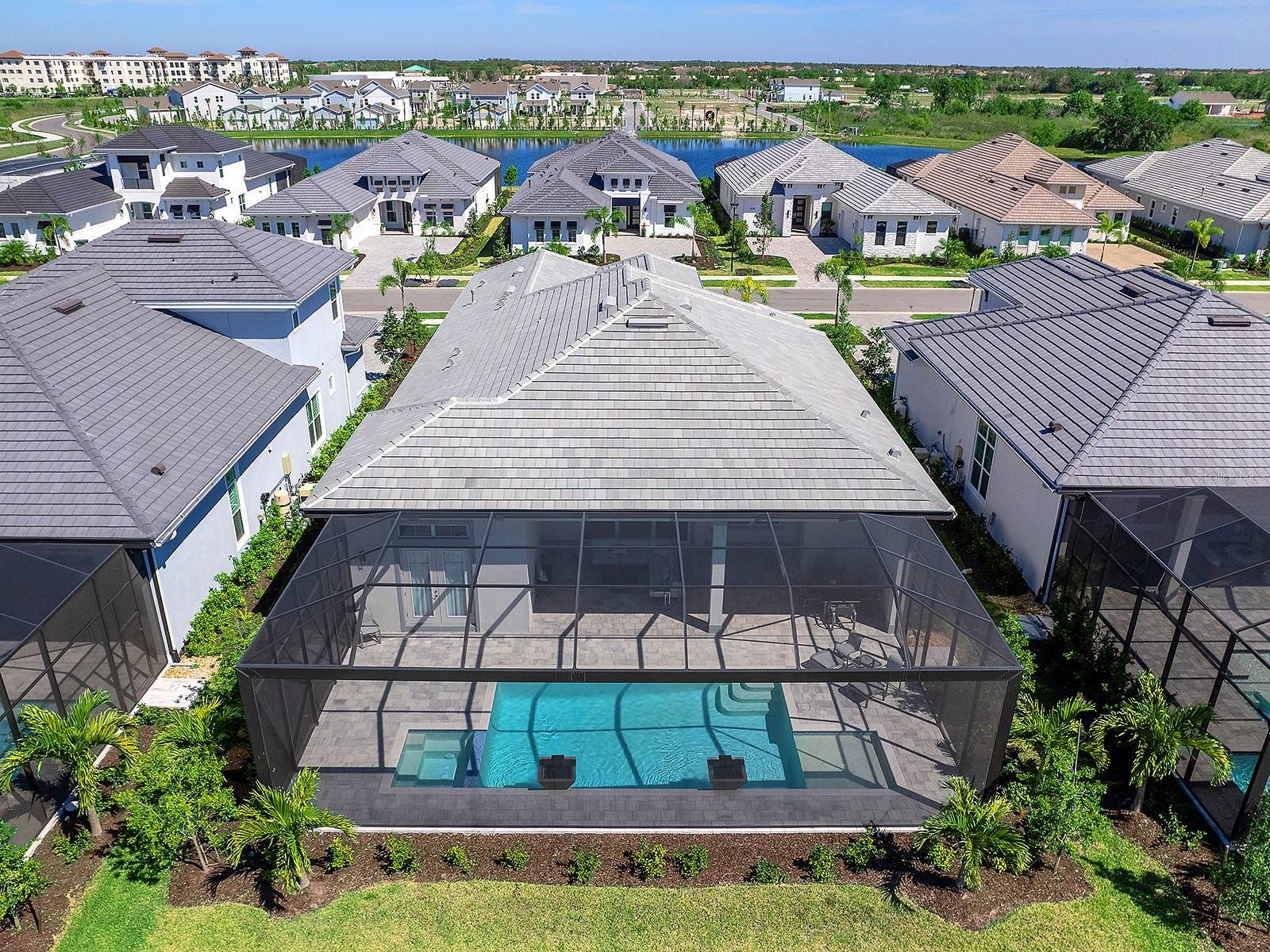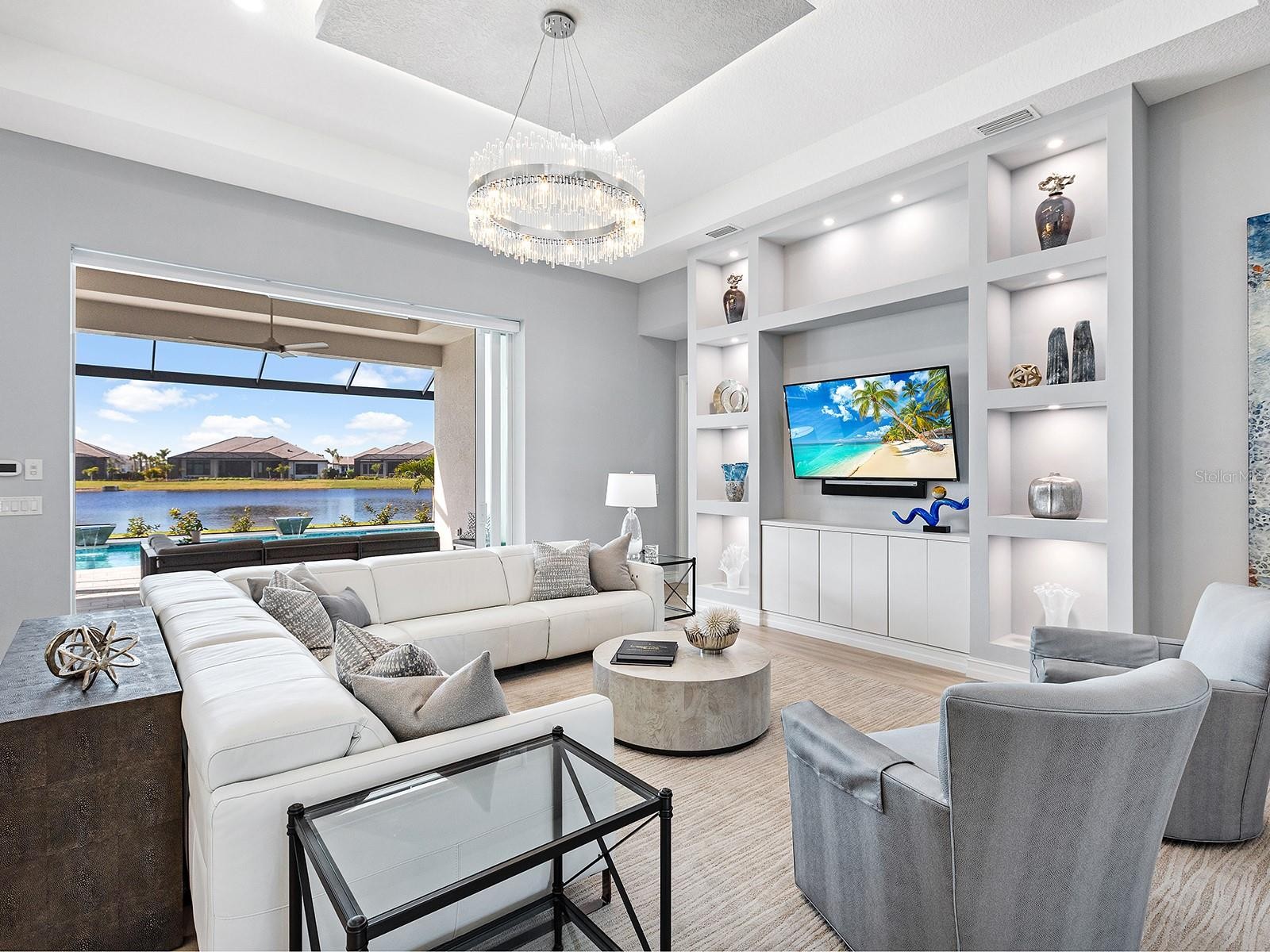This home offers an exquisite blend of coastal elegance and modern functionality, this maintenance-free home is set against the serene lake with a stunning fountain view. An oversized paver driveway leads to the home’s inviting coastal elevation, enhanced by professionally designed landscaping, coach lighting and decorative shutters that accentuate the entrance. Impact glass throughout ensures peace of mind, while wide plank wood-look tile floors bring style to the main living spaces. Stepping through the custom Aquatek® glass front door with an iron frame, the foyer welcomes with a tray ceiling and designer chandelier. The open concept blends the main living areas, creating an ideal layout. An illuminated floating tray ceiling with custom trim adds ambiance to the living room while the wall of pocketing sliders leads to the lanai. The dry bar, situated between the living and dining area, features glass upper cabinets, quartz countertops, a beverage cooler, and a tile backsplash. Custom-trimmed walls define the dining area, with plenty of space for entertaining. The kitchen is a dream, boasting quartz countertops, a spacious floating island with seating and storage, stainless steel KitchenAid appliances including a five-burner gas cooktop, and a glass-front corner cabinet. Soft-close cabinetry, a pantry cabinet with pullout shelving and a large window with remote blinds complete the space. The primary suite is a retreat with a tray ceiling with a designer chandelier, two custom walk-in closets and French doors opening to the lanai. The en-suite bath is an oasis, featuring a free-standing soaking tub, an expansive walk-in shower with designer tile flooring, a private water closet and a double-sink vanity with quartz countertops. Three additional guest bedrooms provide ample accommodations, with one offering an en-suite bath and the others sharing a well-appointed bath with a walk-in shower and custom vanity. French doors open to a refined office space with a picture window, tray ceiling and beautiful chandelier. Designed for relaxation, the outdoor space is unparalleled. The enormous paver lanai is complete with a covered living and dining area under a tray ceiling with recessed lighting. A beautiful outdoor kitchen was just installed, ready for alfresco dining with a view. Plumbed for an outdoor fireplace. The resort-style pool includes sunken spa, fountain bowls, a panoramic screen for uninterrupted lake views and a sun shelf for lounging. A dedicated pool bath adds convenience. Additional highlights include a recirculating hot water system, laundry room with white cabinetry and subway tile backsplash, a three-car garage with epoxy flooring, and a powder room with a pedestal sink and lighted mirror. or added peace of mind, the home includes a security system with five exterior cameras that convey. Wild Blue offers a resort-style clubhouse with concierge service, theater, fitness studio, golf simulator, billiards, and a pool complex with two resort pools, plus a restaurant and patio bar coming soon. Residents enjoy walking trails, a yoga lawn, putting green, and the Midway Sports Complex with 8 pickleball courts, 6 tennis courts, and a pro shop. A dog park and playground add to the appeal, all ideally located near The Mall at UTC, Lakewood Ranch Main Street, and Waterside Place.