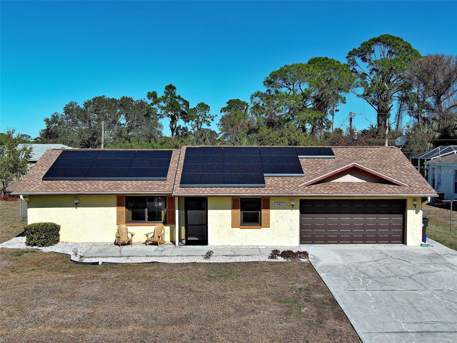 Welcome to this well-maintained, one-owner 2-bedroom, 2-bath home with a 2-car garage and pool, set on nearly half an acre in a QUIET North Port neighborhood. A BRAND-NEW ROOF, SOLAR PANELS, SOLAR WATER HEATER, AND BRAND-NEW GARAGE DOOR add exceptional energy efficiency and long-term value, while the home’s thoughtful layout offers comfort and flexibility. As you enter, vaulted ceilings and abundant natural light create an open, airy main living space. The casual living area flows into a modest dining area, ideal for everyday meals or relaxed entertaining. Just off the kitchen is a charming breakfast nook with a bay window, offering peaceful views of the pool. The kitchen features newer cabinetry and countertops, along with a newer dishwasher and microwave. A spacious laundry room is conveniently located off the breakfast nook. The split-bedroom floor plan provides privacy for owners and guests alike. Both bedrooms feature walk-in closets and BRAND-NEW LAMINATE FLOORING. Updated, HURRICANE-GRADE WINDOWS enhance comfort and efficiency throughout the home. STEP OUTSIDE TO A LARGE POOL, enjoyed from a spacious covered patio overlooking the pool. The outdoor area also features a NEWER POOL SCREEN and mature hedges that provide added privacy. Additional exterior highlights include a private outdoor shower, a dog run just off the patio, and a shed for extra storage. The property is served by CITY WATER and includes an additional lot directly behind the home, offering future possibilities and added space. Located with easy access to I-75, shopping, dining, and everyday conveniences, this home is well-suited as a primary residence, seasonal retreat, or investment opportunity.