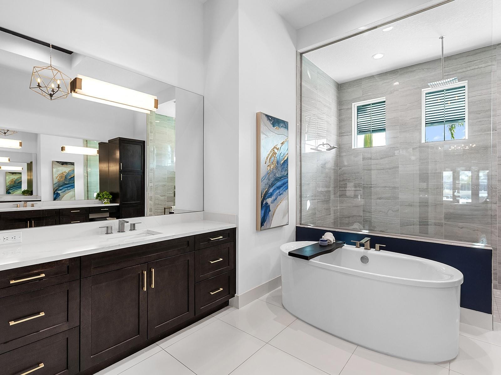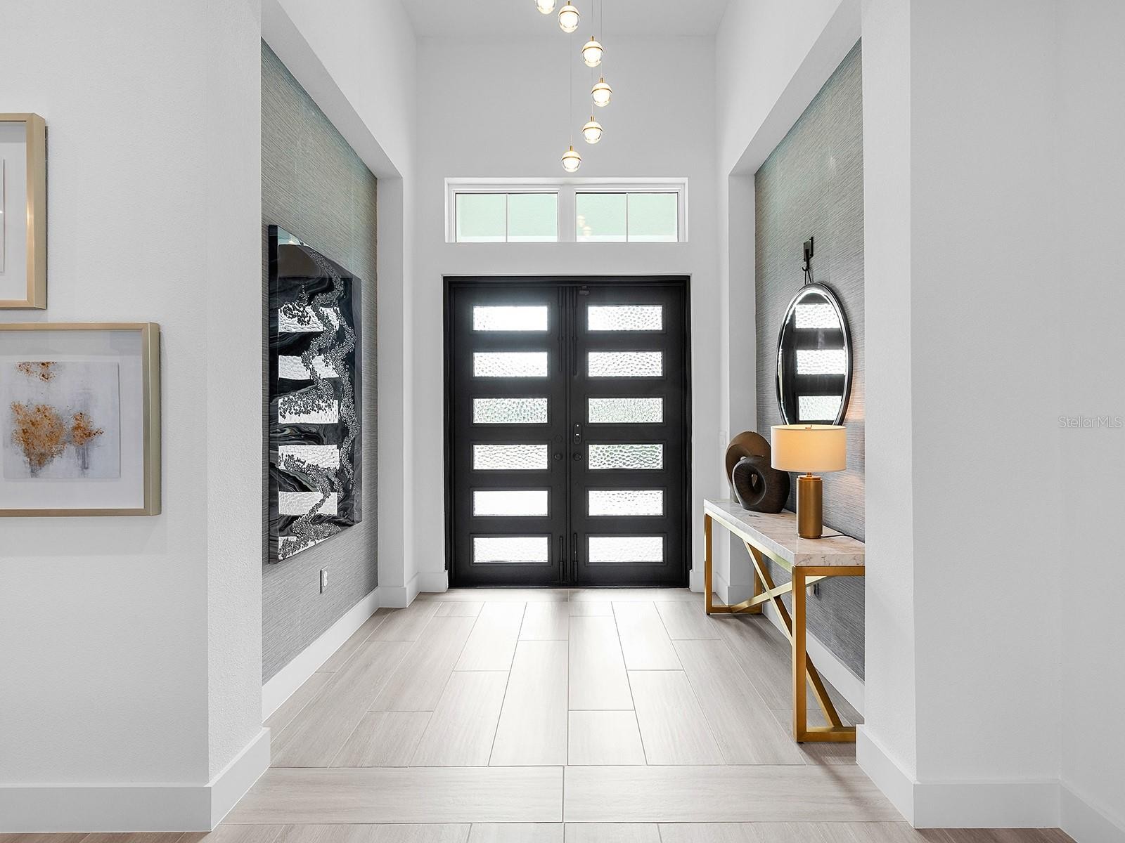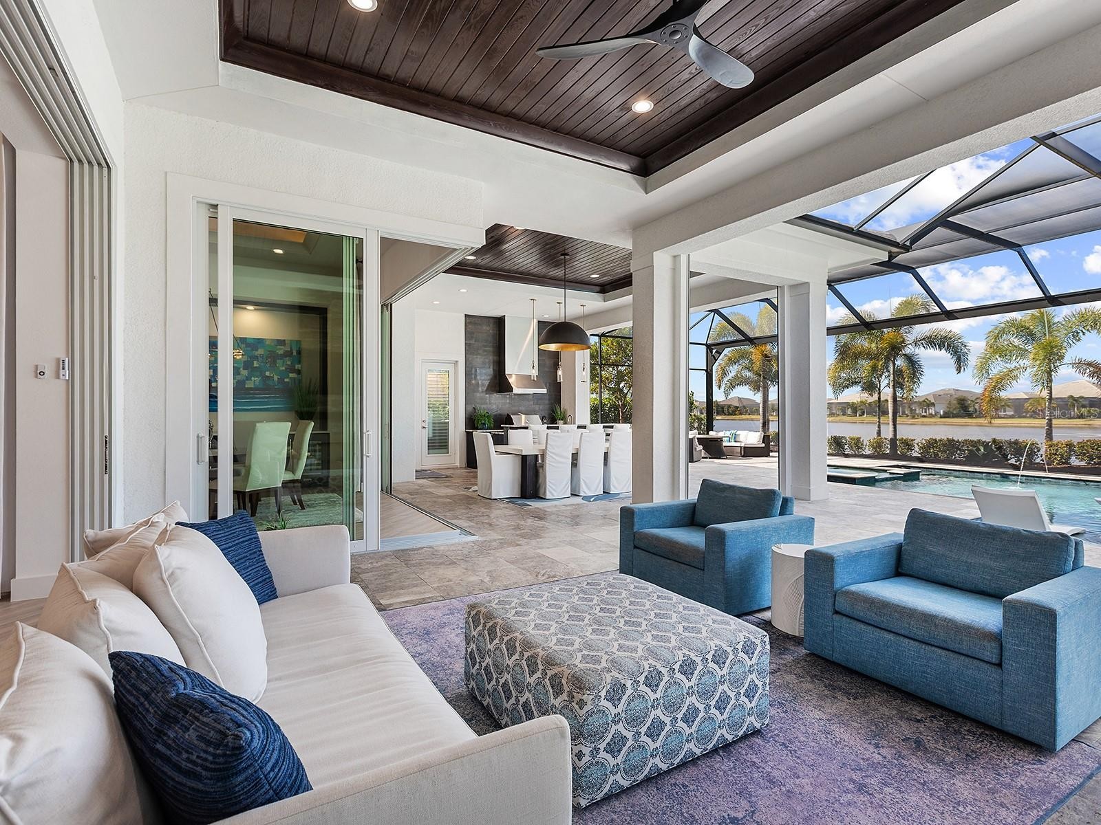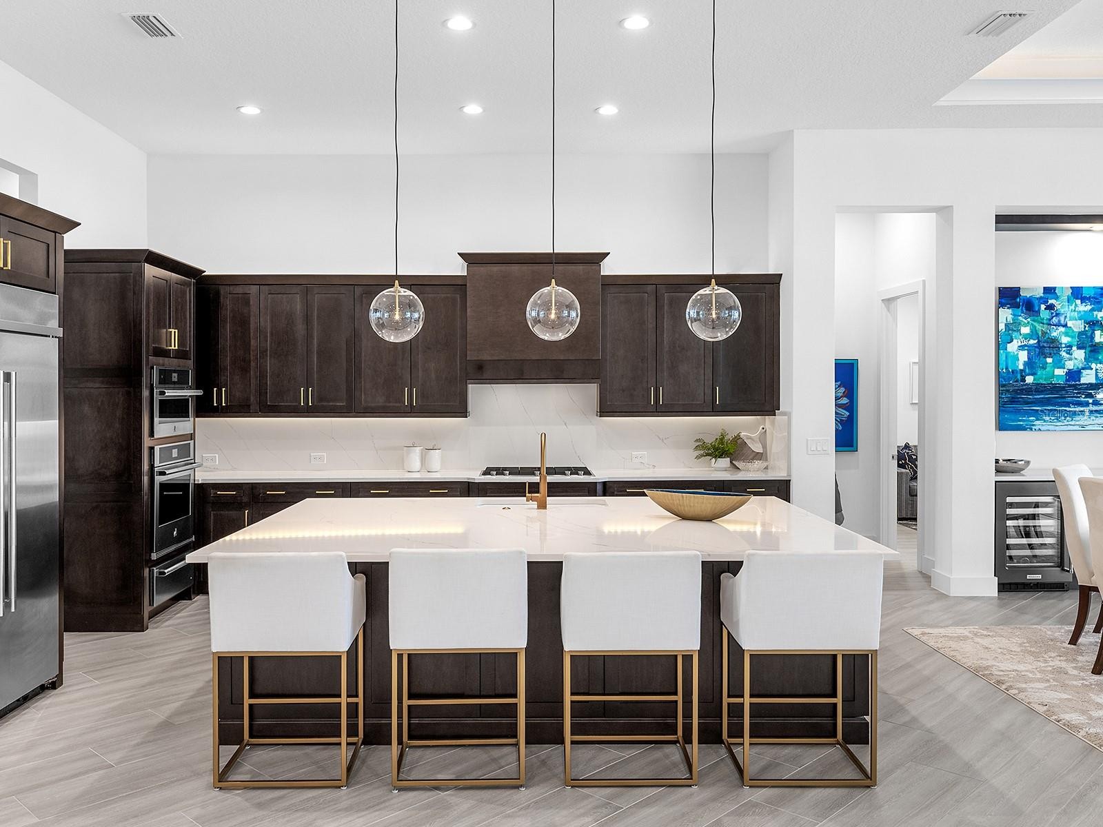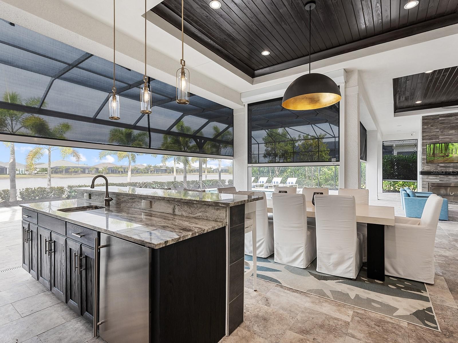 Positioned within prestigious The Lake Club at Lakewood Ranch, this 2022-built residence exemplifies refined modern coastal architecture, featuring 3 en-suite bedrooms, a bonus room (easily suitable as a fourth en-suite bedroom), and 4 full baths plus one custom-designed half bath. Notable elements include soaring ceiling heights with a variety of custom trim work, impact glass, two HVAC units, and 2 Nest thermostats, a 24KVA whole-home Generac generator, whole-house surge protection, Storm Smart remote hurricane screens, security systems, and a Kinetico water softening and filtration system with instant hot water. Lush landscaping with integrated lighting and a paver driveway frames the home’s elevation. The entry features contemporary iron doors showcasing twelve textured privacy glass panels, blending modern design with functional beauty. Transom windows above introduce additional natural light, while a designer chandelier and large-format tile plank flooring define the foyer. The great room centers on a statement chandelier, a custom-built media wall, and pocketing sliders that extend the living space to the lanai. The kitchen features espresso cabinetry with brass hardware, quartz countertops with a quartz backsplash, and Jenn-Air appliances, including a five-burner gas cooktop, wall oven, wall convection/microwave combo, a warming drawer, refrigerator, and dishwasher. Pull-out drawers, upper and undermount cabinet lighting, and a generous island with seating complete the space. A custom pantry with shelving and pull-outs provides more organization. The dining area continues the open layout with zero-corner pocketing sliders and a feature wall with built-in cabinetry and two wine coolers. The private office is enclosed by pocketing glass French doors and positioned to capture natural light through a picture window. The half bath is elegantly styled with a mirror flanked by Restoration Hardware sconces, designer wallpaper, a custom glass-top sink, gold accents, and a contemporary floating vanity and tile plank flooring. A custom-designed bonus room with built-in shelving and cabinetry offers flexible use, including the option for a fourth bedroom, and features a private en-suite bath that also serves as a pool bath. The grand primary suite is privately positioned with glass French doors opening to the lanai, stunning water views, and two walk-in closets with custom built-ins. The en-suite bath features two vanities, a freestanding tub, and a seamless-glass walk-in shower with floor-to-ceiling tile and rain and regular shower heads. Outdoor living is anchored by a covered lanai with tongue-and-groove ceilings and designer lighting. A fully equipped outdoor kitchen with granite countertops, custom cabinetry, and bar seating complements the space, while a sleek gas fireplace with a contemporary surround anchors the living area, seamlessly extending to an open and spacious lounge area. A heated saltwater pool and spa are positioned behind a panoramic screen that frames western sunset and lake views. The well-appointed laundry room is near the 3-car garage, with epoxy floors and a motorized ceiling-mounted storage rack that lowers at the push of a button for effortless access. Residents of The Lake Club enjoy access to tennis and pickleball courts, resort-style pools, clubhouse dining, a dog park, playground, and recreational amenities. The location also offers easy access to Waterside Place, UTC Mall, the new Mote Aquarium, and beaches.