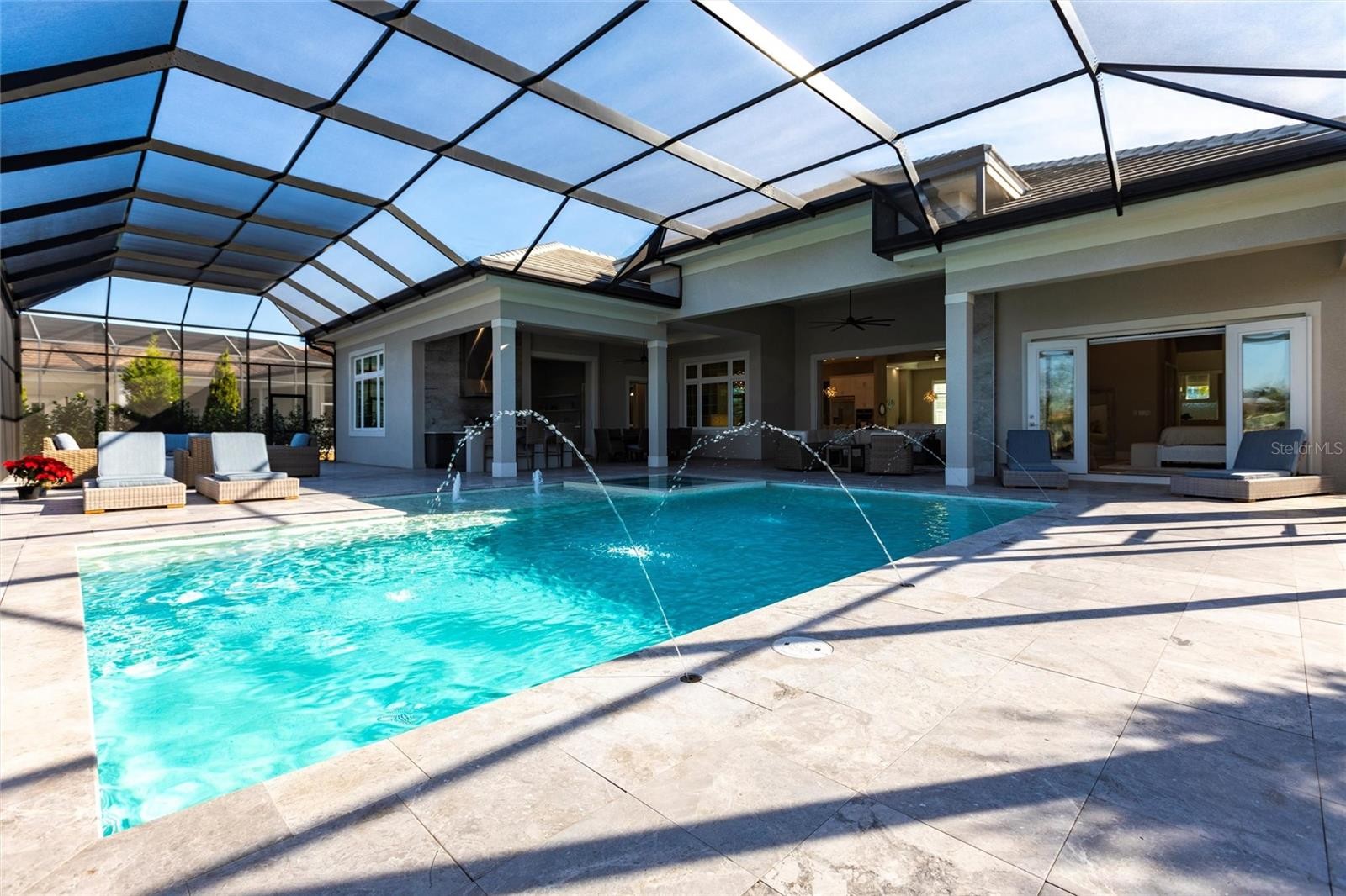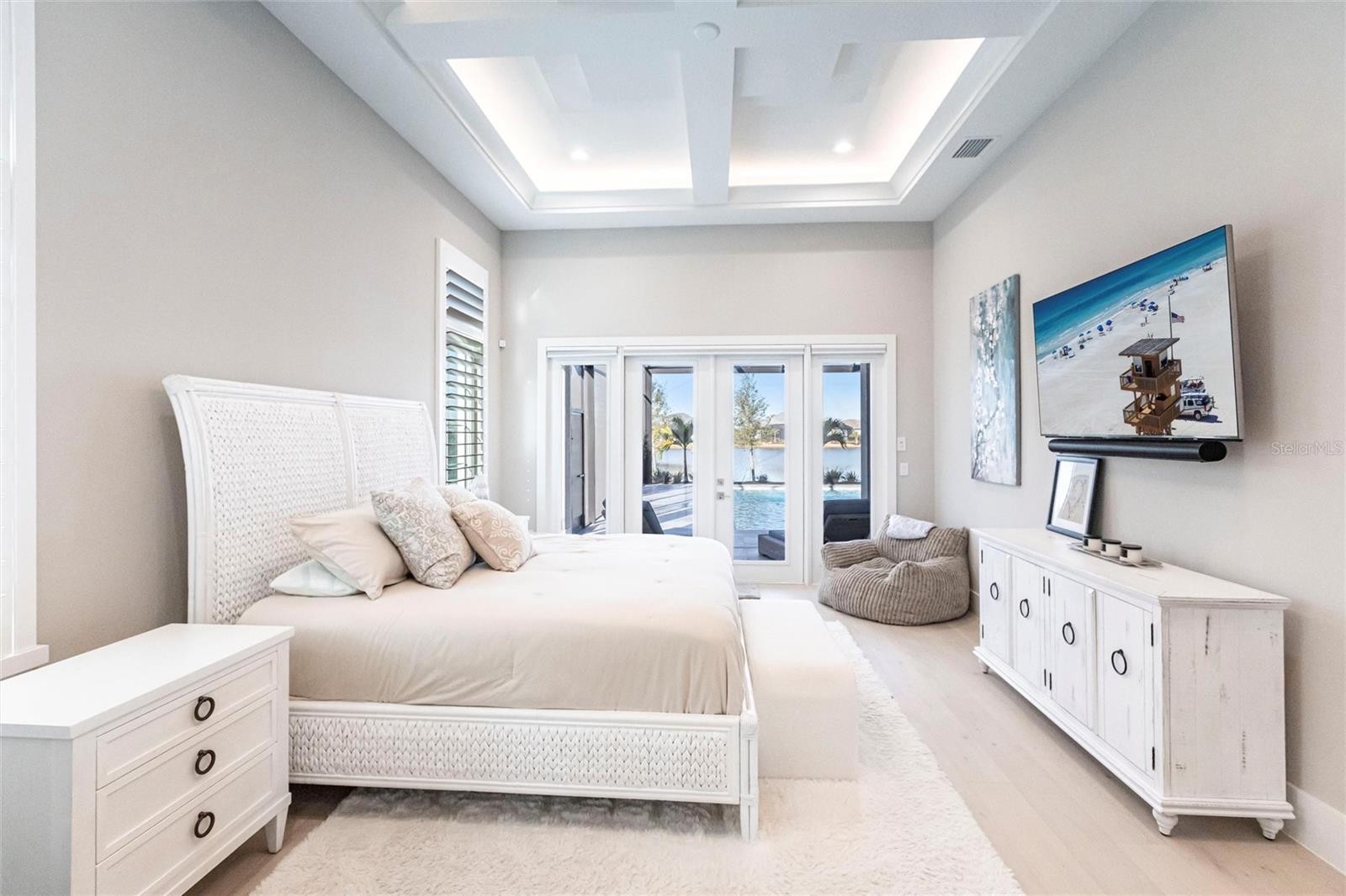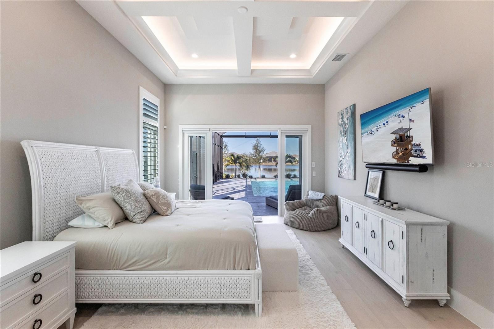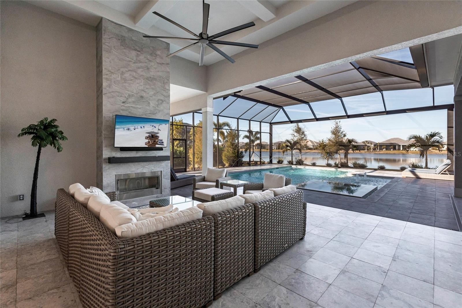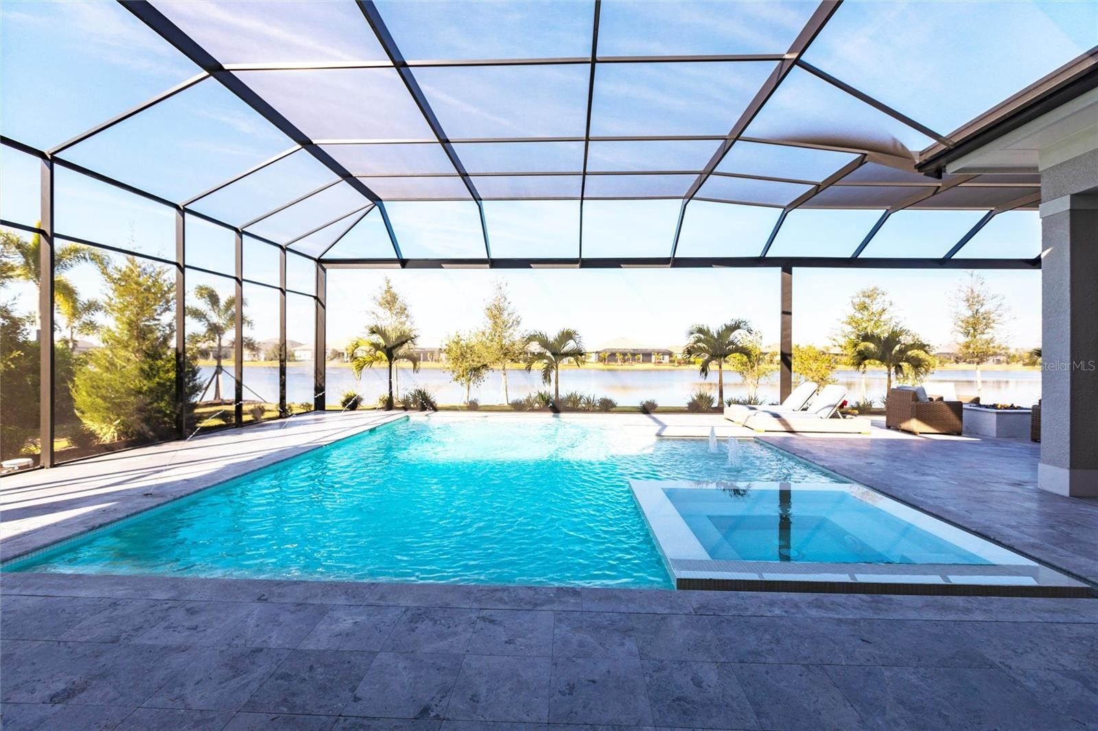 Experience refined Florida living in this nearly brand-new 2024 Stock Home, beautifully positioned to capture stunning full lake views and designed for effortless indoor-outdoor living. This exceptional residence offers an open split-floor plan, soaring ceilings, and designer finishes throughout, creating a bright, elegant, and inviting atmosphere from the moment you enter. Spanning 3,936 sq. ft. of living space (over 5,800 sq. ft. total), the home features 3 bedrooms, 4.5 baths, a private den, formal dining room, and an expansive bonus room—ideal as a media lounge, game room, home gym, or guest retreat. The heart of the home is a chef-inspired kitchen with an oversized island, premium appliances, abundant cabinetry, and seamless flow into the spectacular great room, where 15-foot coffered ceilings and 10-foot pocket sliding doors frame sweeping water views. The primary suite is a serene retreat with direct lanai access, a spa-style bath with soaking tub and walk-in shower, and dual custom walk-in closets. Two additional guest suites each offer private ensuite baths and generous closet space. Show-Stopping Outdoor Living: The oversized, resort-style lanai with gorgeous sunset views is truly one of the home’s standout features—one of the largest in the community—complete with heated saltwater pool & spa, glass fireplace for year-round ambiance, fully equipped summer kitchen, firepit with panoramic lake views, ample covered seating and entertainment space for unforgettable gatherings. Other Premium Upgrades & Comfort Features: * impact windows * Hunter-Douglas powered shades * engineered hardwood flooring * water softener * hot water recirculation system * whole-house surge protection * plantation shutters * gas water heater * irrigation system * advanced security provide both luxury and peace of mind. Located in one of Lakewood Ranch’s most prestigious gated communities, residents enjoy access to a grand clubhouse, spa, fitness center, resort pools, tennis courts, and concierge-style amenities. Furniture is negotiable—move in with ease and start enjoying the Florida lifestyle immediately.