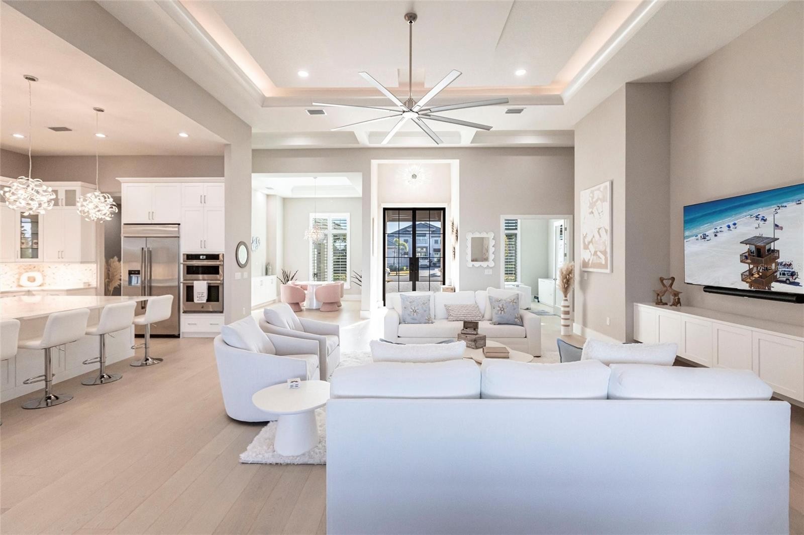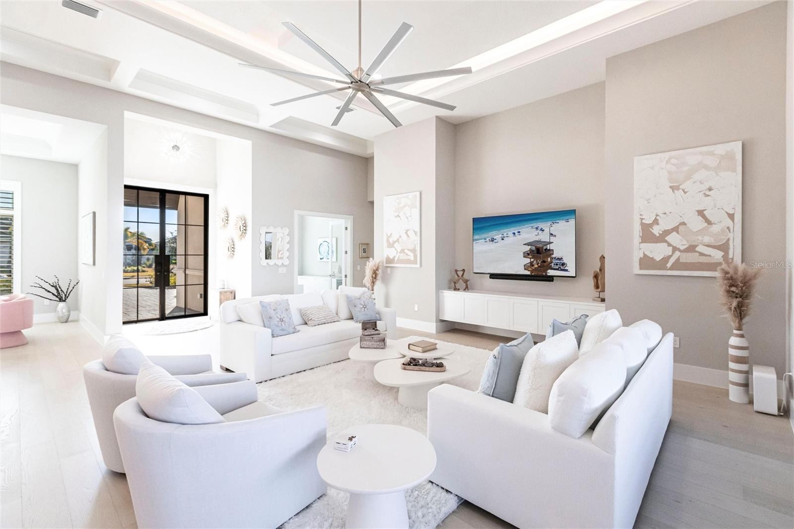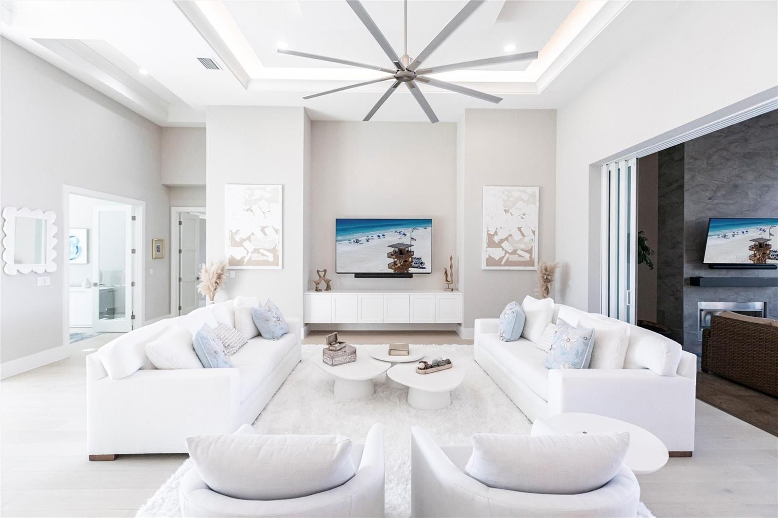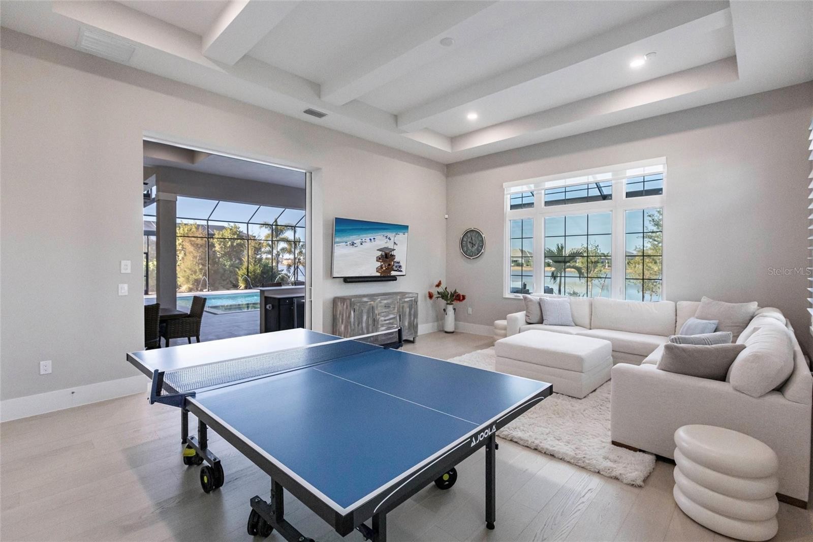Experience refined Florida living in this nearly brand-new 2024 Stock Home, beautifully positioned to capture stunning full lake views and designed for effortless indoor-outdoor living. This exceptional residence offers an open split-floor plan, soaring ceilings, and designer finishes throughout, creating a bright, elegant, and inviting atmosphere from the moment you enter. Spanning 3,936 sq. ft. of living space (over 5,800 sq. ft. total), the home features 3 bedrooms, 4.5 baths, a private den, formal dining room, and an expansive bonus room—ideal as a media lounge, game room, home gym, or guest retreat. The heart of the home is a chef-inspired kitchen with an oversized island, premium appliances, abundant cabinetry, and seamless flow into the spectacular great room, where 15-foot coffered ceilings and 10-foot pocket sliding doors frame sweeping water views. The primary suite is a serene retreat with direct lanai access, a spa-style bath with soaking tub and walk-in shower, and dual custom walk-in closets. Two additional guest suites each offer private ensuite baths and generous closet space. Show-Stopping Outdoor Living: The oversized, resort-style lanai with gorgeous sunset views is truly one of the home’s standout features—one of the largest in the community—complete with heated saltwater pool & spa, glass fireplace for year-round ambiance, fully equipped summer kitchen, firepit with panoramic lake views, ample covered seating and entertainment space for unforgettable gatherings. Other Premium Upgrades & Comfort Features: * impact windows * Hunter-Douglas powered shades * engineered hardwood flooring * water softener * hot water recirculation system * whole-house surge protection * plantation shutters * gas water heater * irrigation system * advanced security provide both luxury and peace of mind. Located in one of Lakewood Ranch’s most prestigious gated communities, residents enjoy access to a grand clubhouse, spa, fitness center, resort pools, tennis courts, and concierge-style amenities. Furniture is negotiable—move in with ease and start enjoying the Florida lifestyle immediately.