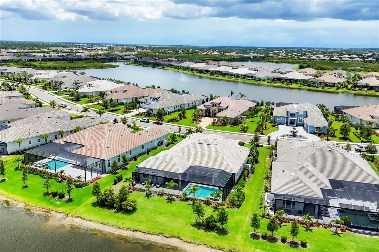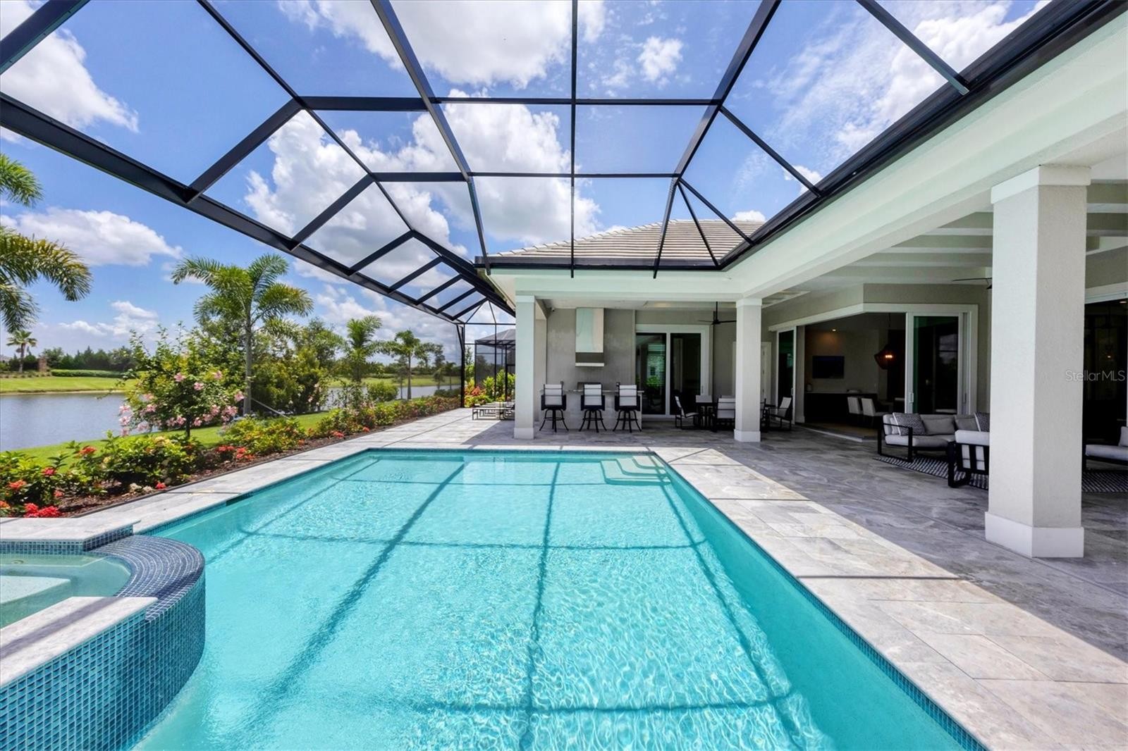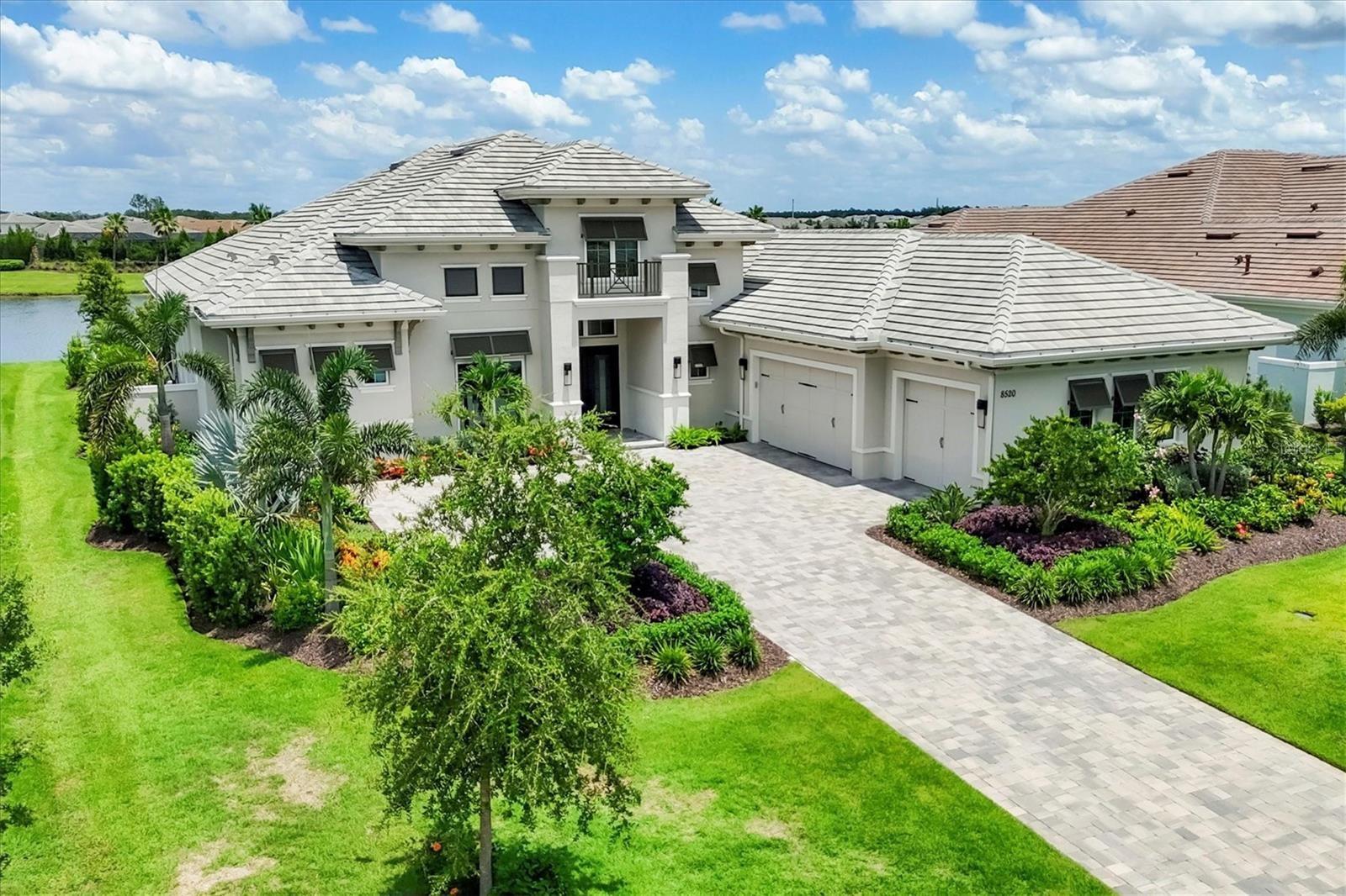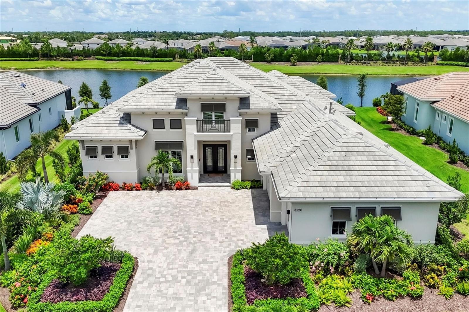 Welcome to the stunning Gardenia II model by Stock Signature Homes—where luxury meets livability in this impeccably designed four-bedroom, 4.5-bath residence. On a prime lot with expansive water views and no rear neighbors, this home is a private tropical retreat from the moment you arrive. A paver driveway and lush, manicured landscaping set the tone for what awaits inside. Go through elegant glass double doors into a bright, open-concept floorplan filled with natural light. Soaring ceilings, crown molding, neutral white oak engineered hardwood flooring and designer finishes—including plantation shutters and tasteful draperies—create a warm and elevated atmosphere throughout. The spacious great room features a coffered ceiling, built-in shelving and sleek floating shelves, ideal for entertaining or relaxing in style. The gourmet kitchen is a chef’s dream, with quartz countertops, soft-close white cabinetry, under-cabinet lighting, a large island with abundant storage, walk-in pantry and JennAir stainless steel appliances. The formal dining room just off the kitchen includes a dry bar with wine cooler and overlooks the serene pool area. Outdoor living is taken to the next level with an expansive travertine lanai, panoramic screens for uninterrupted water views, a saltwater pool and spa, and multiple covered spaces for lounging and dining. Entertain with ease at the outdoor kitchen—complete with grill, sink, beverage cooler and a large island—or gather around the cozy outdoor gas fireplace. The luxurious primary suite is a tranquil escape with double tray ceilings, dual walk-in closets with built-in organizers, private lanai access and a spa-like en-suite bath featuring dual vanities, quartz countertops, a free-standing soaking tub, large walk-in shower and abundant storage. Each of the three additional bedrooms includes its en-suite bath for comfort, as well as closets with custom organizers designed to maximize storage space. A bonus room with ceiling beams and sliding doors to the lanai offers versatility as a media room, gym or fifth bedroom. A light-filled den with French doors and tray ceiling provides a work-from-home space. Additional highlights include a powder room, a well-equipped laundry room with ample cabinetry and counter space, and a side-turned three-car garage with extensive cabinetry. The state-of-the-art Control4 system seamlessly integrates the home’s audio/visual features, lighting and security cameras—offering effortless smart home control at your fingertips. With hurricane impact windows and doors throughout, this exquisite home offers peace of mind and timeless sophistication. In The Lake Club there is an impressive 20,000-square-foot Grande Clubhouse, a hub of luxury amenities. Enjoy two pools, including a zero-entry pool with splash park, ideal for family fun. Indulge in poolside dining and unwind at the spa and fitness center offering guided workout classes, massages and facials by on-staff aestheticians. Sports enthusiasts will appreciate the tennis and pickleball courts with expert racquet pros available. Experience a vibrant social scene with a calendar filled with events. Inside the Grande Clubhouse, relax with billiards, pool tables, televisions and game and card tables for various entertainment options. Don’t miss the opportunity to experience luxurious lakefront living at its finest.
