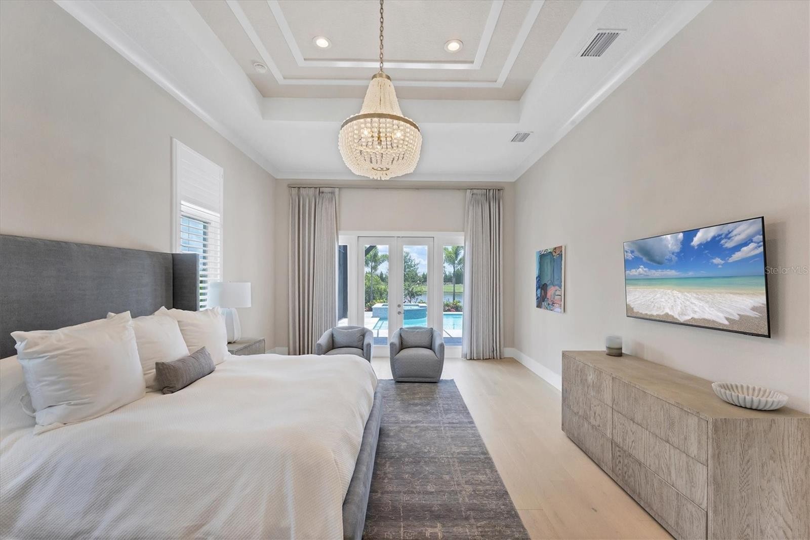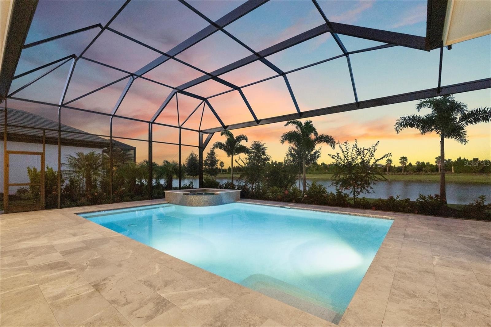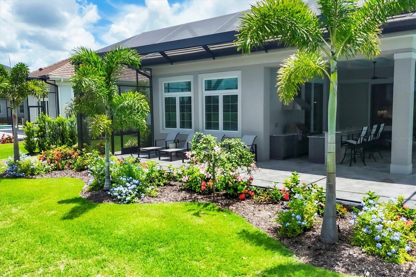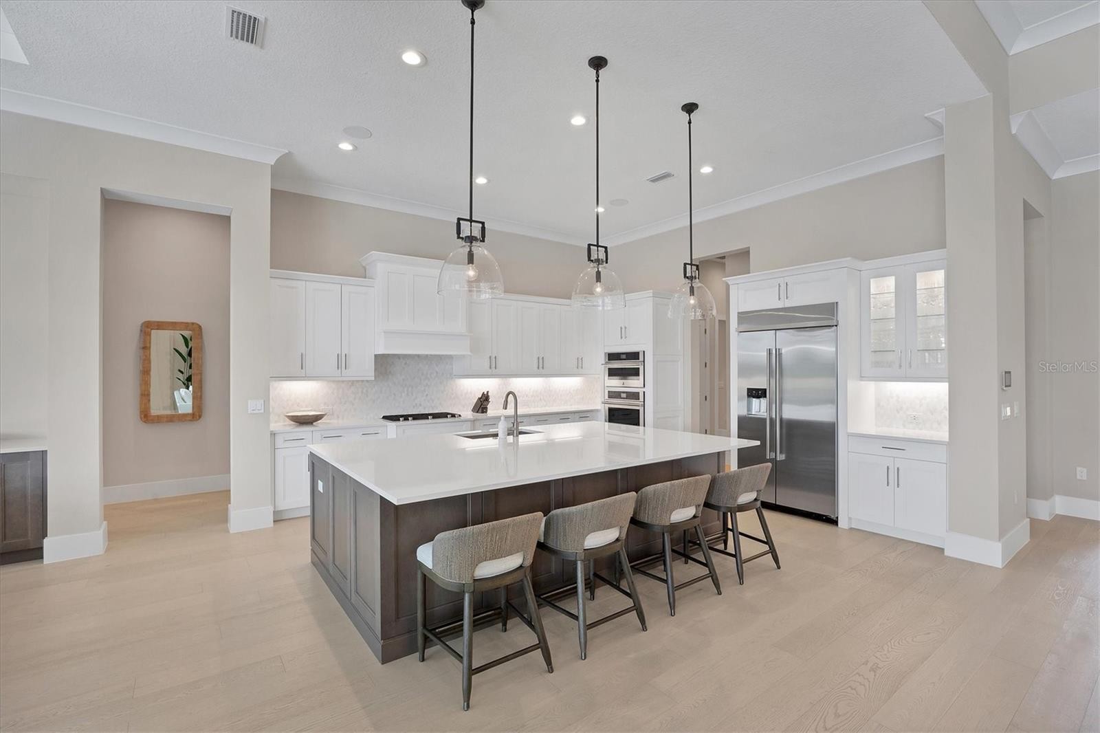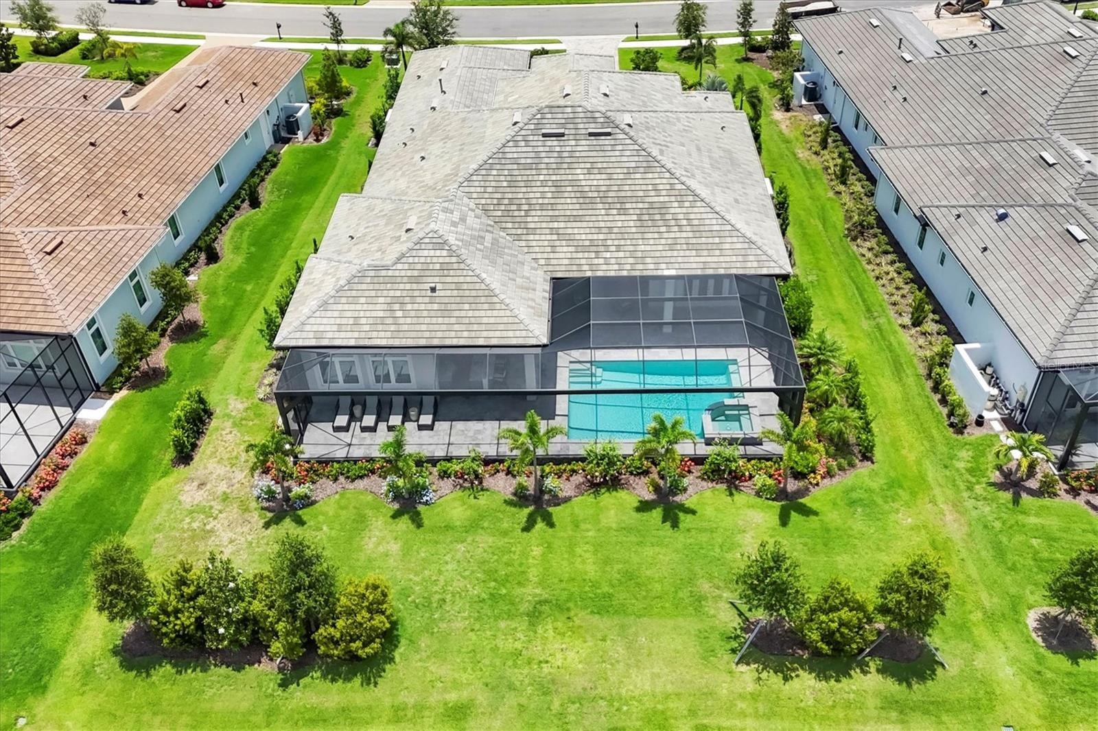 Welcome to the stunning Gardenia II model by Stock Signature Homes—where luxury meets livability in this impeccably designed four-bedroom, 4.5-bath residence. On a prime lot with expansive water views and no rear neighbors, this home is a private tropical retreat from the moment you arrive. A paver driveway and lush, manicured landscaping set the tone for what awaits inside. Go through elegant glass double doors into a bright, open-concept floorplan filled with natural light. Soaring ceilings, crown molding, neutral white oak engineered hardwood flooring and designer finishes—including plantation shutters and tasteful draperies—create a warm and elevated atmosphere throughout. The spacious great room features a coffered ceiling, built-in shelving and sleek floating shelves, ideal for entertaining or relaxing in style. The gourmet kitchen is a chef’s dream, with quartz countertops, soft-close white cabinetry, under-cabinet lighting, a large island with abundant storage, walk-in pantry and JennAir stainless steel appliances. The formal dining room just off the kitchen includes a dry bar with wine cooler and overlooks the serene pool area. Outdoor living is taken to the next level with an expansive travertine lanai, panoramic screens for uninterrupted water views, a saltwater pool and spa, and multiple covered spaces for lounging and dining. Entertain with ease at the outdoor kitchen—complete with grill, sink, beverage cooler and a large island—or gather around the cozy outdoor gas fireplace. The luxurious primary suite is a tranquil escape with double tray ceilings, dual walk-in closets with built-in organizers, private lanai access and a spa-like en-suite bath featuring dual vanities, quartz countertops, a free-standing soaking tub, large walk-in shower and abundant storage. Each of the three additional bedrooms includes its en-suite bath for comfort, as well as closets with custom organizers designed to maximize storage space. A bonus room with ceiling beams and sliding doors to the lanai offers versatility as a media room, gym or fifth bedroom. A light-filled den with French doors and tray ceiling provides a work-from-home space. Additional highlights include a powder room, a well-equipped laundry room with ample cabinetry and counter space, and a side-turned three-car garage with extensive cabinetry. The state-of-the-art Control4 system seamlessly integrates the home’s audio/visual features, lighting and security cameras—offering effortless smart home control at your fingertips. With hurricane impact windows and doors throughout, this exquisite home offers peace of mind and timeless sophistication. In The Lake Club there is an impressive 20,000-square-foot Grande Clubhouse, a hub of luxury amenities. Enjoy two pools, including a zero-entry pool with splash park, ideal for family fun. Indulge in poolside dining and unwind at the spa and fitness center offering guided workout classes, massages and facials by on-staff aestheticians. Sports enthusiasts will appreciate the tennis and pickleball courts with expert racquet pros available. Experience a vibrant social scene with a calendar filled with events. Inside the Grande Clubhouse, relax with billiards, pool tables, televisions and game and card tables for various entertainment options. Don’t miss the opportunity to experience luxurious lakefront living at its finest.
