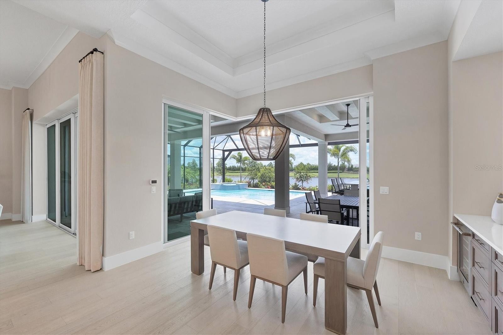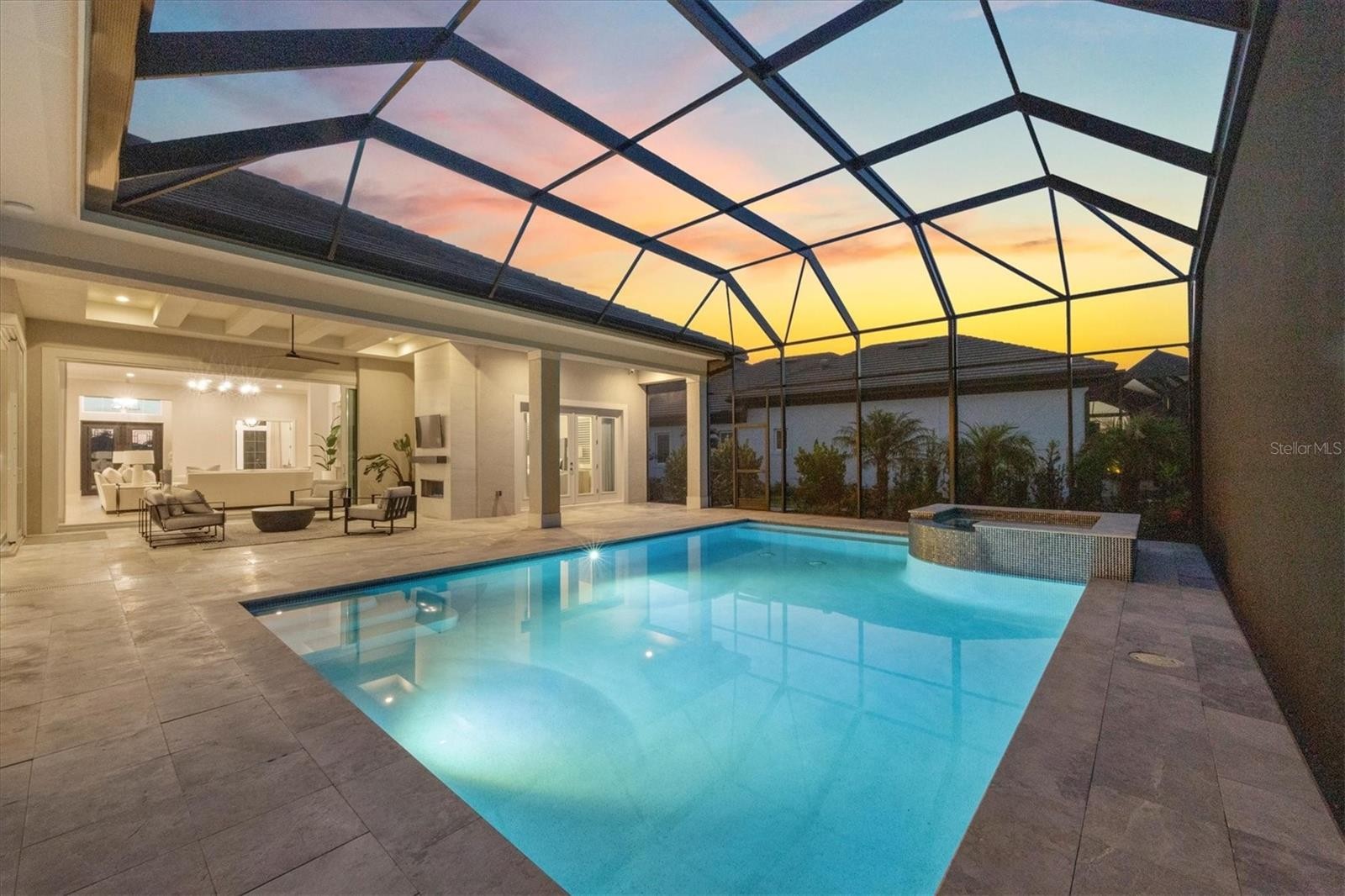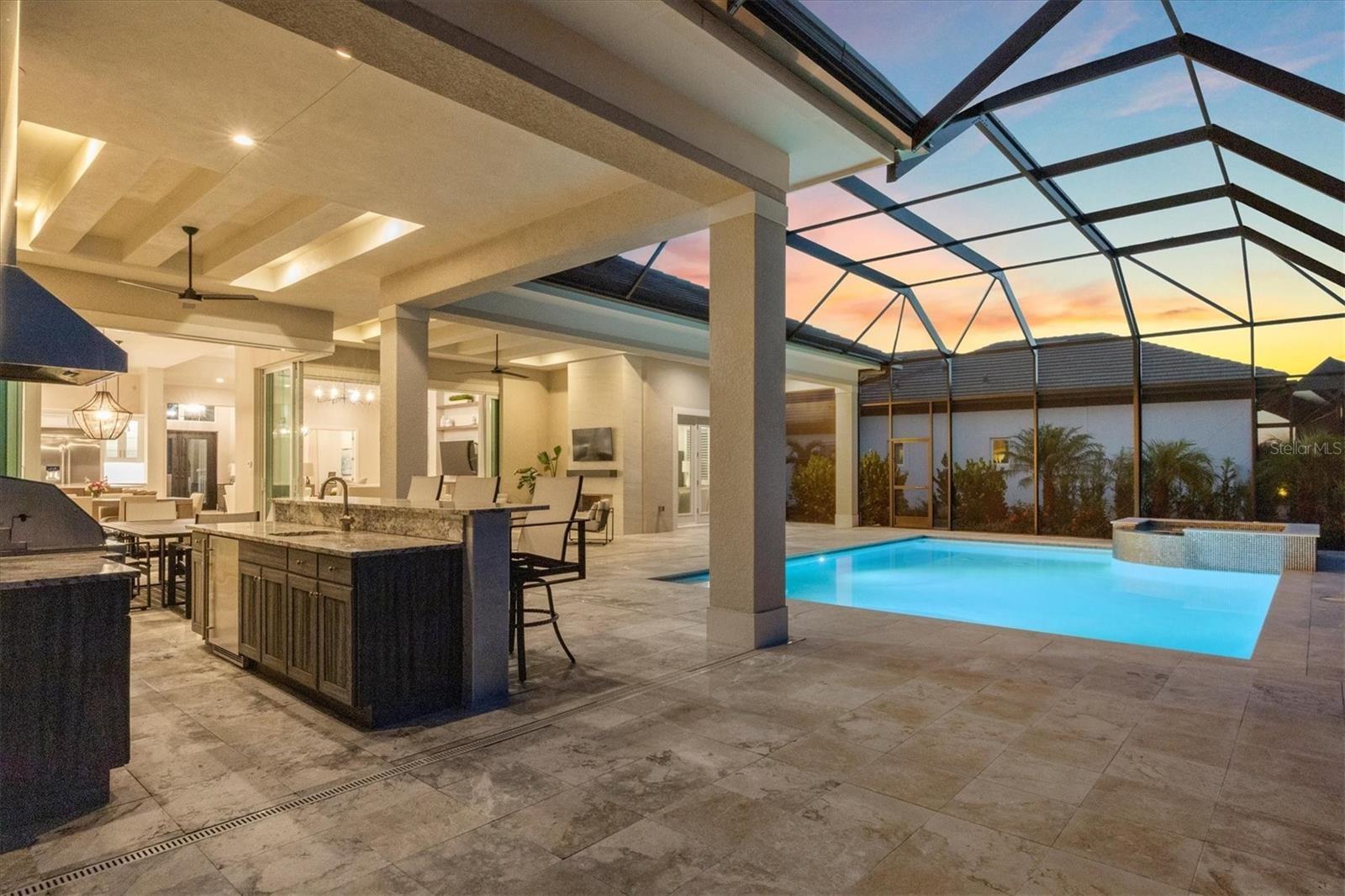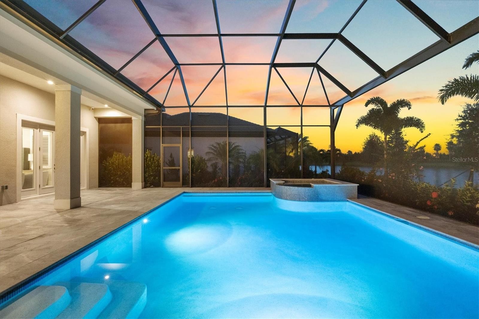 Welcome to the stunning Gardenia II model by Stock Signature Homes—where luxury meets livability in this impeccably designed four-bedroom, 4.5-bath residence. On a prime lot with expansive water views and no rear neighbors, this home is a private tropical retreat from the moment you arrive. A paver driveway and lush, manicured landscaping set the tone for what awaits inside. Go through elegant glass double doors into a bright, open-concept floorplan filled with natural light. Soaring ceilings, crown molding, neutral white oak engineered hardwood flooring and designer finishes—including plantation shutters and tasteful draperies—create a warm and elevated atmosphere throughout. The spacious great room features a coffered ceiling, built-in shelving and sleek floating shelves, ideal for entertaining or relaxing in style. The gourmet kitchen is a chef’s dream, with quartz countertops, soft-close white cabinetry, under-cabinet lighting, a large island with abundant storage, walk-in pantry and JennAir stainless steel appliances. The formal dining room just off the kitchen includes a dry bar with wine cooler and overlooks the serene pool area. Outdoor living is taken to the next level with an expansive travertine lanai, panoramic screens for uninterrupted water views, a saltwater pool and spa, and multiple covered spaces for lounging and dining. Entertain with ease at the outdoor kitchen—complete with grill, sink, beverage cooler and a large island—or gather around the cozy outdoor gas fireplace. The luxurious primary suite is a tranquil escape with double tray ceilings, dual walk-in closets with built-in organizers, private lanai access and a spa-like en-suite bath featuring dual vanities, quartz countertops, a free-standing soaking tub, large walk-in shower and abundant storage. Each of the three additional bedrooms includes its en-suite bath for comfort, as well as closets with custom organizers designed to maximize storage space. A bonus room with ceiling beams and sliding doors to the lanai offers versatility as a media room, gym or fifth bedroom. A light-filled den with French doors and tray ceiling provides a work-from-home space. Additional highlights include a powder room, a well-equipped laundry room with ample cabinetry and counter space, and a side-turned three-car garage with extensive cabinetry. The state-of-the-art Control4 system seamlessly integrates the home’s audio/visual features, lighting and security cameras—offering effortless smart home control at your fingertips. With hurricane impact windows and doors throughout, this exquisite home offers peace of mind and timeless sophistication. In The Lake Club there is an impressive 20,000-square-foot Grande Clubhouse, a hub of luxury amenities. Enjoy two pools, including a zero-entry pool with splash park, ideal for family fun. Indulge in poolside dining and unwind at the spa and fitness center offering guided workout classes, massages and facials by on-staff aestheticians. Sports enthusiasts will appreciate the tennis and pickleball courts with expert racquet pros available. Experience a vibrant social scene with a calendar filled with events. Inside the Grande Clubhouse, relax with billiards, pool tables, televisions and game and card tables for various entertainment options. Don’t miss the opportunity to experience luxurious lakefront living at its finest.