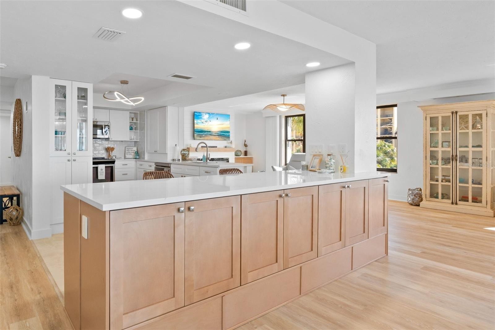 Rarely available at Hidden Lagoon Beach Club, this exceptional turnkey furnished residence offers breathtaking panoramic gulf views from nearly every angle. Wake to the sound of gentle waves, savor the serenity of a secluded beach, and unwind with unforgettable sunset skies - this is coastal living at its finest. Beautifully furnished and thoughtfully renovated, the expansive 2,730-square-foot condo features an expertly redesigned eat-in kitchen and an open-concept floor plan that maximizes both space and natural light. Custom built-in cabinetry frames a striking shiplap accent wall with an inviting electric fireplace, mantel, and TV - perfect for those relaxed evenings. The home includes two generously sized primary suites, each with updated en-suite baths and large walk-in closets equipped with custom organizer systems. Neutral luxury vinyl plank and tile flooring run throughout, creating a clean, coastal elegance. Offered turnkey furnished, excluding personal items, and complemented by an oversized private two-car garage - a rare and valuable bonus. Hidden Lagoon Beach Club is an intimate, gated community of just 24 residences, ideal for those seeking privacy away from the crowds. Amenities include a heated pool with lockers, tennis court, basketball hoop, kayak/canoe launch, tranquil lagoon views, and a charming butterfly garden, along with private gated beach access. Conveniently located just minutes from Siesta Key’s renowned dining, shopping, and marinas, this extraordinary home truly offers the best of the best. Schedule your private showing today and experience it for yourself.