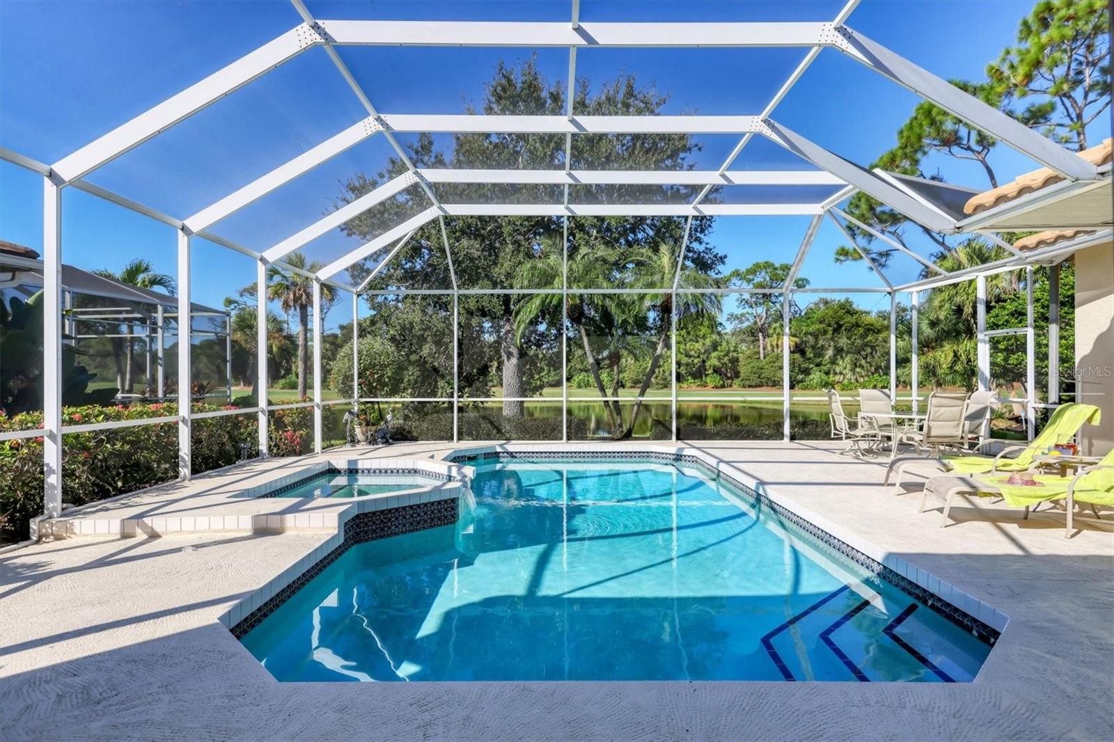 Welcome to a home that perfectly blends comfort, style, and Florida living. This beautifully maintained 2,794 sq. ft. residence offers 4 bedrooms, 3 baths, a den, and generous gathering spaces designed for both relaxation and entertaining. From the moment you step through the double etched-glass doors, you’re greeted by captivating views of the pond and golf course — setting the tone for everything this home has to offer. The foyer is framed by the formal dining area, cozy living room, and a versatile den — ideal for a home office or quiet retreat. The open-concept design connects the spacious kitchen and great room, creating a natural flow for everyday living and entertaining. The kitchen itself is extra large and thoughtfully designed, offering plenty of prep and storage space for the home chef. Step through sliding glass doors to the expansive lanai — the true heart of this home. Here, a sparkling pool and spa overlook tranquil water and golf course views. With both covered and open-air seating areas, this space invites you to enjoy everything from morning coffee to sunset cocktails in total privacy. The primary suite is a serene retreat featuring two large closets and a spa-inspired ensuite bath with dual vanities, a soaking tub, and a walk-in shower. Both vanities have been tastefully updated with quartz countertops, rectangular sinks, and brushed gold fixtures. The split floorplan provides privacy for family and guests, with three additional bedrooms and two full baths. For peace of mind, the home is equipped with high-impact windows, accordion-style hurricane shutters, and a new tile roof installed in 2018. The interior has been freshly painted in a soft, neutral palette, creating a bright and inviting atmosphere throughout. Whether you’re hosting friends, enjoying quiet evenings by the pool, or simply soaking in the views, this home offers the best of Florida’s indoor-outdoor lifestyle — your very own private oasis. As a bonus the seller has paid the golf assessment in full, saving you $812 per year for the next 9 years.