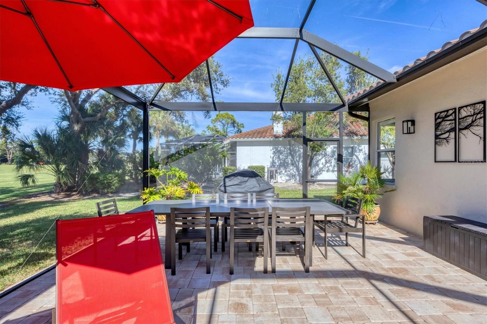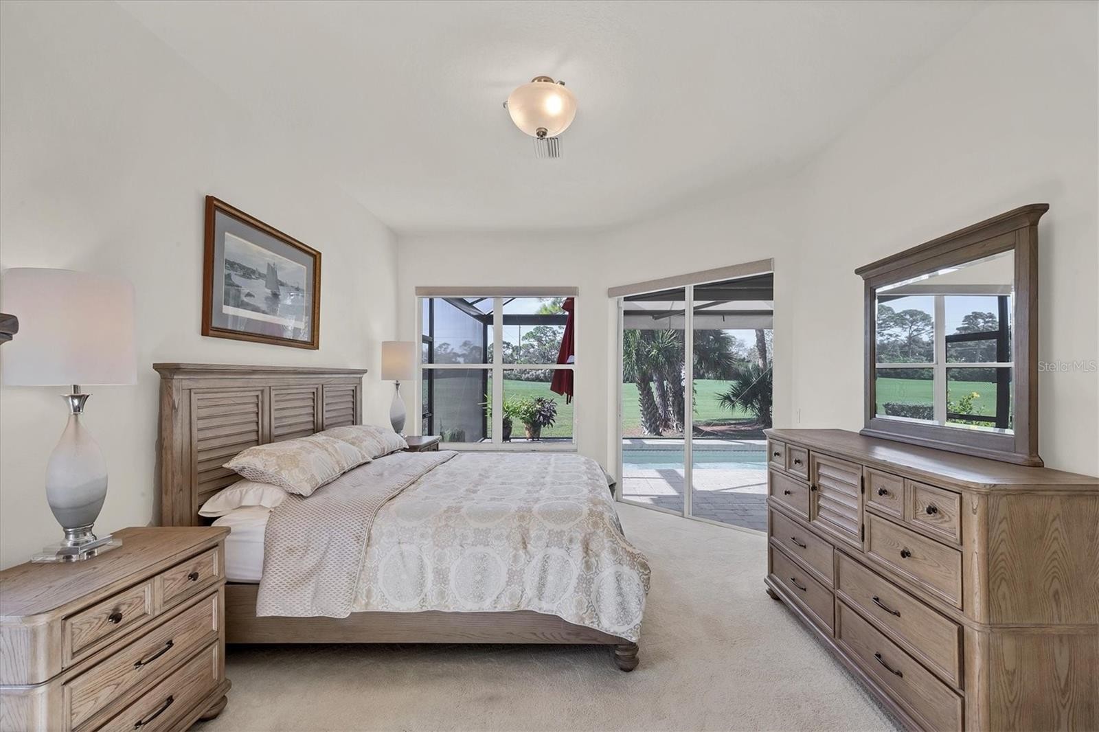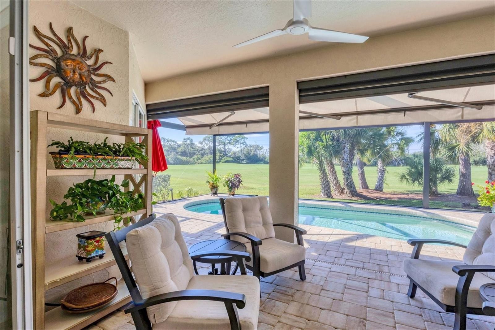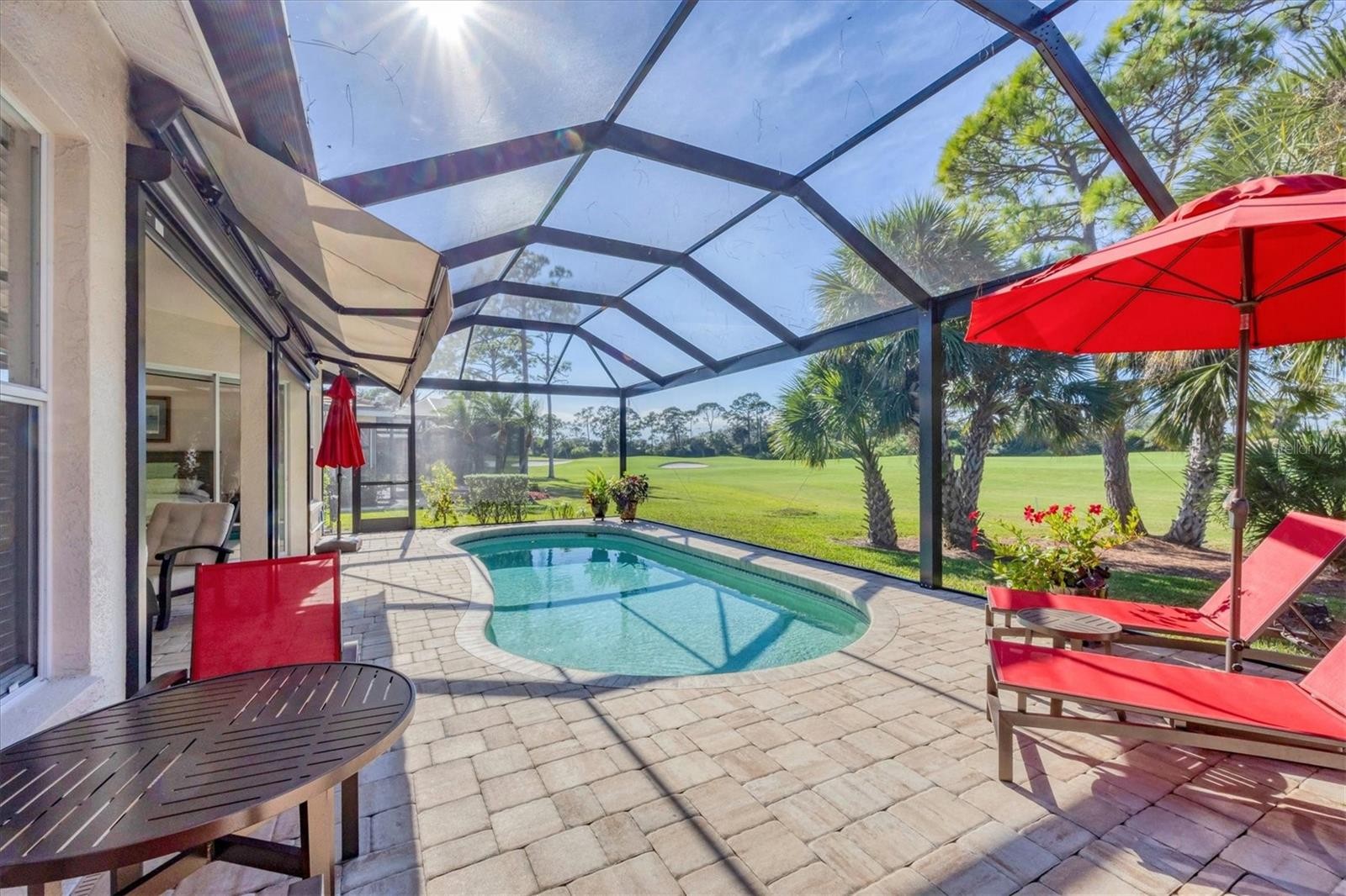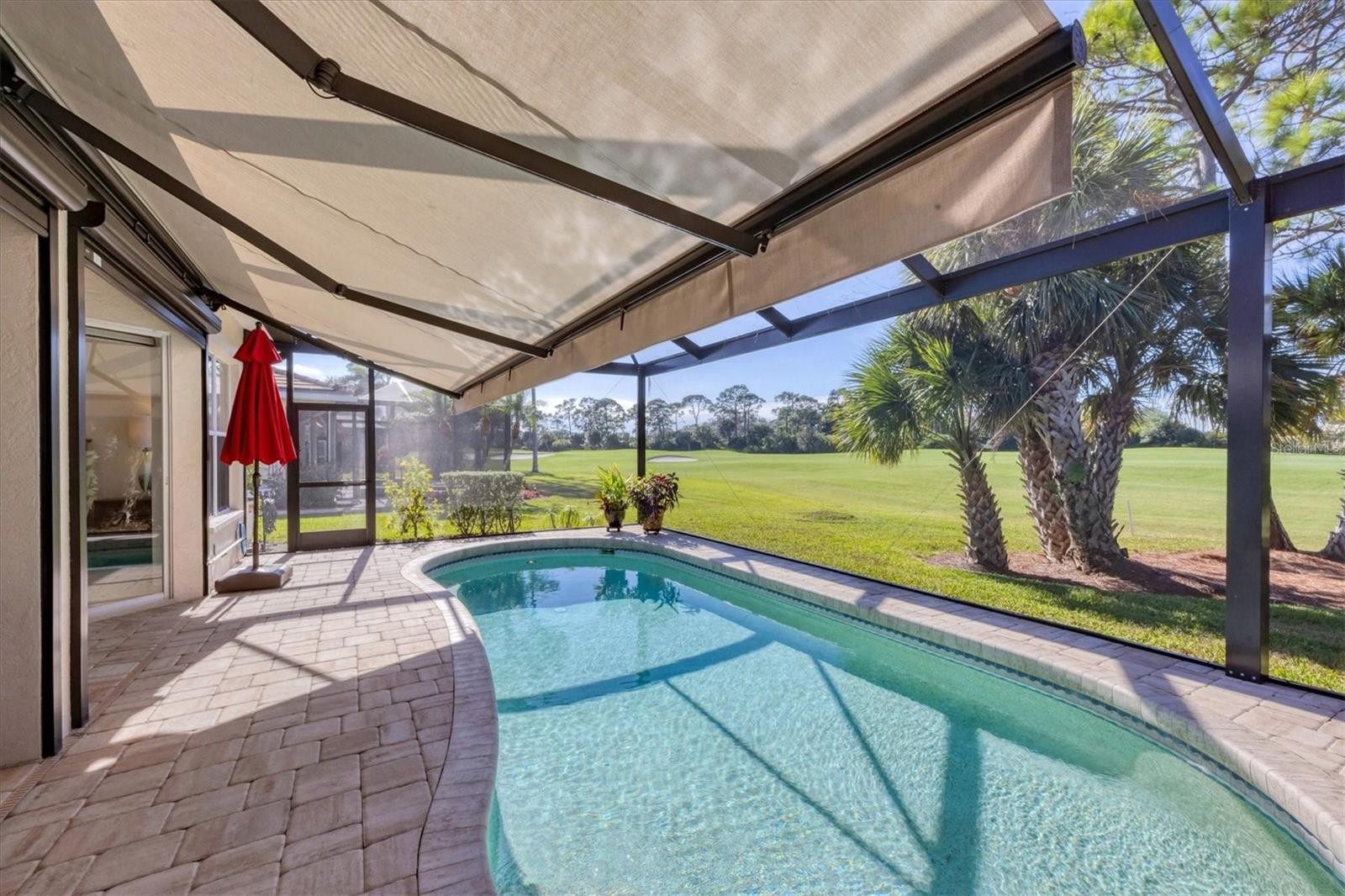 Under contract-accepting backup offers. IMPRESSIVE 3 bedroom, 2 bath, with DEN and heated saltwater POOL home in sought after Stoneybrook Golf and Country Club! This one has it all.. nestled on the 12th hole with expansive views and updates galore! This is a true open floor plan with kitchen inclusive to the wide open living space adorned with crown molding, an extended eat on bar, granite counters, new soft close cabinetry, closet pantry with pull out shelves, a dinette with large windows, formal dining space and multiple glass sliding doors out to lanai/pool area. Loads of natural light! The premier outside entertaining area has been extended with NEW pavers and storm rated panoramic screens and lanai cage, as well as an electric awning to add shade.. your prime view is jaw dropping of the pristine greens and sunset views! Primary suite enjoys updated ensuite bath with spa like soaking tub, granite counters with dual sinks, and tiled walk-in shower.. 2nd full bath has been updated with a raised stone vanity and tiled shower.. A desirable den has double french doors for privacy and a murphy bed for more guests. Laundry room has an added utility sink, an additional pantry with pull out shelves and lots of cabinet space. 2 car garage has an updated epoxy floor and plenty of room for 2 cars and all your golf and beach gear! Driveway and entryway have been professionally landscaped and are pavered as well. More updates include recessed lighting, new remote controlled fans, new blinds/shades, electric hurricane screen, AC 2021, water heater 2024, garage door 2020, pool pump 2025, well pump for irrigation 2025, TILE ROOF 2022! Stoneybrook is a gated and well established club in Palmer Ranch and boasts top amenities that include a new 18 hole golf course redesigned by Kipp Schultes and is said to be one of the best on the West Coast! Lighted Har-Tru tennis/pickleball courts, pro-shop, well-equipped fitness center, bocce court, putting greens, driving range, fitness studio, sharing library, additional heated pool/spa, full service restaurant/bar, meeting rooms, catering facility, outdoor dining patio, walking/biking trails, fishing, planned activities like yoga, mahjong, line dancing, and so much more! Stoneybrook Golf and Country Club is a prime location close to the Legacy Trail, shopping, Costco, restaurants and all Sarasota and Venice has to offer! WELCOME HOME to RESORT-STYLE LIVING at its BEST!