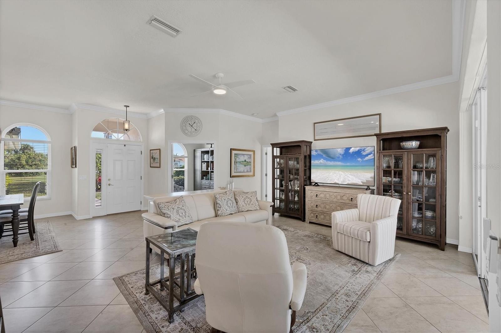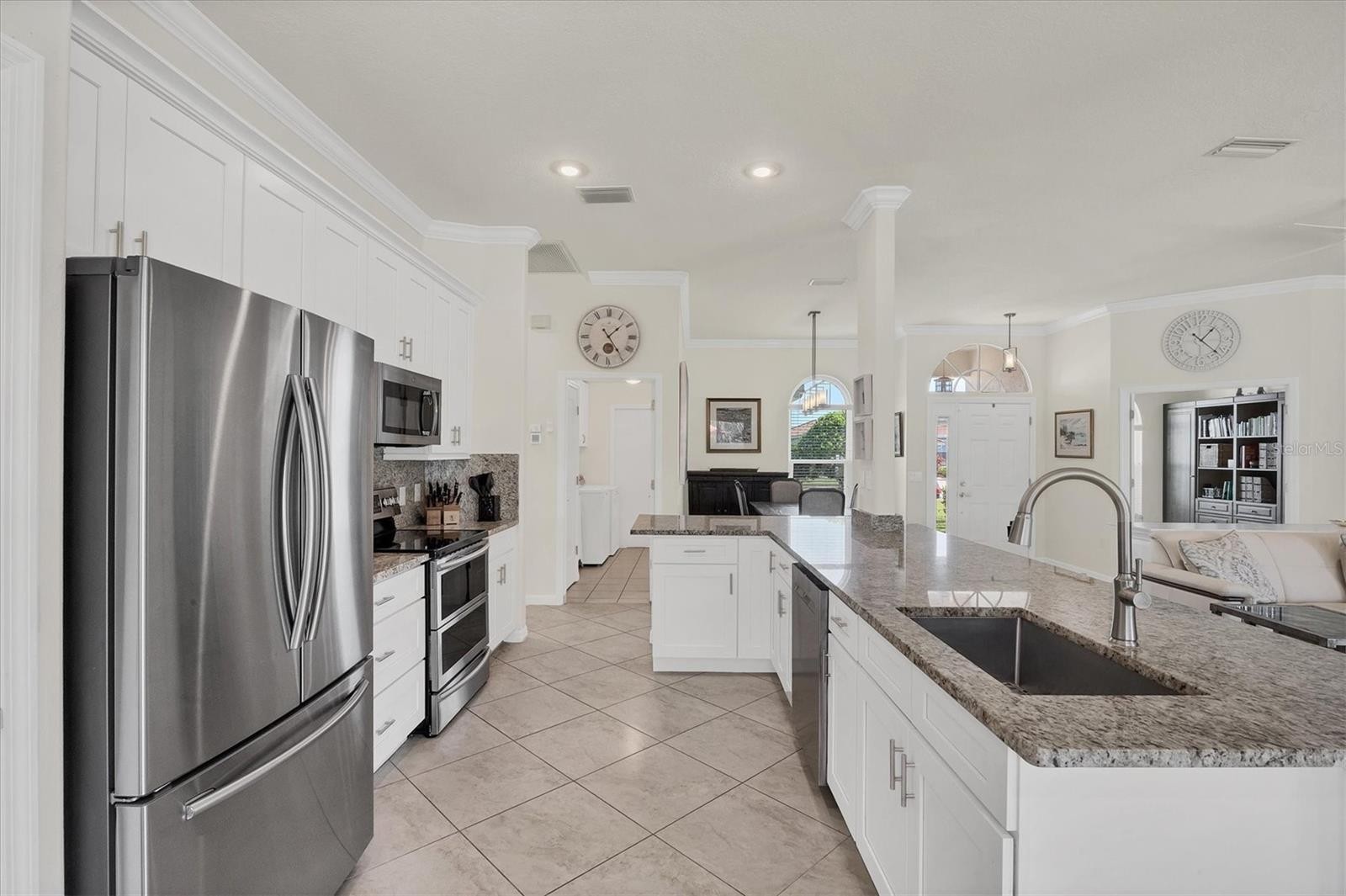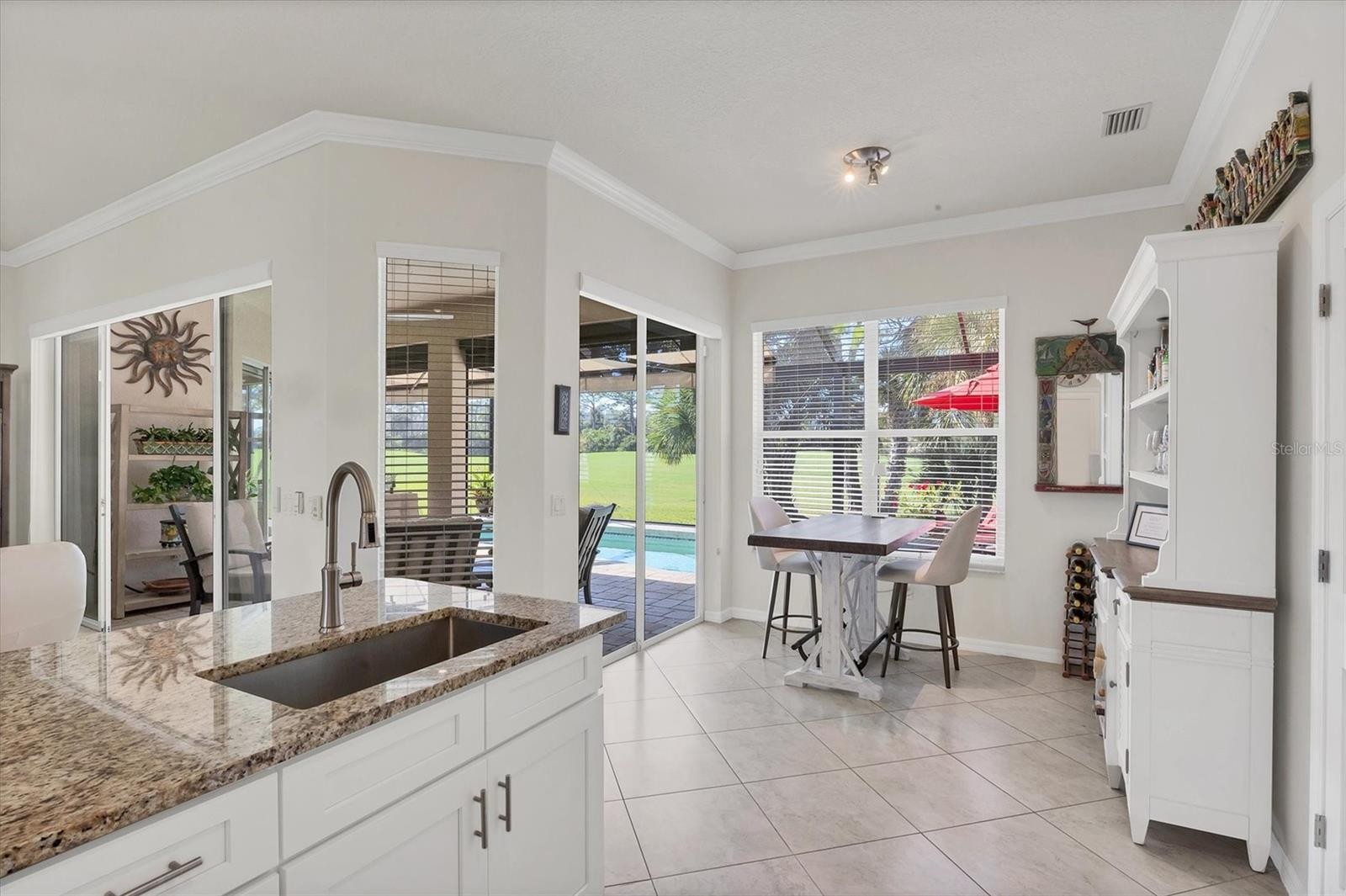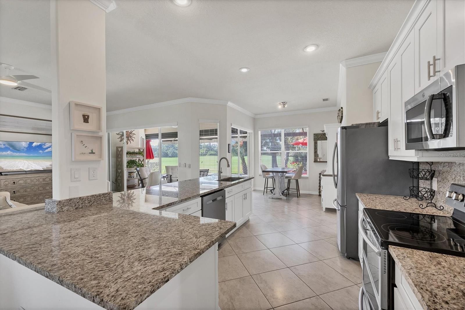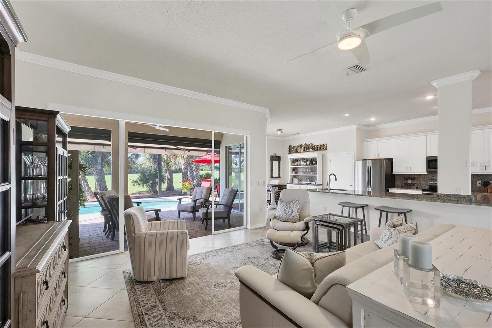 Under contract-accepting backup offers. IMPRESSIVE 3 bedroom, 2 bath, with DEN and heated saltwater POOL home in sought after Stoneybrook Golf and Country Club! This one has it all.. nestled on the 12th hole with expansive views and updates galore! This is a true open floor plan with kitchen inclusive to the wide open living space adorned with crown molding, an extended eat on bar, granite counters, new soft close cabinetry, closet pantry with pull out shelves, a dinette with large windows, formal dining space and multiple glass sliding doors out to lanai/pool area. Loads of natural light! The premier outside entertaining area has been extended with NEW pavers and storm rated panoramic screens and lanai cage, as well as an electric awning to add shade.. your prime view is jaw dropping of the pristine greens and sunset views! Primary suite enjoys updated ensuite bath with spa like soaking tub, granite counters with dual sinks, and tiled walk-in shower.. 2nd full bath has been updated with a raised stone vanity and tiled shower.. A desirable den has double french doors for privacy and a murphy bed for more guests. Laundry room has an added utility sink, an additional pantry with pull out shelves and lots of cabinet space. 2 car garage has an updated epoxy floor and plenty of room for 2 cars and all your golf and beach gear! Driveway and entryway have been professionally landscaped and are pavered as well. More updates include recessed lighting, new remote controlled fans, new blinds/shades, electric hurricane screen, AC 2021, water heater 2024, garage door 2020, pool pump 2025, well pump for irrigation 2025, TILE ROOF 2022! Stoneybrook is a gated and well established club in Palmer Ranch and boasts top amenities that include a new 18 hole golf course redesigned by Kipp Schultes and is said to be one of the best on the West Coast! Lighted Har-Tru tennis/pickleball courts, pro-shop, well-equipped fitness center, bocce court, putting greens, driving range, fitness studio, sharing library, additional heated pool/spa, full service restaurant/bar, meeting rooms, catering facility, outdoor dining patio, walking/biking trails, fishing, planned activities like yoga, mahjong, line dancing, and so much more! Stoneybrook Golf and Country Club is a prime location close to the Legacy Trail, shopping, Costco, restaurants and all Sarasota and Venice has to offer! WELCOME HOME to RESORT-STYLE LIVING at its BEST!