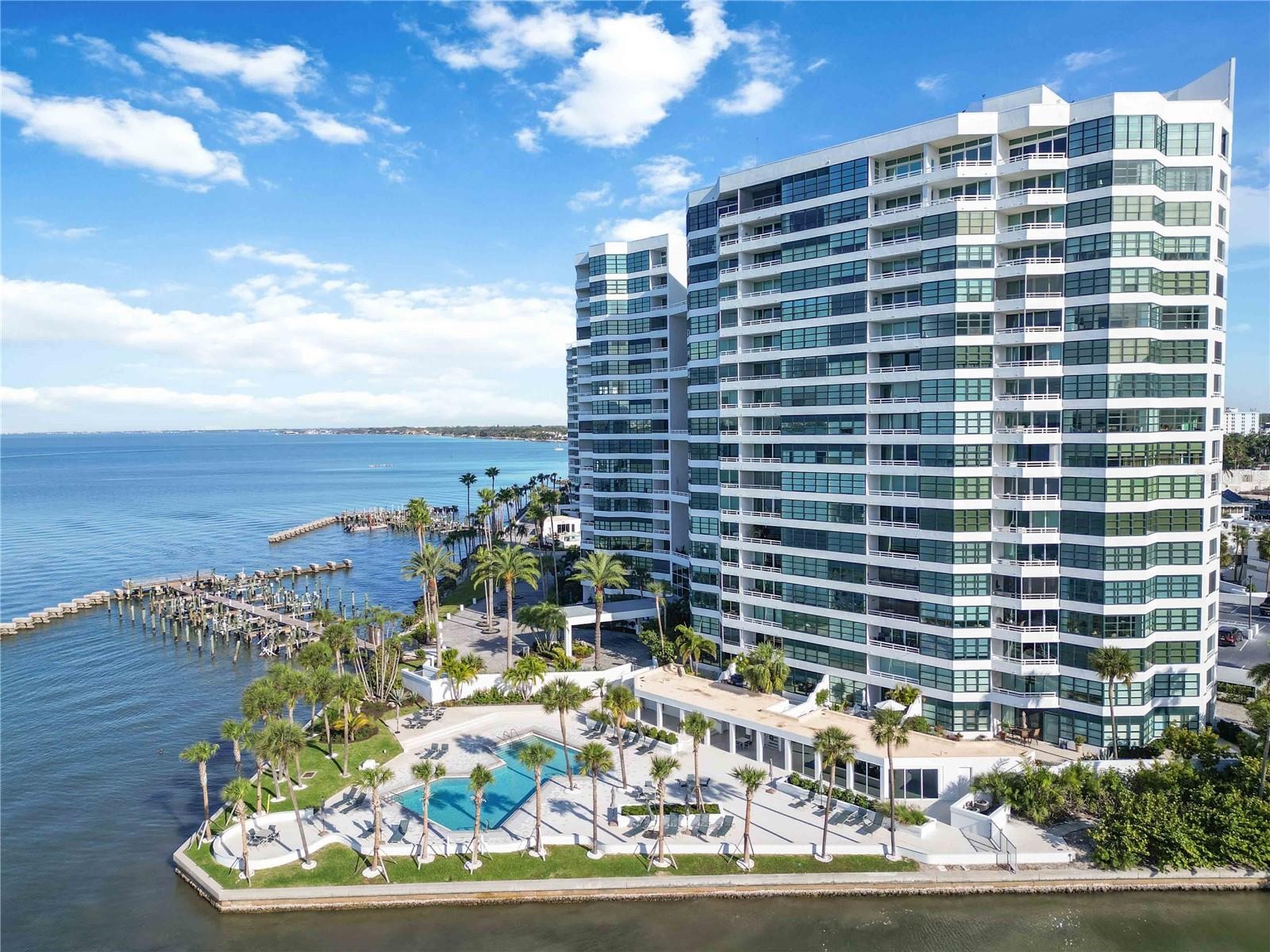 DIRECT BAYFRONT! Rare Opportunity for the buyer that understands value and vision. Downtown, coveted cultural, waterfront address offering a front row seat of unobstructed views of Sarasota Bay and stunning sunsets. This direct bayfront residence is located on it’s own private 9 acre peninsula within walking distance to downtown, with an array of restaurants; cultural events; boutiques; whole foods; farmers market and activities. The new 52 acre Bay Park is directly next door and offers mangrove walking trails; public gardens; children’s play area; yoga; zumba; concert stage; new marina and future new performing arts hall. Condo on the Bay offers amenities galore: 2 resort-style heated pools, sauna, 2 fitness facilities, social clubroom, library and kitchen; organized activities, sky lobby gathering areas, pickleball; 24hr Security, Concierge services; 24/7 security gatehouse; bike storage; garage & guest parking; EV charging station; fishing pier; kayak, jet ski and boat storage on a first come basis; freshly updated lobbies and on-site management. The Condo fees include everything except electric. Panoramic Bay views is what you’ll experience the minute you walk through your front door. Imagine yourself enjoying tranquil water views from your 7th floor private balcony watching the dolphins and birds play. This condo provides a blank canvas for a buyer who wants to design a truly custom space tailored to their personal style. New A/C-2025; Hot water heater-2022; and Sliding Glass door-2023 already in place. From tranquil sunset strolls along the bayfront to evenings at the opera or ballet, this location put’s Sarasota’s vibrant energy right outside your door.