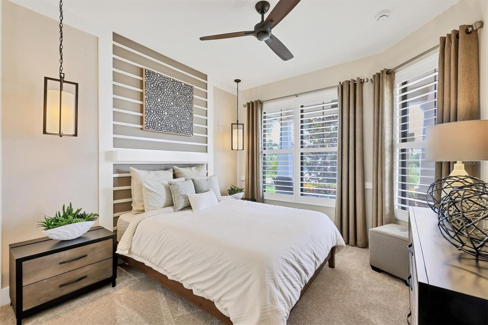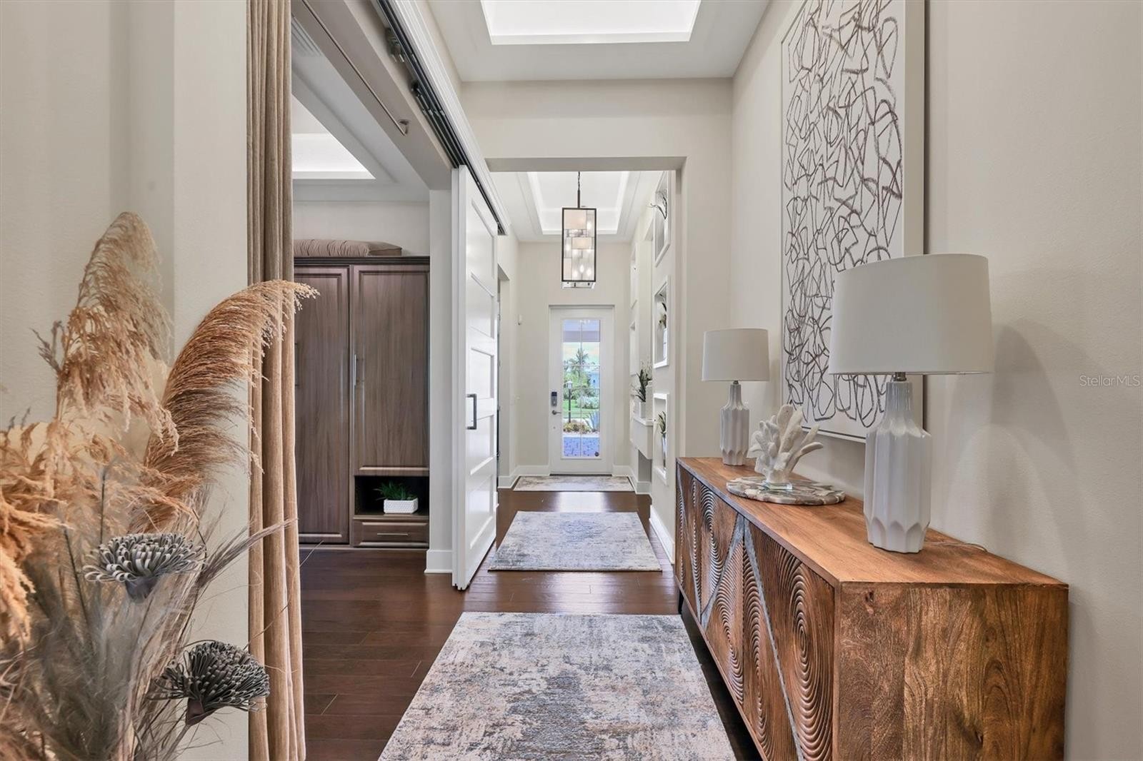 LOCATION / LIFESTYLE — Live steps from it all at Lakehouse Cove at Waterside. Start your day with a swim in the resort-style pool, hit the fitness center, or grab a paddle for pickleball before kayaking on Kingfisher Lake. The lakefront clubhouse is the perfect spot to relax, connect with neighbors, and enjoy the views. Dog parks, a playground, and scenic paths add to the fun, while a quick walk or bike ride brings you to Waterside Place for waterfront dining, shopping, and vibrant community events. An active, social lifestyle right outside your door. Originally designed by Homes by Towne as the showcase Schooner model, this home combines thoughtful design, extensive upgrades, and relaxed coastal style. From the moment you enter, the quality and attention to detail are immediately apparent. The open great room features tray ceilings, recessed lighting, a cozy electric fireplace, custom shelving, and a striking designer feature wall. Triple glass sliders open to a screened lanai with an outdoor kitchen, TV, and extended paver patio, perfect for Florida’s indoor-outdoor living. The kitchen is both stylish and functional, offering a large quartz island, stainless steel appliances, wood cabinetry, subway tile backsplash, and accent lighting. The primary suite includes tray ceilings, plantation shutters, tranquil views, extended quartz vanity, a large walk-in shower, and custom walk-in closet. The private secondary bedroom and bath create a quiet, comfortable space, while the den with a stylish Murphy bed adds flexibility for an office or for overnight guests. Additional highlights include engineered hardwood floors, upgraded lighting and ceiling fans, a Sonos sound system, security cameras, reverse osmosis kitchen system, whole-house water softener and lush maintenance free landscaping. Beyond the community, Lakehouse Cove at Waterside keeps you close to everything downtown Lakewood Ranch, The Mall at University Town Center, polo matches at the Sarasota Polo Club, nearby golf, and Sarasota’s beautiful Gulf beaches perfect for spontaneous nights out or easy beach days.