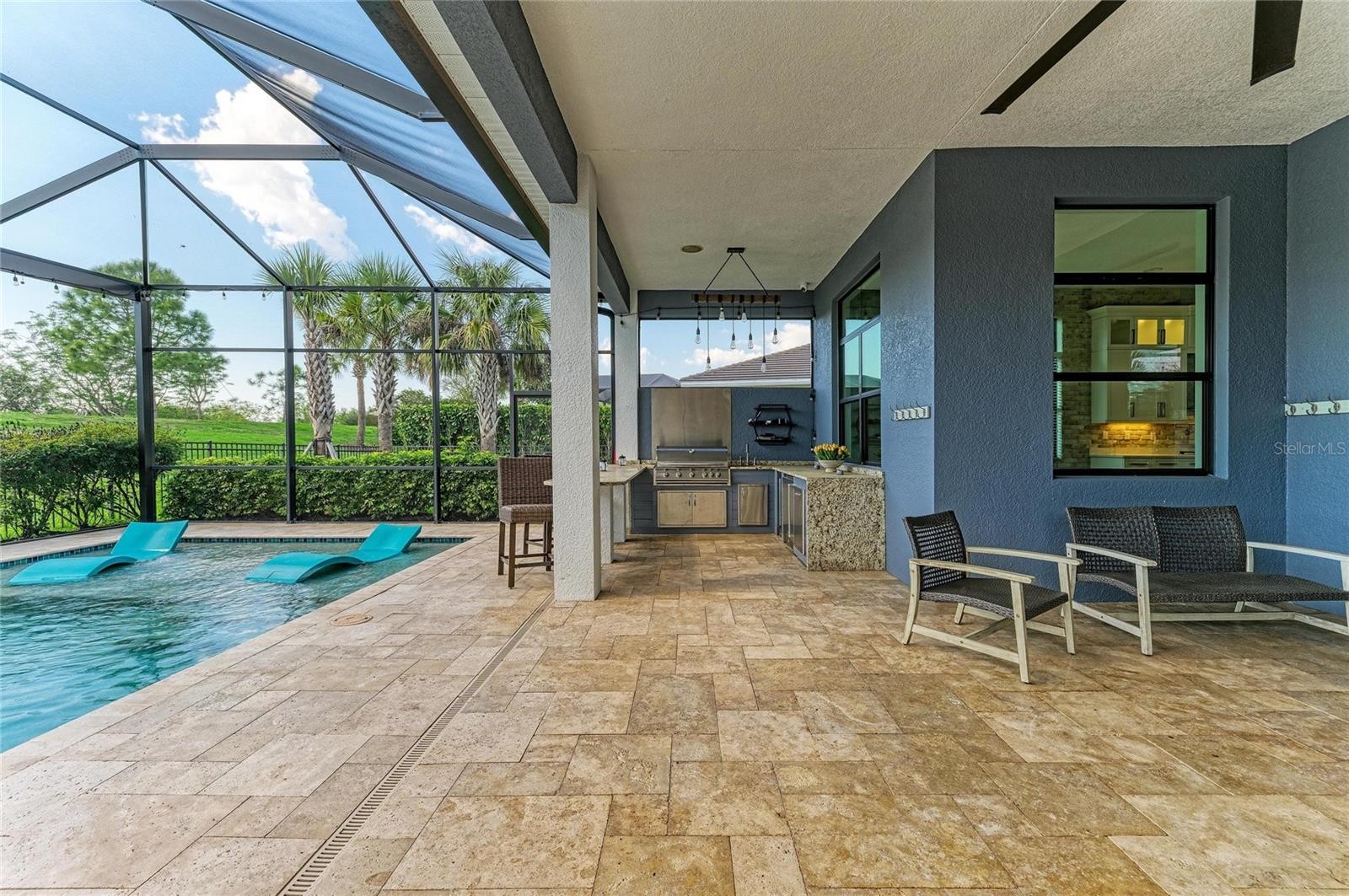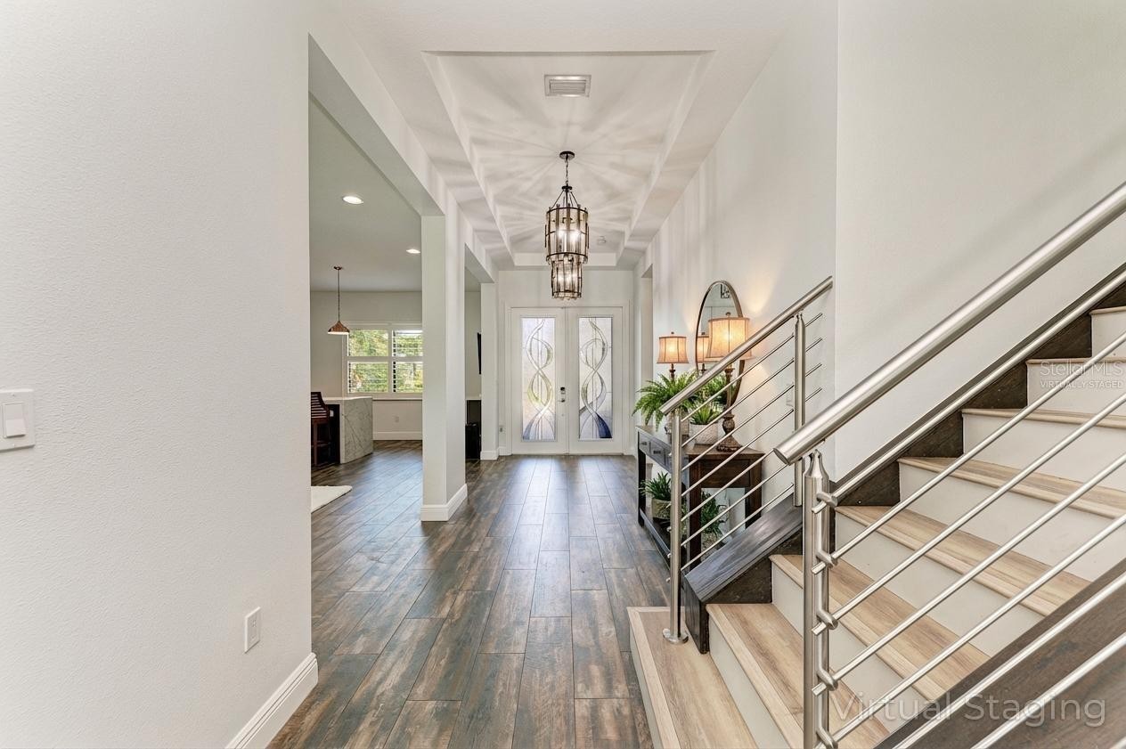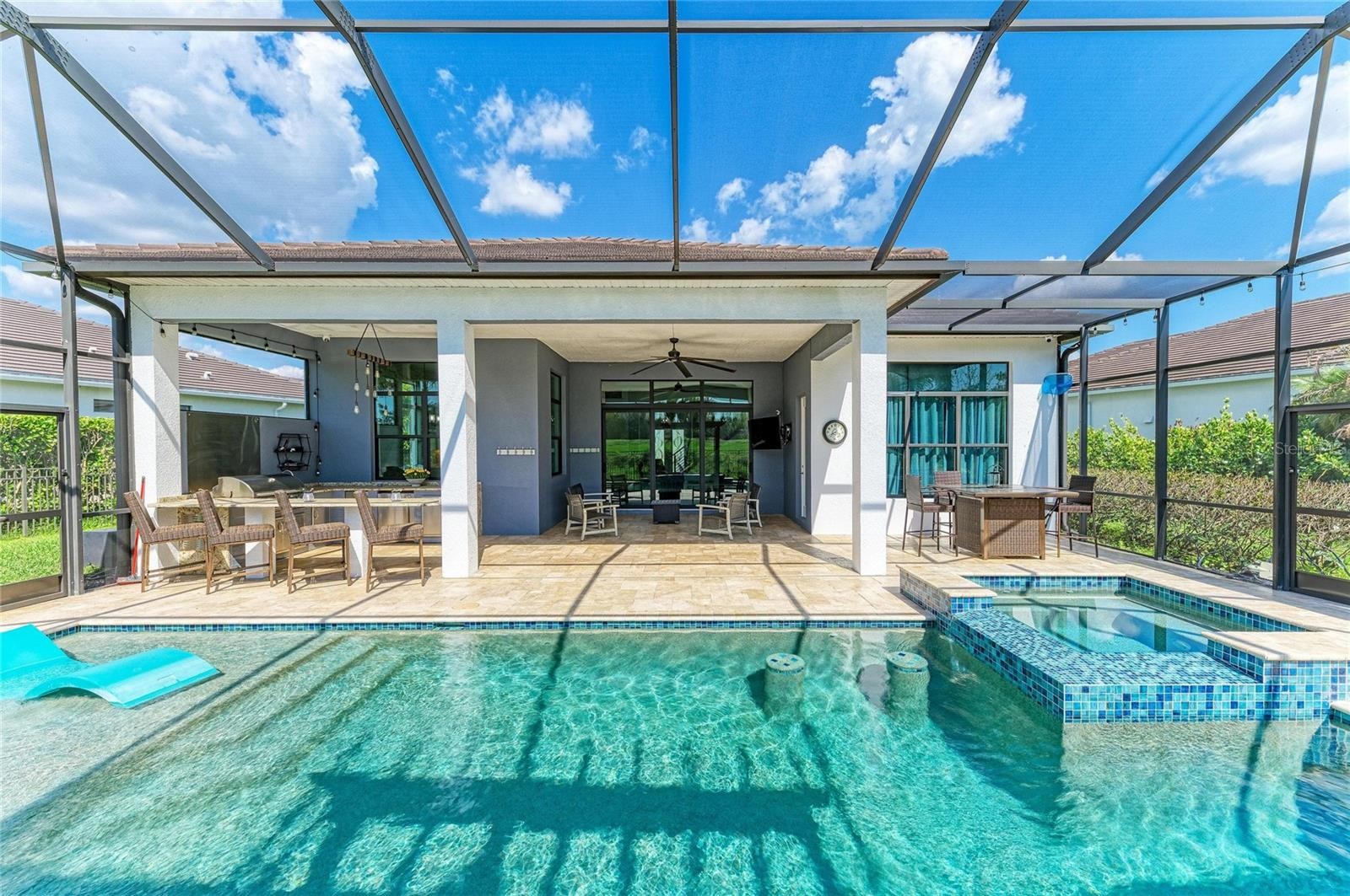 One or more photo(s) has been virtually staged. Experience elevated living in this gorgeous newer Kolter Chagall home located in the highly desirable community of Artistry of Sarasota. Offering 4 bedrooms and 5 baths, along with a club room and loft area, this beautifully designed residence blends everyday comfort with upscale entertaining. With model like finishes throughout, the home showcases exceptional quality, style, and thoughtfully curated upgrades including coffered ceiling sets the tone upon entry, introducing the home’s refined architectural detail and airy elegance. At the heart of the home is a stunning open concept first floor, where the newly painted entry, living room, and kitchen create a fresh, bright, and welcoming atmosphere for both comfortable daily living and effortless entertaining. The chef’s kitchen features quartz countertops, a dramatic oversized center island with waterfall edge detail and generous seating, custom white shaker cabinetry, backlit upper display cabinets designed for decorative appeal, designer backsplash detail, GE Monogram wall ovens and gas cooktop, LG refrigerator and dishwasher, and abundant prep and storage space. The adjoining great room is enhanced by a coffered ceiling and custom accent wall, adding warmth, texture, and architectural interest. An abundance of natural light pours in through the sliders, creating a bright and airy atmosphere while drawing your eye out to the glorious spa like pool and zen inspired lanai. The first floor features a flex office/guest suite, full bath for guests, laundry room with built in shelving, and a beautifully appointed club room complete with a wet bar and wine fridge, offering the perfect setting for entertaining or unwinding. The first floor primary suite is a luxurious retreat with abundant natural light, custom built walk in closets, and a coffered ceiling that enhances the sense of elegance and scale. The spa like primary bath features dual vanities and a generous walk in shower. As you make your way upstairs, a staircase accented by a sleek horizontal metal railing adds a clean architectural element to the home’s modern design. Upstairs, there are three guest bedrooms and tow of them feature en suite baths and walk in closets, centered around a large loft area that offers the perfect setting for a media room, game room, or casual lounge for hosting family and friends. The outdoor living area is designed as a true private retreat, the screened lanai showcases a spectacular saltwater pool and spa with beautiful water features, a sun shelf with in pool seating, and a hot tub style spa area perfect for unwinding. Framed by travertine decking and lush green views, the outdoor space also features a striking pergola style architectural accent that enhances the resort like setting. The covered lanai includes an outdoor kitchen with bar seating and an additional generous seating area, creating the ultimate backdrop for entertaining, relaxing poolside, or enjoying peaceful Florida living. Upgrades include hurricane impact windows and doors, gas appliances, community irrigation, a mini split in the garage, and a Briggs & Stratton whole house generator. Located in the gated, amenity rich community of Artistry, residents enjoy maintenance free living with access to a resort style pool, clubhouse, pickleball courts, basketball court, playground, and scenic walking trails. Ideally located near world class shopping, dining, and Sarasota’s renowned beaches, this home is high and dry located in zone X.
