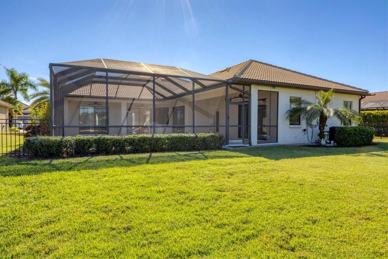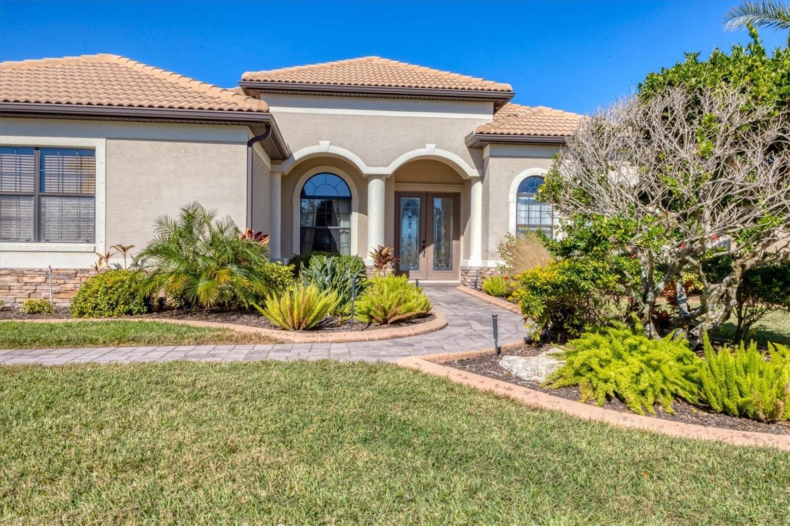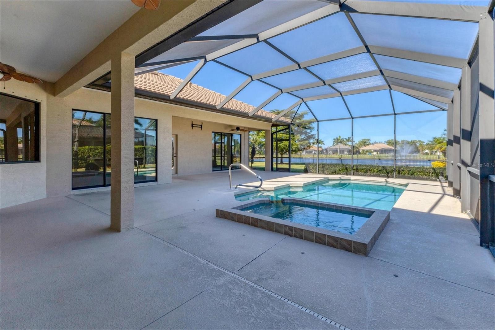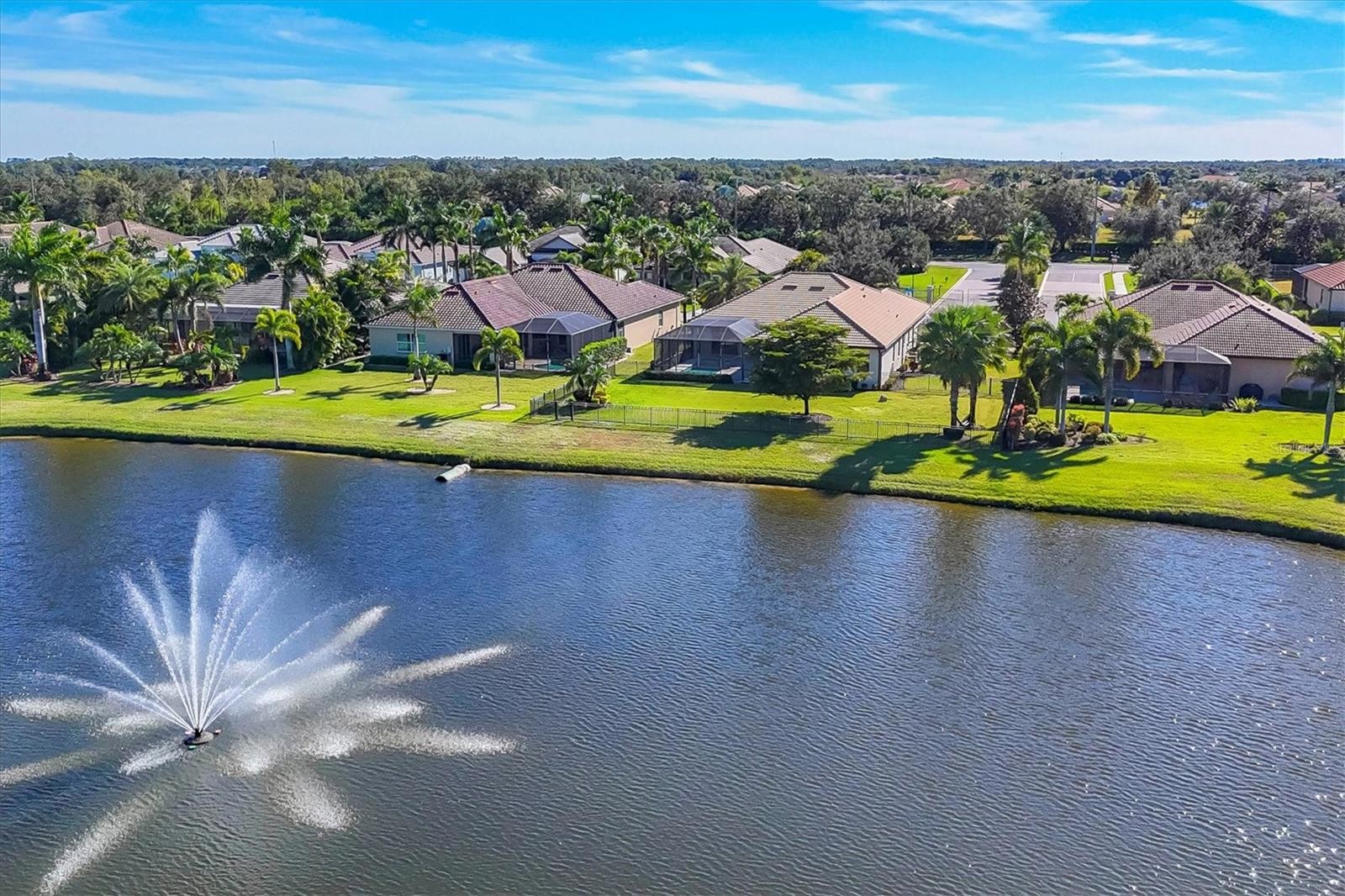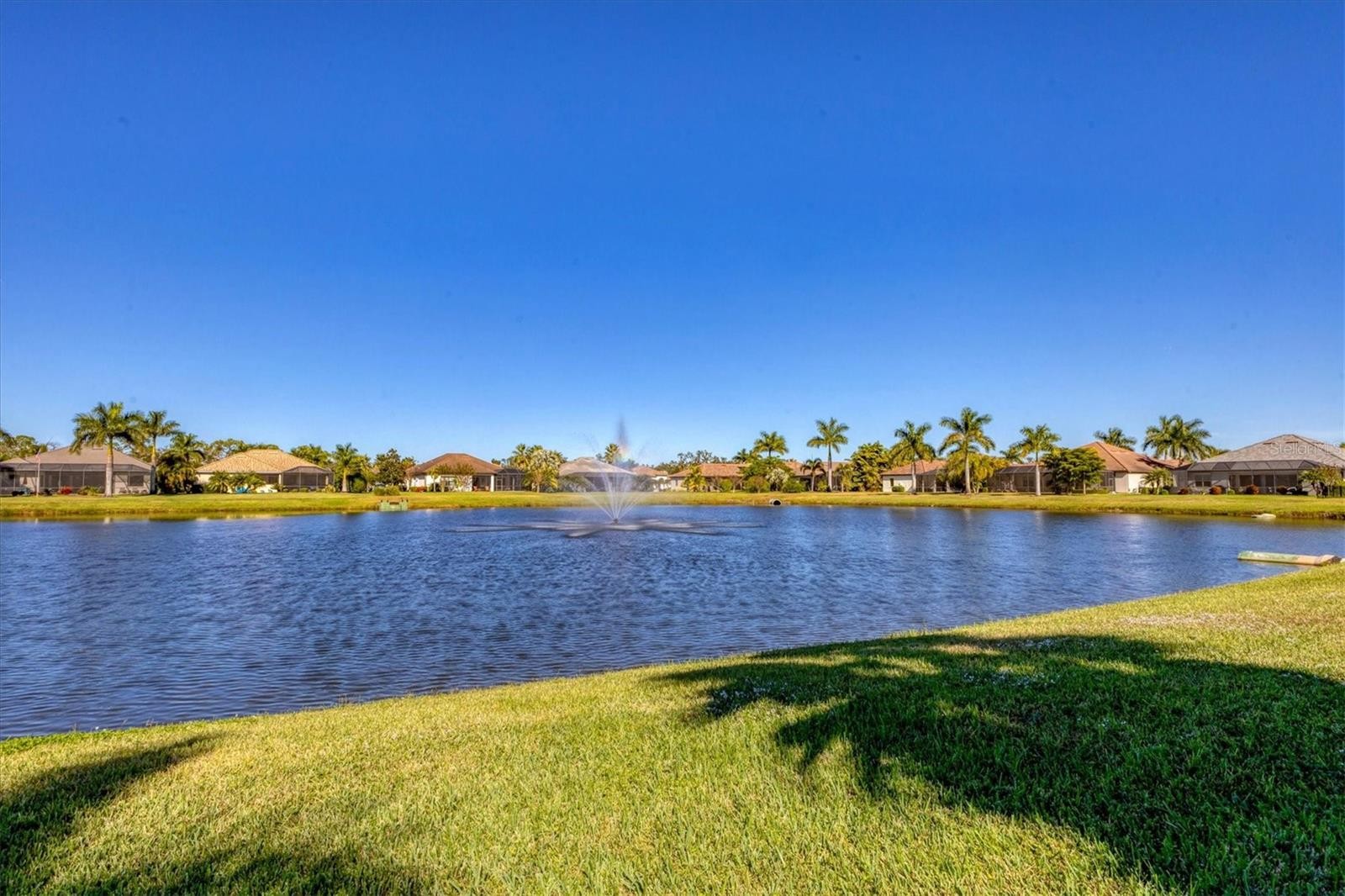 Discover this spacious 4-bedroom plus den/office, 3-bath pool home located in the gated community of the Enclave at Country Meadows. Situated on a nearly one half-acre tranquil lakefront homesite, this residence welcomes you with a paver walkway leading up to the double glass door entryway. Once inside you will be welcomed into an open floorplan with cathedral ceilings showcasing stunning pool and magnificent water views. This floorplan has a split bedroom design with the primary on one side, three additional bedrooms and two full baths on the opposite side for the ultimate privacy. Enjoy peace of mind with numerous updates, including two HVAC units (2021 & 2023), a new fence (2020), dishwasher (2021), pool pump (2021), refrigerator (2022), irrigation well pump (2023), and a custom built-in breakfast nook bench with storage (2024). The family room features a custom built-in entertainment center ideal for a large-screen TV for family movie nights or watching your favorite sports team. The outdoor living area flows from inside the home with two covered areas for relaxation, entertaining, grilling your favorite meal, or lounging with a good book. Spacious decking surrounds the pool and spa for the ultimate in Florida living. The 3-car side-load garage offers added functionality with cabinetry and slatwall storage. No CDD fees and low HOA dues! Conveniently located near Lakewood Ranch with many dining and shopping options, the UTC Mall, and a short drive to Florida’s beautiful Gulf beaches.