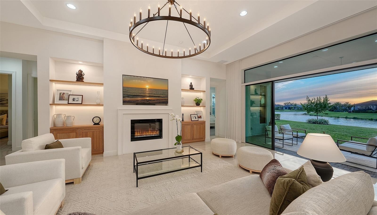 Positioned on one of the most coveted lakefront homesites within Artistry Sarasota, this impeccably enhanced Monet residence embodies a refined, tranquil lifestyle with a thoughtful balance of privacy, elegance, and modern comfort. Lush, mature landscaping lines both sides of the backyard, creating a secluded sanctuary while preserving sweeping water views and generous space for a future pool—an ideal backdrop for quiet mornings and effortless outdoor living. The residence offers a sophisticated and functional layout with three ensuite bedrooms, a dedicated den, and a well-appointed powder room for guests. The primary suite with wood effect Porcelain tile flooring is a serene retreat, oriented to capture long lake vistas and soft natural light enhancing the home’s calming atmosphere. Inside, the interiors present a crisp, luminous aesthetic complemented by carefully curated upgrades, including large format high gloss tile. The great room is anchored by a custom-designed fireplace feature, framed by solid white oak built-in shelving and cabinetry with integrated lighting—delivering both architectural presence and warmth. Over $130,000 in builder and owner enhancements elevate the home throughout, including whole-house plantation shutters, bespoke drapery, custom office built-ins, and a redesigned laundry room with added cabinetry and workspace. Further refinements include large-format polished tile flooring across the main living areas, quartz surfaces in the kitchen, soft-close cabinetry with crown detailing, designer lighting, and spa-inspired bathrooms with tile extending to the ceiling. The outdoor living experience is equally considered, with a screened patio enclosure, professionally reimagined landscaping, and sealed paver driveway completing the home’s polished presentation. As one of the most extensively upgraded Monet residences currently available, this property offers a rare level of completion and move-in readiness within the community. Residents of Artistry Sarasota enjoy a gated, maintenance-free environment complemented by resort-style amenities, including a clubhouse, pool, pickleball and basketball courts, playground, and scenic walking trails. With no CDD fees and a location outside of a flood zone, the home also provides peace of mind. Ideally situated, this residence offers convenient access to The Mall at University Town Center, championship golf courses, acclaimed dining, and the renowned cultural and waterfront destinations of Sarasota—including its world-class beaches and vibrant arts scene. Furnishings may be available separately.