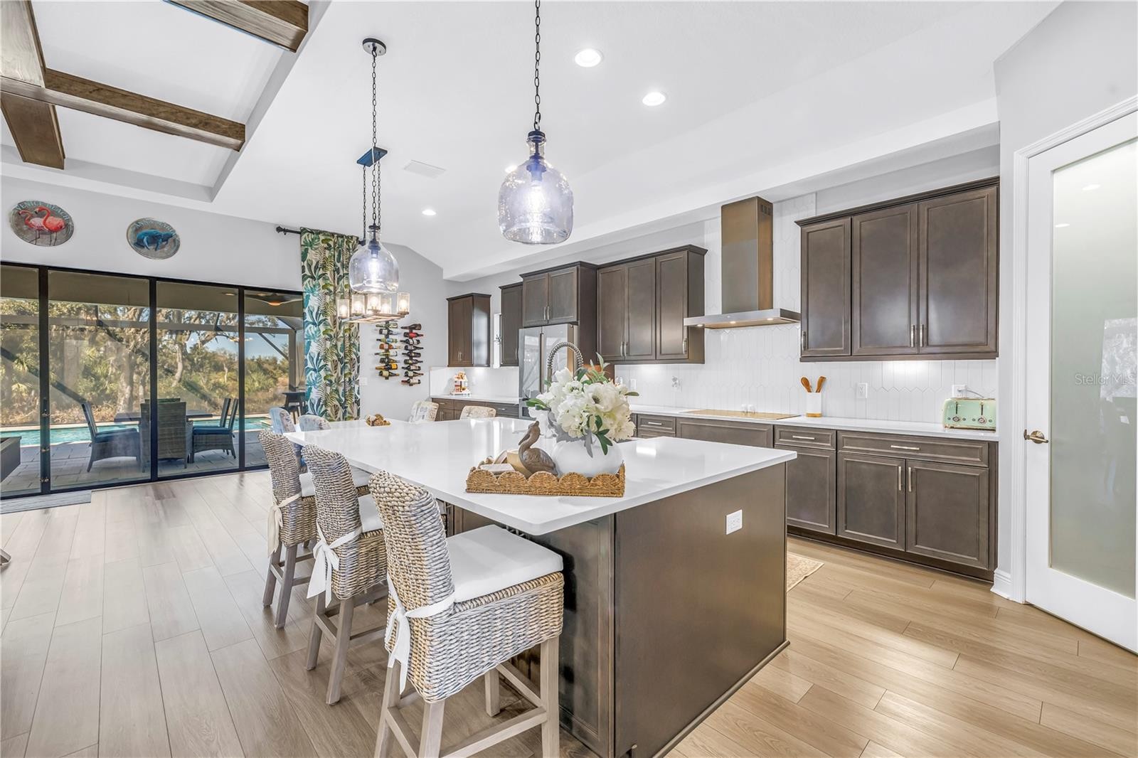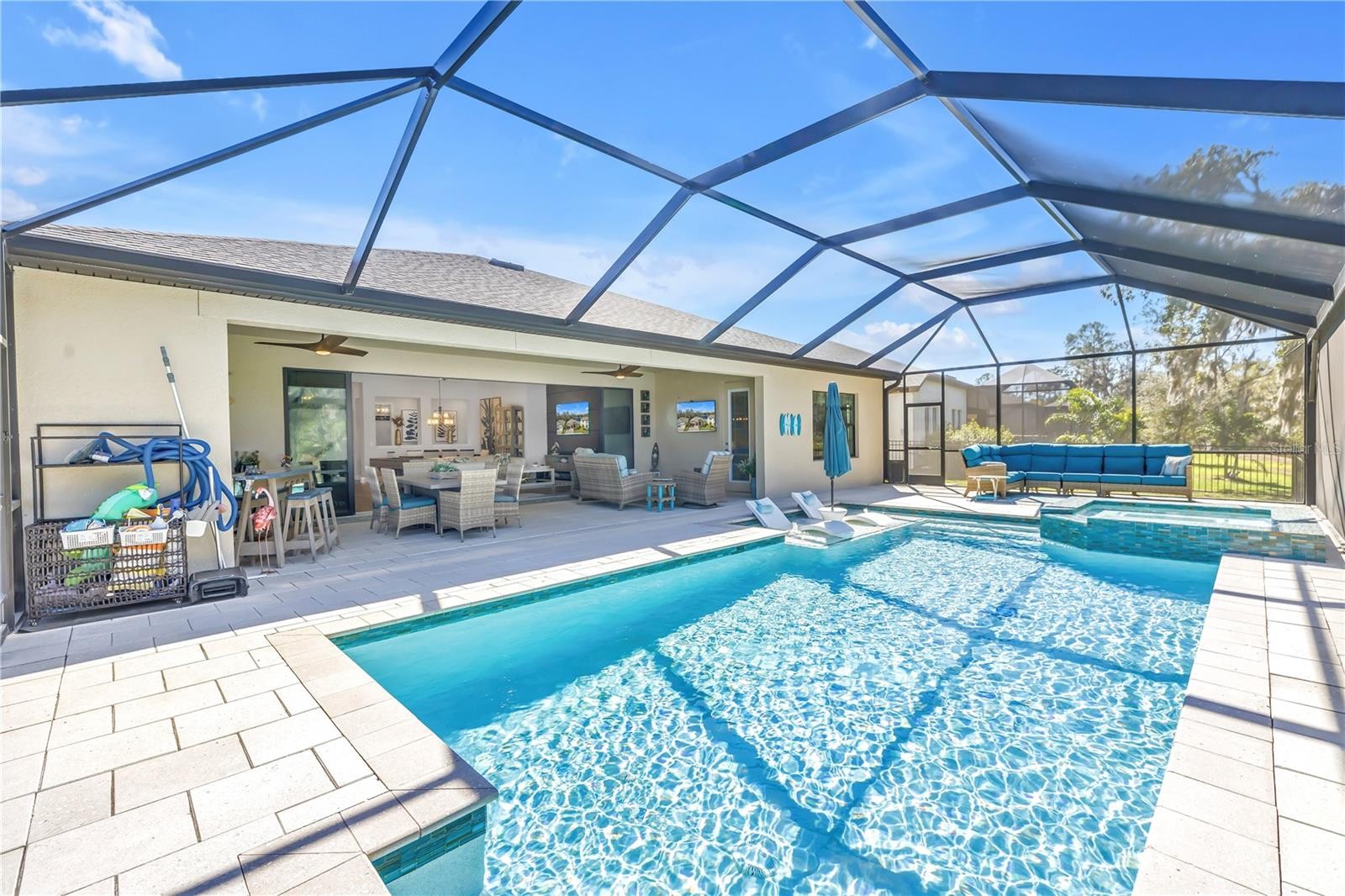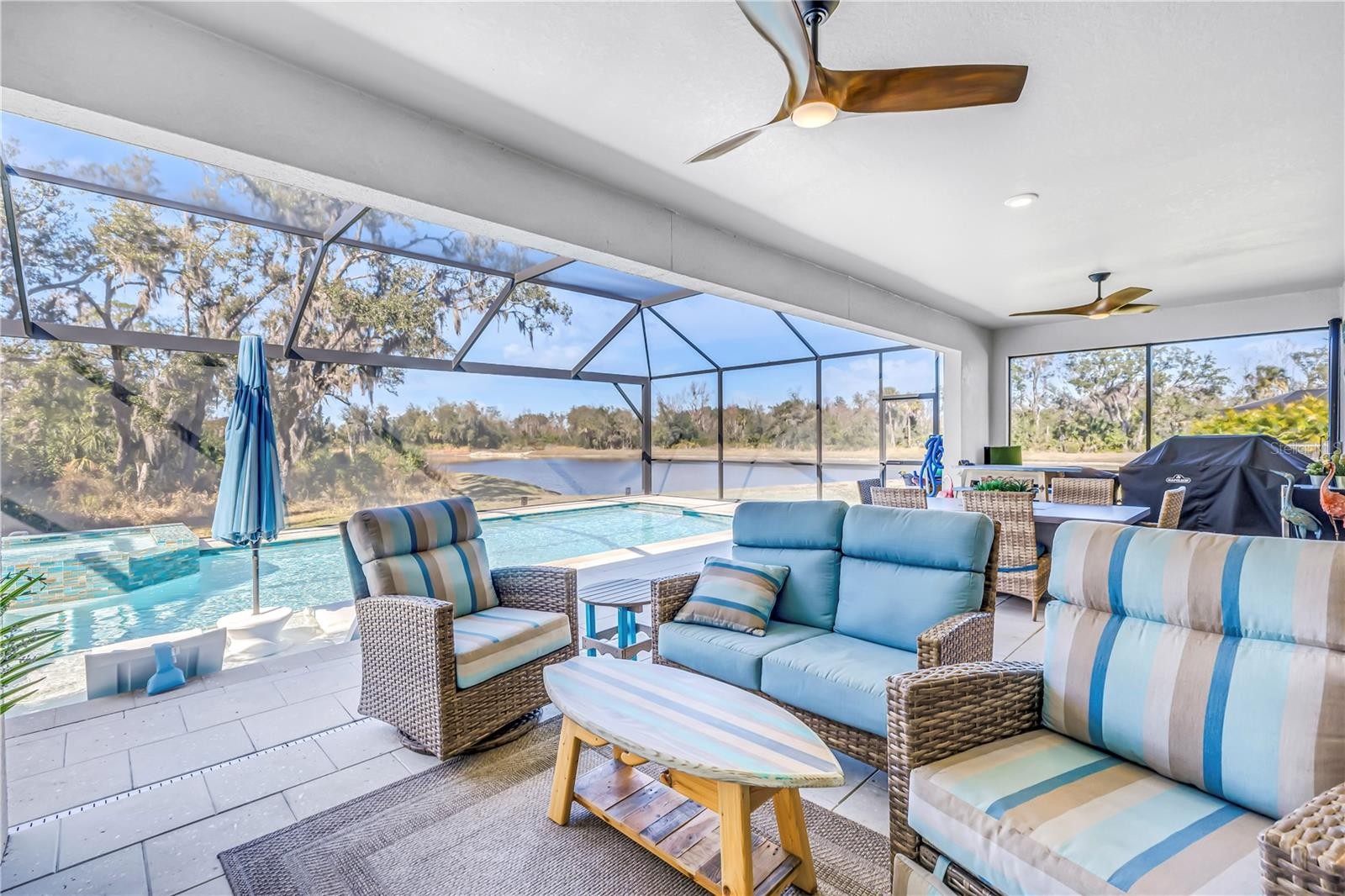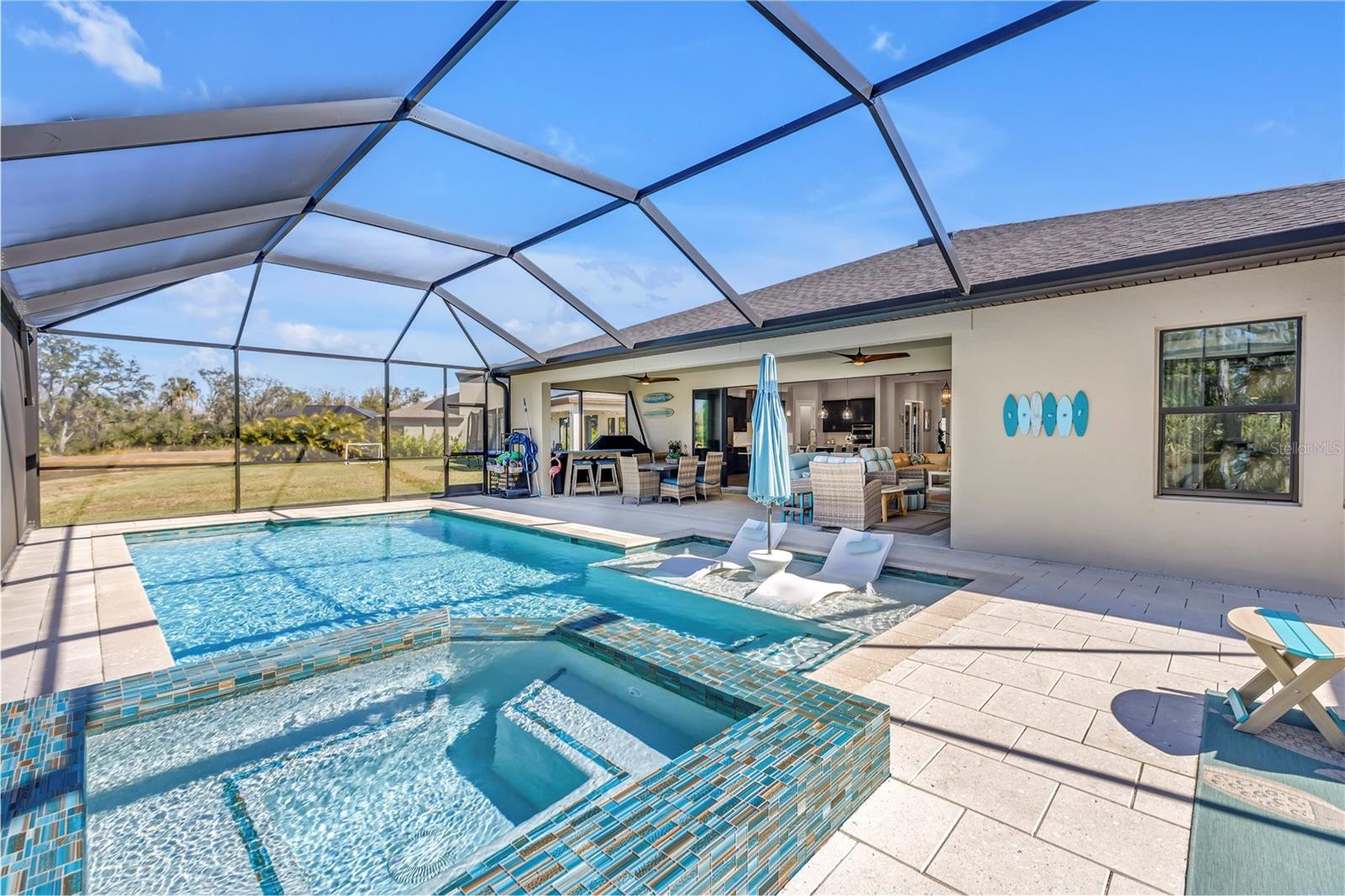 Absolute stunner on one of the best homesites in North River Ranch offering almost 2,600 sq ft of luxury living! This exceptional residence features an assumable 4.99% mortgage and a rare blend of elegance, privacy, and breathtaking natural surroundings. This thoughtfully designed home offers 3 bedrooms, 3 full bathrooms, plus a dedicated office, showcasing 11.5-foot ceilings, a grand entrance with soaring vaulted ceilings, and an expansive great room highlighted by custom beams and an impressive 24 feet of sliding glass doors that flood the space with natural light. The massive custom kitchen is perfect for entertaining and hosting large family gatherings, seamlessly connecting to the great room and outdoor living space while capturing stunning views. No expense spared with the custom window coverings, lighting and fans throughout the home. Step outside to the oversized screened lanai, where a custom 14x28 salt water pool and spa await, complemented by upgraded Shellock pavers designed to stay cool underfoot even during hot summer days. Beyond the screened area, enjoy a fenced side yard with a convenient built-in doggy door, creating an ideal setup for pets and outdoor living. The lanai and pool area are framed by a 50-foot panoramic view of private lush tropical trees and serene pond vistas. Enjoy nature at its finest with frequent sightings of deer, eagles, otters, and schools of fish, creating a peaceful and private retreat. The primary suite is a true owner’s retreat, featuring his and hers walk-in closets, including a spectacular custom-designed oversized closet, along with beautiful custom millwork throughout that adds warmth and panache. The spa-inspired primary bath offers a large walk-in shower with additional rain head, oversized soaking tub, and dual vanities. A large three-car garage provides ample space for vehicles, storage, and hobbies, enhancing the home’s functionality and appeal. Residents enjoy access to world-class amenities at Brightwood and Camp Creek, featuring resort-style pools, water slides, a state-of-the-art fitness center, game rooms, library, bike park, dog park, pickleball courts, playgrounds, and expansive parks—offering activities and entertainment for all ages. With nearly 2,600 square feet of luxury living, exceptional craftsmanship throughout, and one of the most desirable lots in the community, this home is a rare opportunity to own refined Florida living surrounded by nature.