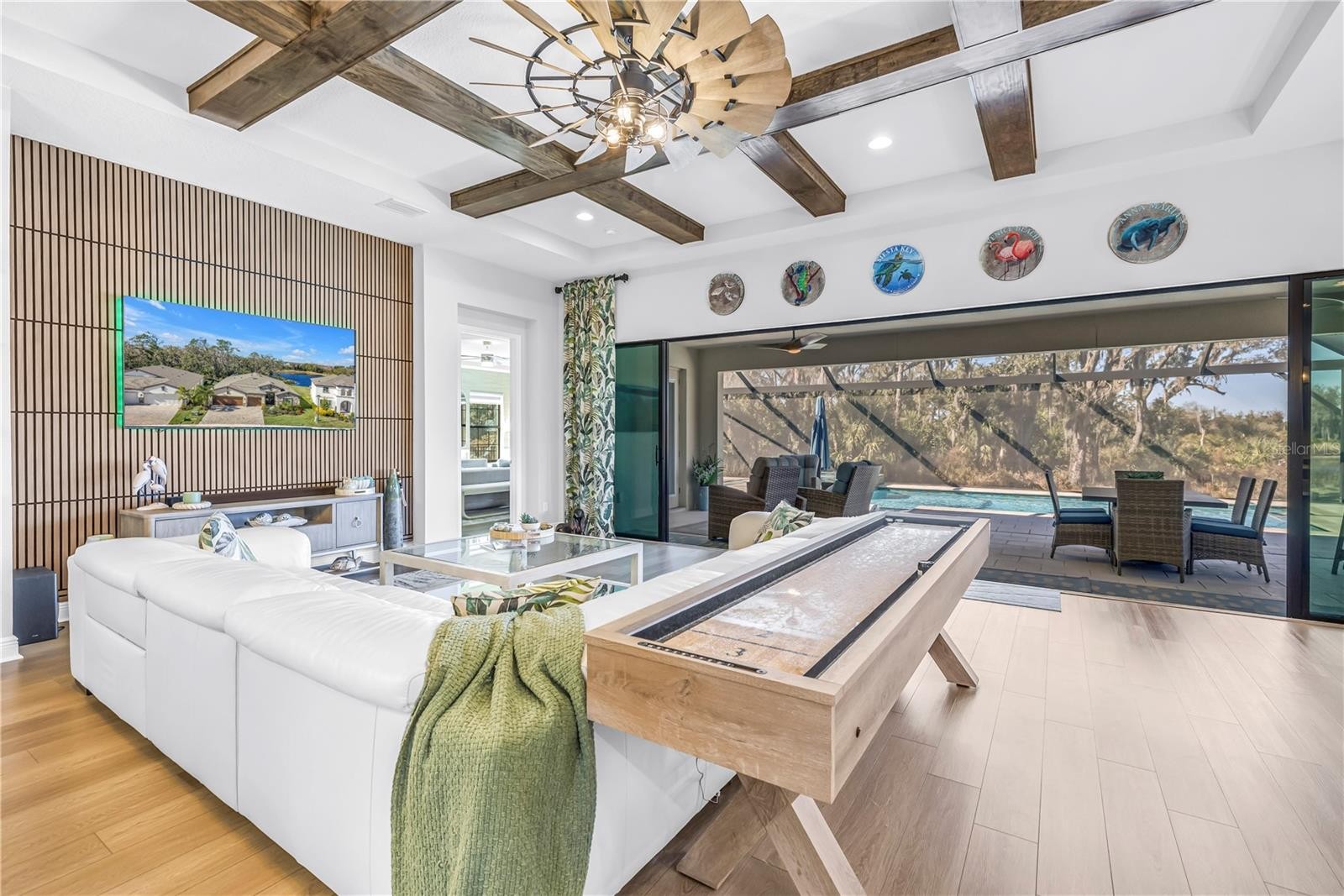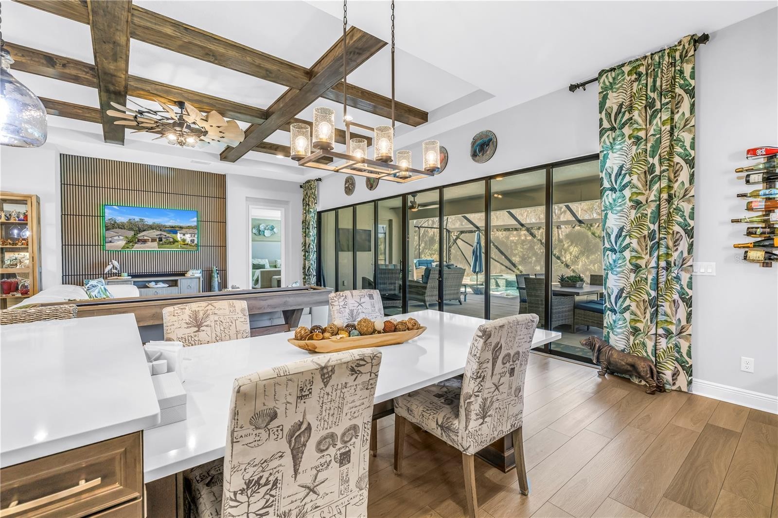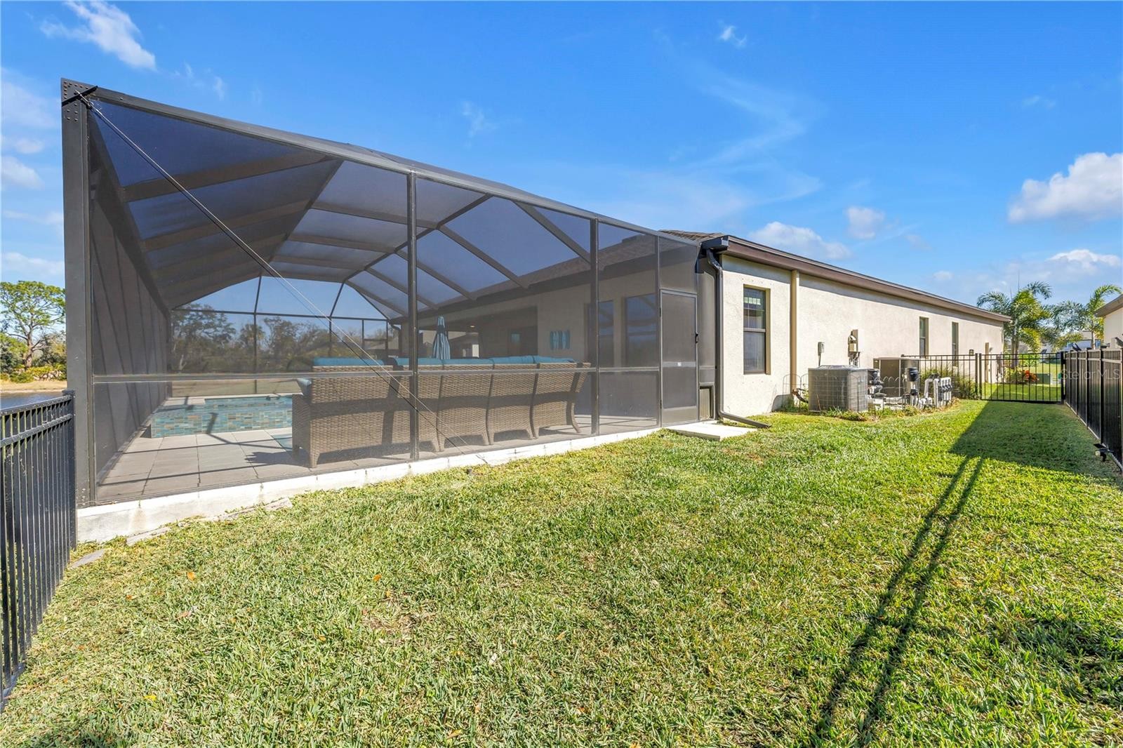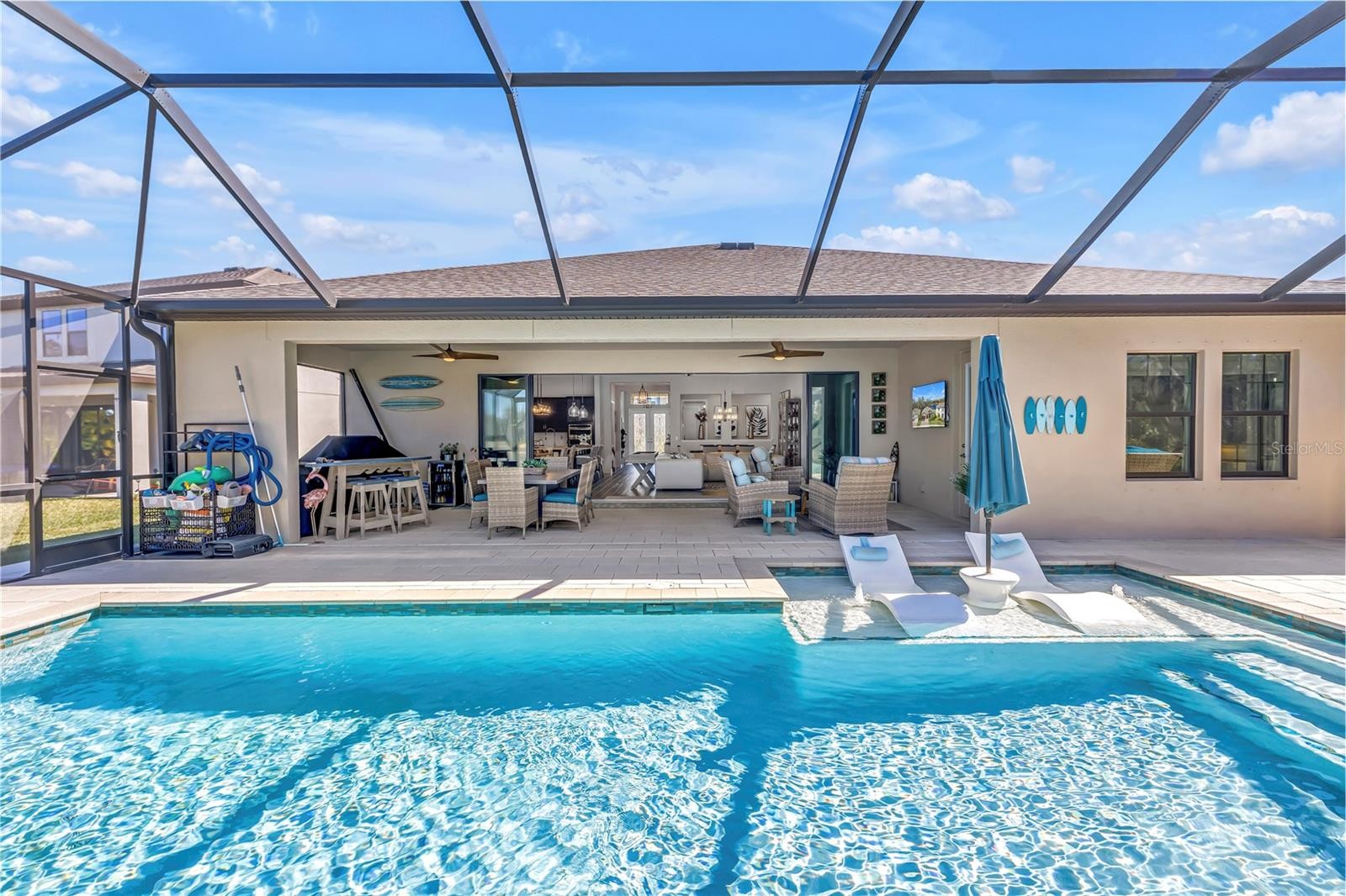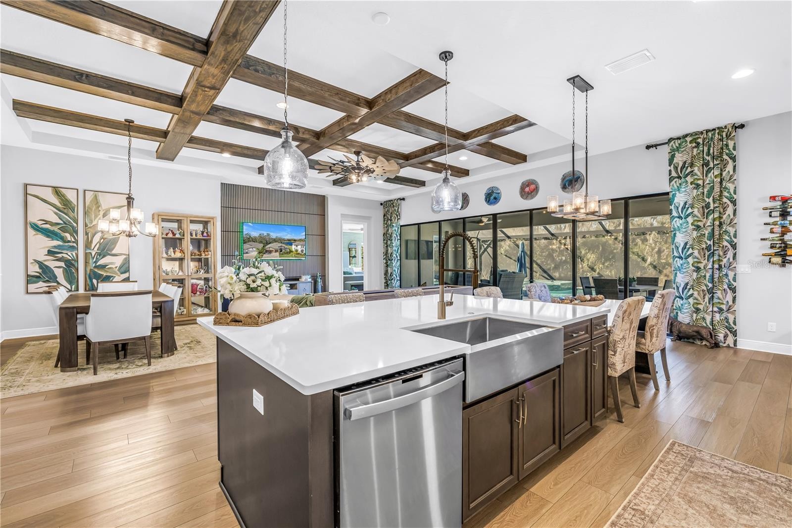 Absolute stunner on one of the best homesites in North River Ranch offering almost 2,600 sq ft of luxury living! This exceptional residence features an assumable 4.99% mortgage and a rare blend of elegance, privacy, and breathtaking natural surroundings. This thoughtfully designed home offers 3 bedrooms, 3 full bathrooms, plus a dedicated office, showcasing 11.5-foot ceilings, a grand entrance with soaring vaulted ceilings, and an expansive great room highlighted by custom beams and an impressive 24 feet of sliding glass doors that flood the space with natural light. The massive custom kitchen is perfect for entertaining and hosting large family gatherings, seamlessly connecting to the great room and outdoor living space while capturing stunning views. No expense spared with the custom window coverings, lighting and fans throughout the home. Step outside to the oversized screened lanai, where a custom 14x28 salt water pool and spa await, complemented by upgraded Shellock pavers designed to stay cool underfoot even during hot summer days. Beyond the screened area, enjoy a fenced side yard with a convenient built-in doggy door, creating an ideal setup for pets and outdoor living. The lanai and pool area are framed by a 50-foot panoramic view of private lush tropical trees and serene pond vistas. Enjoy nature at its finest with frequent sightings of deer, eagles, otters, and schools of fish, creating a peaceful and private retreat. The primary suite is a true owner’s retreat, featuring his and hers walk-in closets, including a spectacular custom-designed oversized closet, along with beautiful custom millwork throughout that adds warmth and panache. The spa-inspired primary bath offers a large walk-in shower with additional rain head, oversized soaking tub, and dual vanities. A large three-car garage provides ample space for vehicles, storage, and hobbies, enhancing the home’s functionality and appeal. Residents enjoy access to world-class amenities at Brightwood and Camp Creek, featuring resort-style pools, water slides, a state-of-the-art fitness center, game rooms, library, bike park, dog park, pickleball courts, playgrounds, and expansive parks—offering activities and entertainment for all ages. With nearly 2,600 square feet of luxury living, exceptional craftsmanship throughout, and one of the most desirable lots in the community, this home is a rare opportunity to own refined Florida living surrounded by nature.