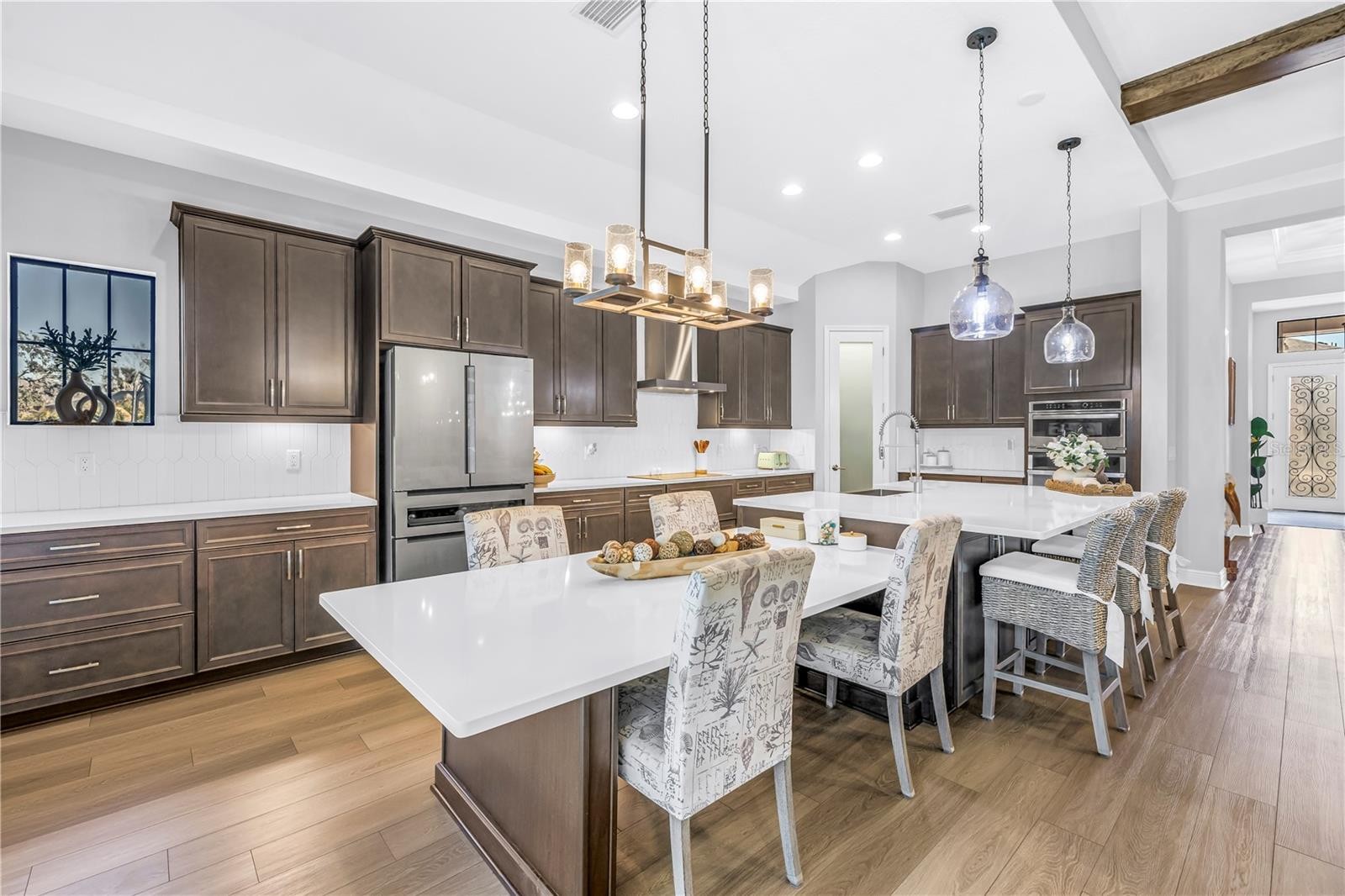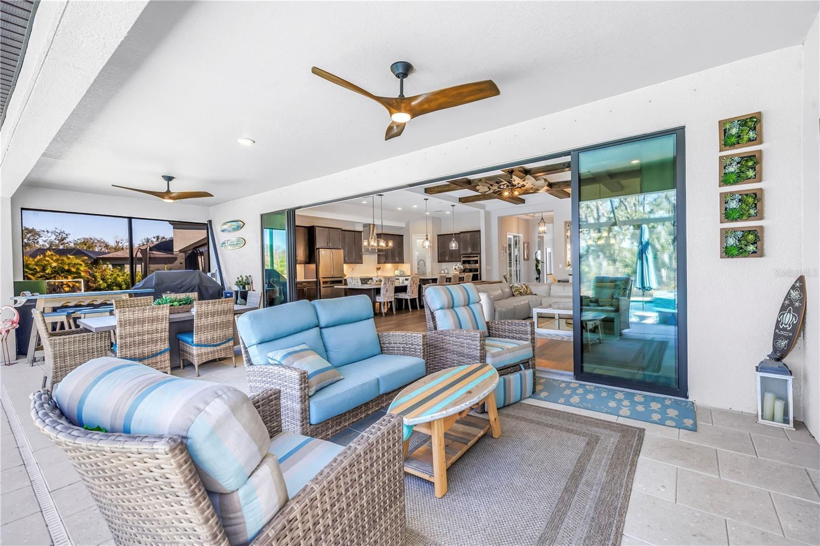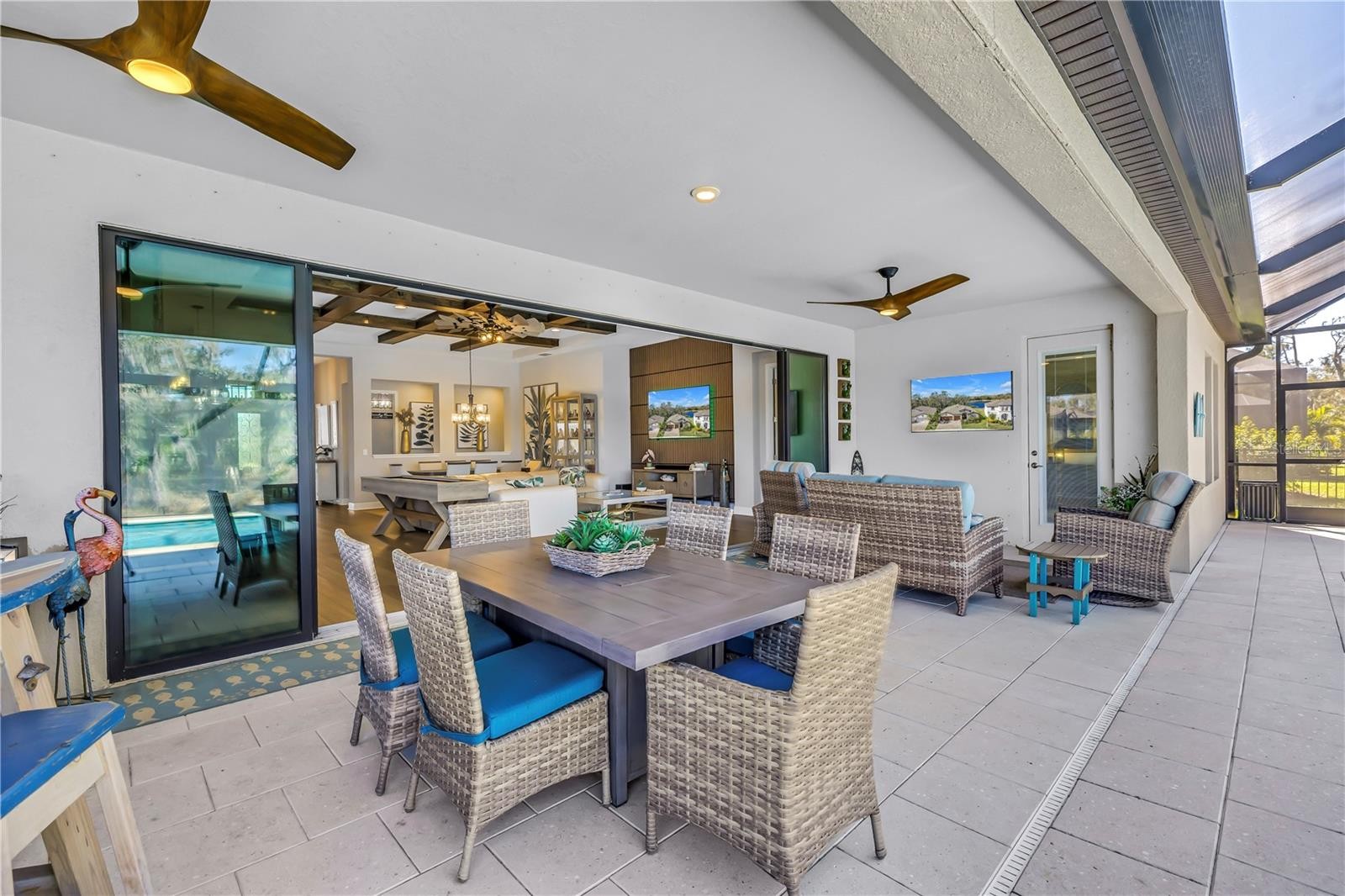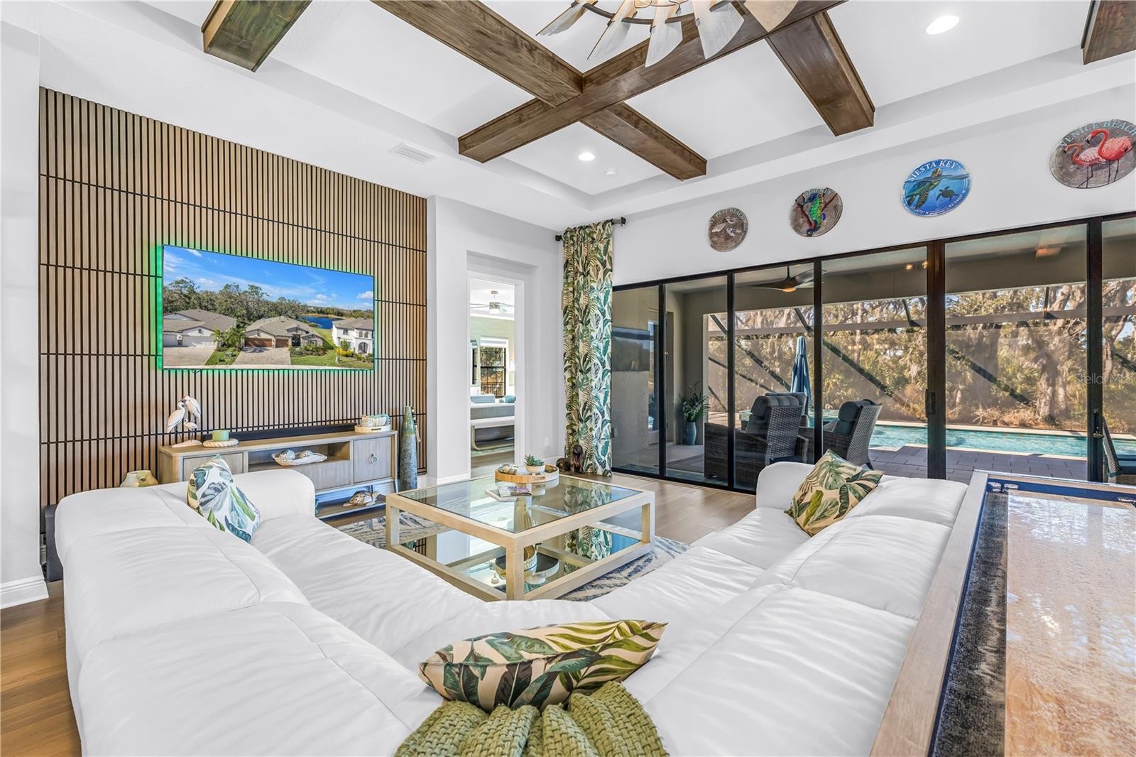 Absolute stunner on one of the best homesites in North River Ranch offering almost 2,600 sq ft of luxury living! This exceptional residence features an assumable 4.99% mortgage and a rare blend of elegance, privacy, and breathtaking natural surroundings. This thoughtfully designed home offers 3 bedrooms, 3 full bathrooms, plus a dedicated office, showcasing 11.5-foot ceilings, a grand entrance with soaring vaulted ceilings, and an expansive great room highlighted by custom beams and an impressive 24 feet of sliding glass doors that flood the space with natural light. The massive custom kitchen is perfect for entertaining and hosting large family gatherings, seamlessly connecting to the great room and outdoor living space while capturing stunning views. No expense spared with the custom window coverings, lighting and fans throughout the home. Step outside to the oversized screened lanai, where a custom 14x28 salt water pool and spa await, complemented by upgraded Shellock pavers designed to stay cool underfoot even during hot summer days. Beyond the screened area, enjoy a fenced side yard with a convenient built-in doggy door, creating an ideal setup for pets and outdoor living. The lanai and pool area are framed by a 50-foot panoramic view of private lush tropical trees and serene pond vistas. Enjoy nature at its finest with frequent sightings of deer, eagles, otters, and schools of fish, creating a peaceful and private retreat. The primary suite is a true owner’s retreat, featuring his and hers walk-in closets, including a spectacular custom-designed oversized closet, along with beautiful custom millwork throughout that adds warmth and panache. The spa-inspired primary bath offers a large walk-in shower with additional rain head, oversized soaking tub, and dual vanities. A large three-car garage provides ample space for vehicles, storage, and hobbies, enhancing the home’s functionality and appeal. Residents enjoy access to world-class amenities at Brightwood and Camp Creek, featuring resort-style pools, water slides, a state-of-the-art fitness center, game rooms, library, bike park, dog park, pickleball courts, playgrounds, and expansive parks—offering activities and entertainment for all ages. With nearly 2,600 square feet of luxury living, exceptional craftsmanship throughout, and one of the most desirable lots in the community, this home is a rare opportunity to own refined Florida living surrounded by nature.