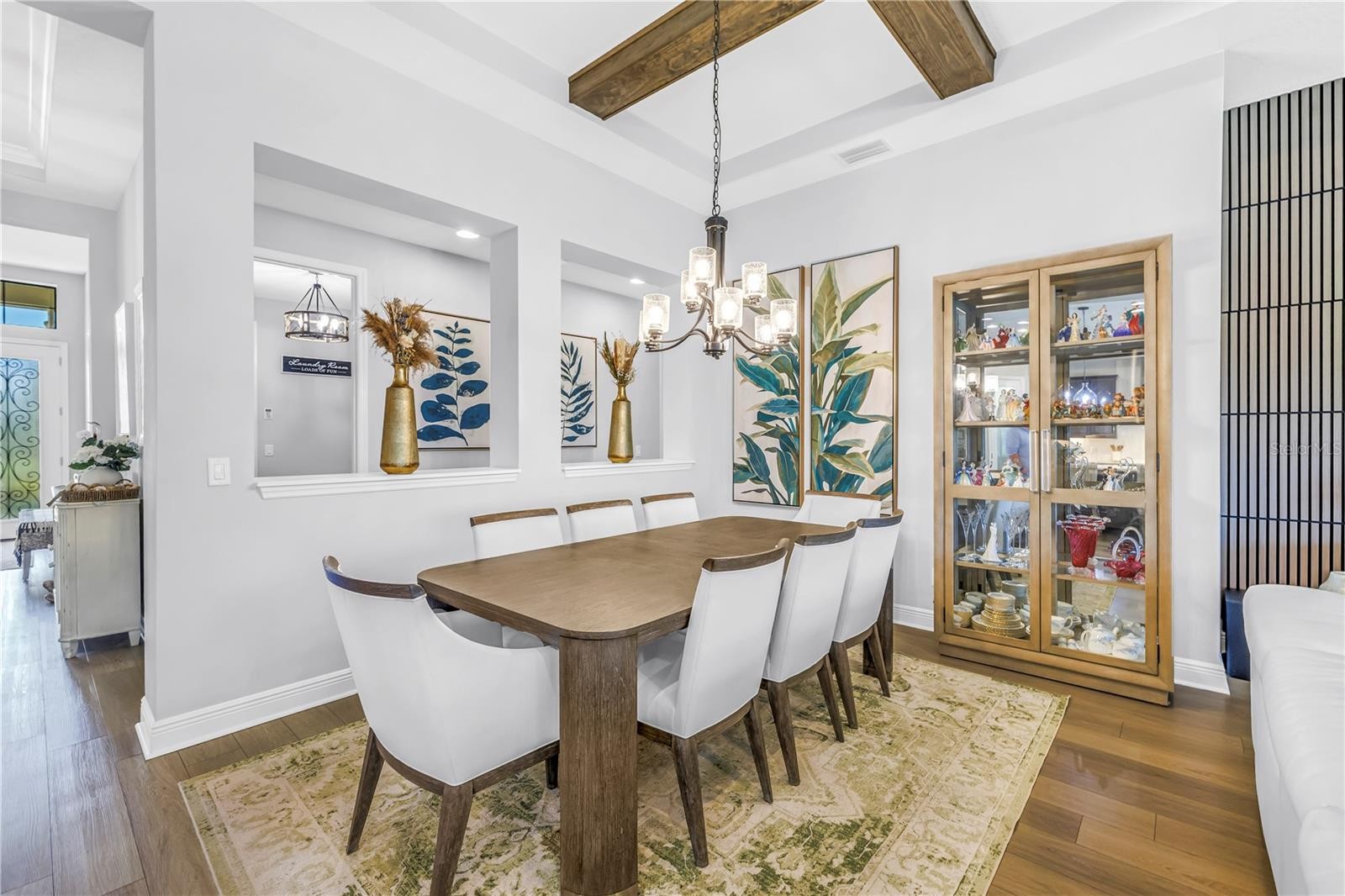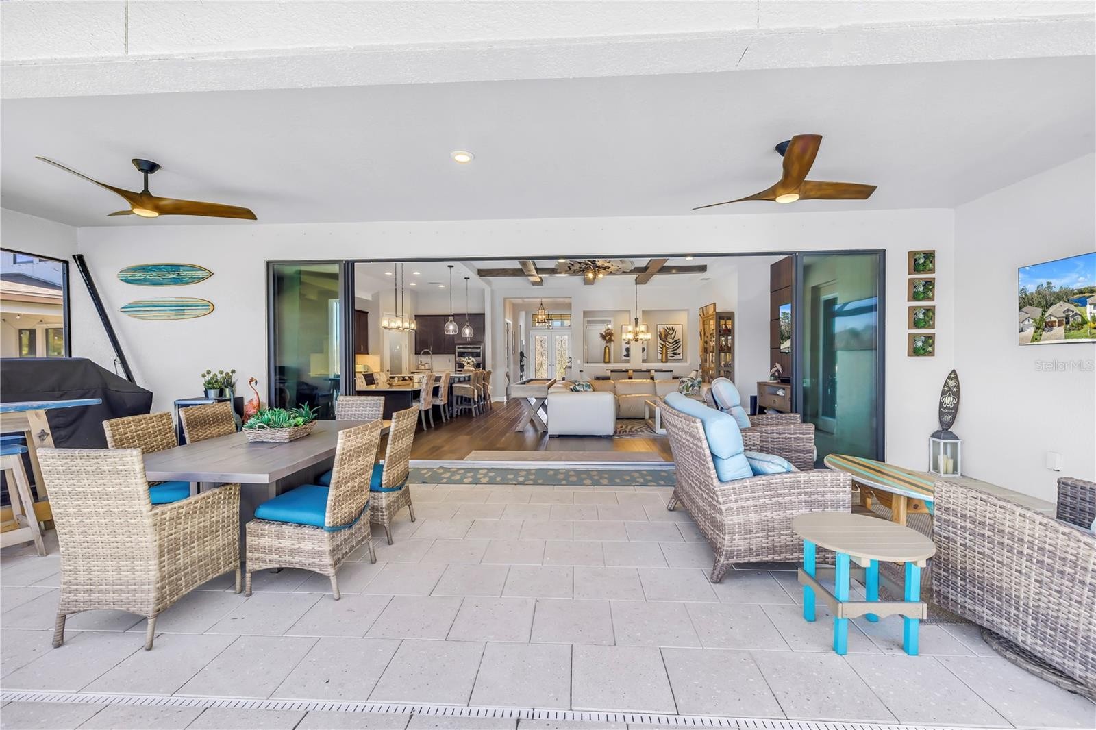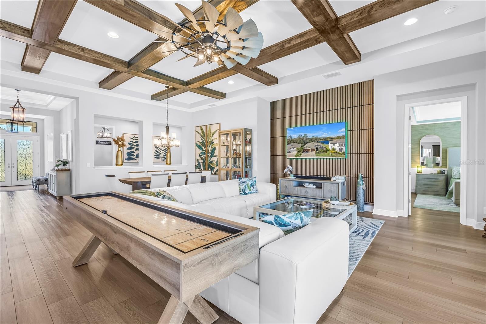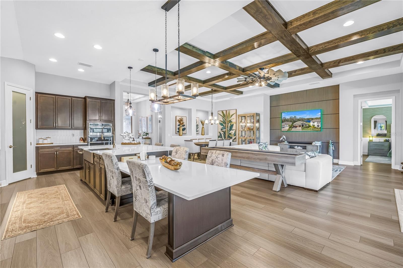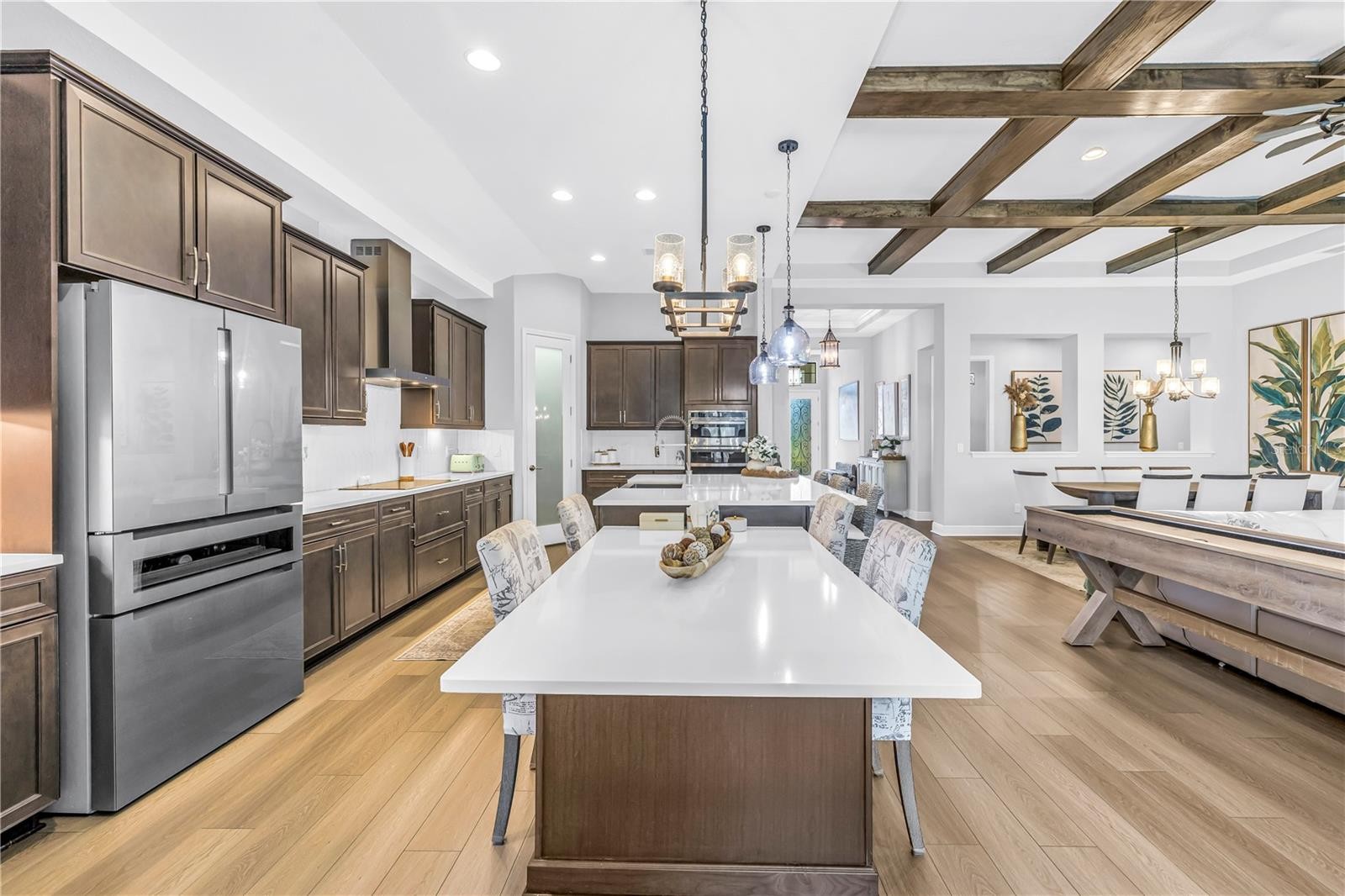 Absolute stunner on one of the best homesites in North River Ranch offering almost 2,600 sq ft of luxury living! This exceptional residence features an assumable 4.99% mortgage and a rare blend of elegance, privacy, and breathtaking natural surroundings. This thoughtfully designed home offers 3 bedrooms, 3 full bathrooms, plus a dedicated office, showcasing 11.5-foot ceilings, a grand entrance with soaring vaulted ceilings, and an expansive great room highlighted by custom beams and an impressive 24 feet of sliding glass doors that flood the space with natural light. The massive custom kitchen is perfect for entertaining and hosting large family gatherings, seamlessly connecting to the great room and outdoor living space while capturing stunning views. No expense spared with the custom window coverings, lighting and fans throughout the home. Step outside to the oversized screened lanai, where a custom 14x28 salt water pool and spa await, complemented by upgraded Shellock pavers designed to stay cool underfoot even during hot summer days. Beyond the screened area, enjoy a fenced side yard with a convenient built-in doggy door, creating an ideal setup for pets and outdoor living. The lanai and pool area are framed by a 50-foot panoramic view of private lush tropical trees and serene pond vistas. Enjoy nature at its finest with frequent sightings of deer, eagles, otters, and schools of fish, creating a peaceful and private retreat. The primary suite is a true owner’s retreat, featuring his and hers walk-in closets, including a spectacular custom-designed oversized closet, along with beautiful custom millwork throughout that adds warmth and panache. The spa-inspired primary bath offers a large walk-in shower with additional rain head, oversized soaking tub, and dual vanities. A large three-car garage provides ample space for vehicles, storage, and hobbies, enhancing the home’s functionality and appeal. Residents enjoy access to world-class amenities at Brightwood and Camp Creek, featuring resort-style pools, water slides, a state-of-the-art fitness center, game rooms, library, bike park, dog park, pickleball courts, playgrounds, and expansive parks—offering activities and entertainment for all ages. With nearly 2,600 square feet of luxury living, exceptional craftsmanship throughout, and one of the most desirable lots in the community, this home is a rare opportunity to own refined Florida living surrounded by nature.