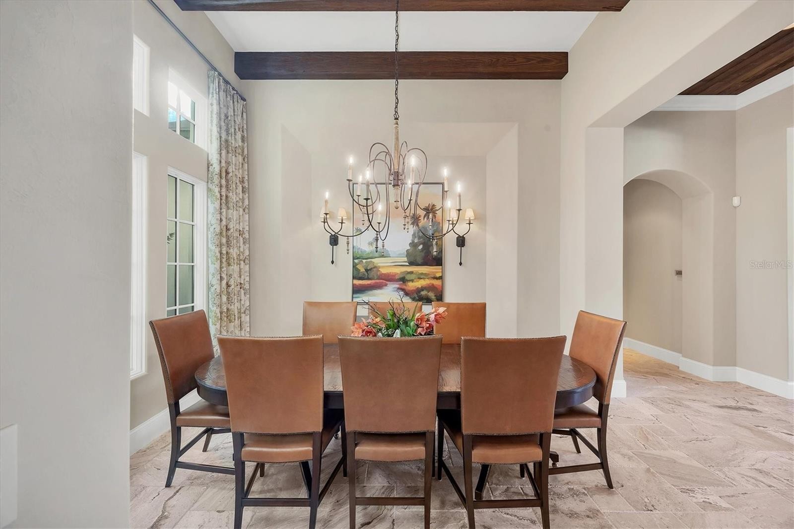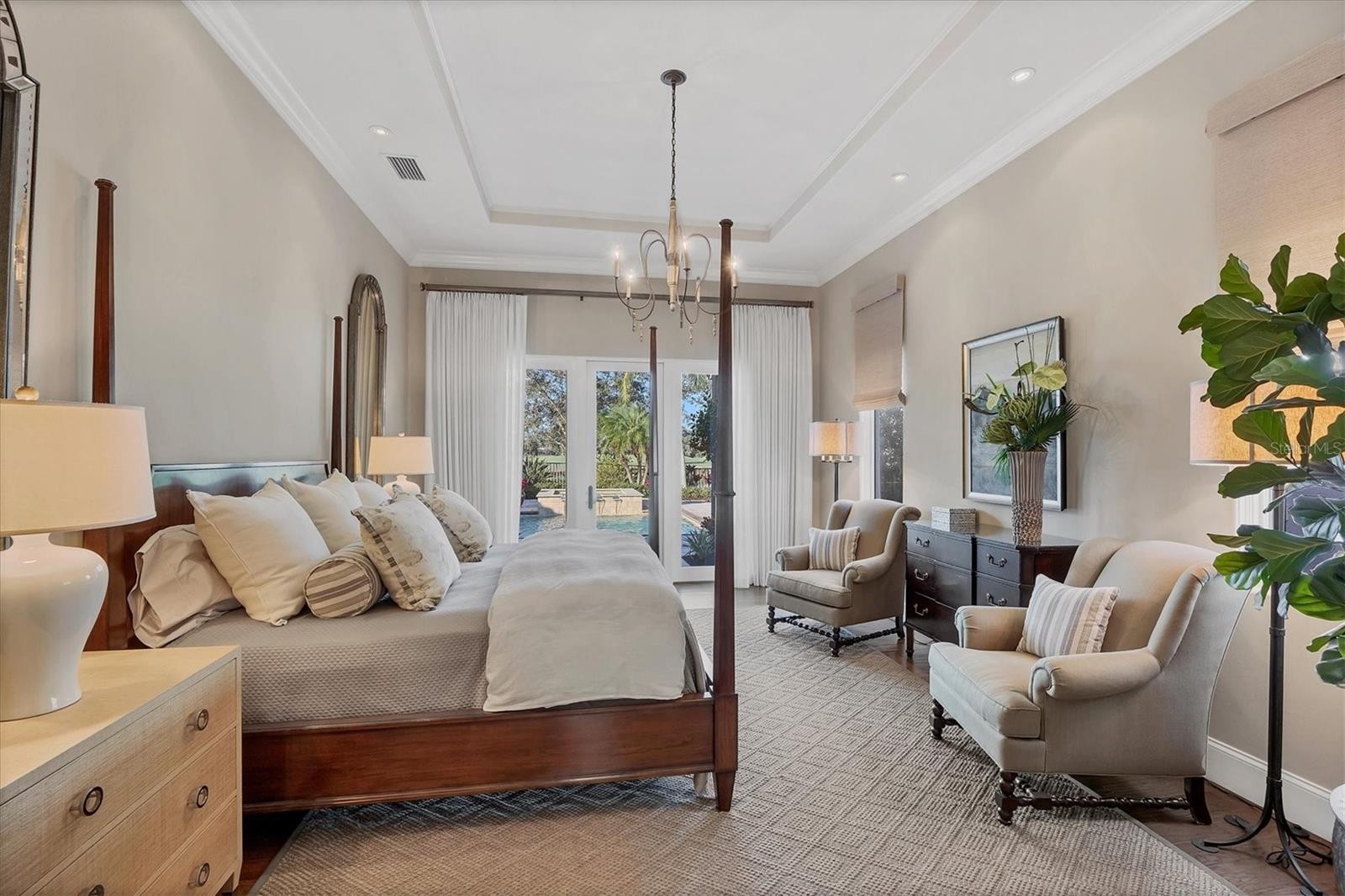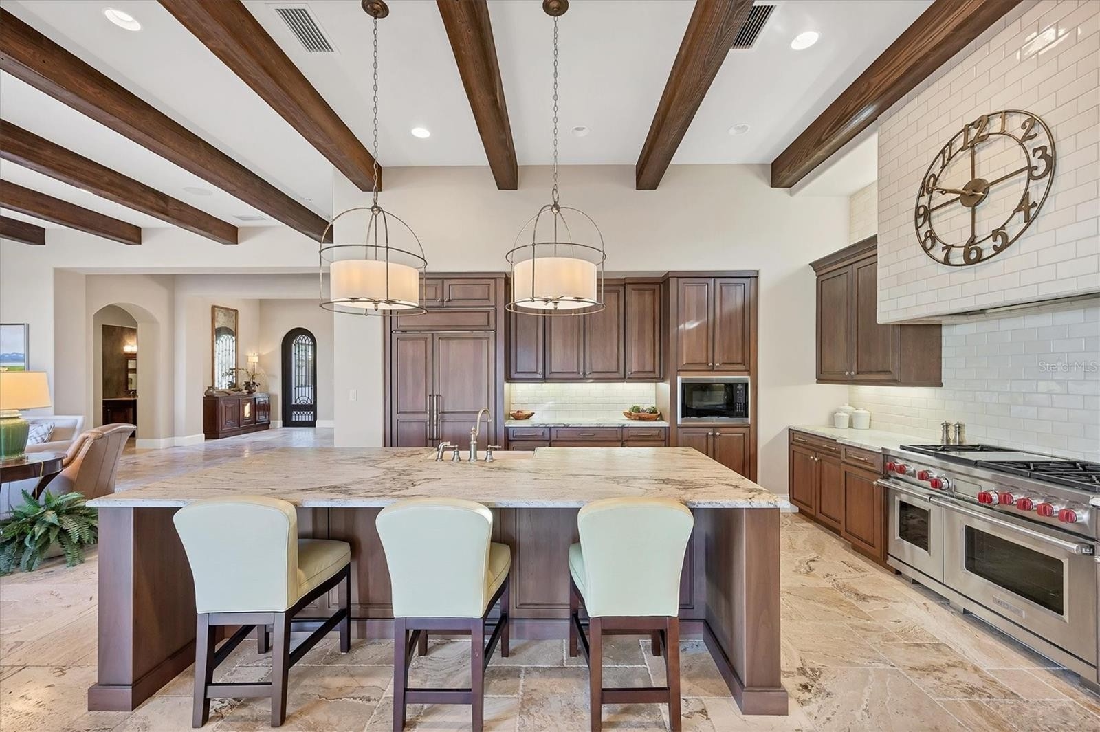 An exceptional former London Bay Homes model, this fully furnished estate residence makes a striking first impression with its timeless architectural façade, refined stone accents, and elegant arched details, all set amid lush landscaping on a private cul-de-sac. Thoughtfully curated with designer selected finishes throughout, the home blends classic sophistication with contemporary luxury. A dramatic single iron and glass arched entry door opens to an elegant open floor plan adorned with Turkish travertine flooring and exceptional architectural detailing throughout, including custom window treatments. The stunning great room is highlighted by a rustic beam ceiling and flows effortlessly into the formal dining room and gourmet inspired kitchen. Designer cabinetry and premium appliances are complemented by leathered granite countertops, a freestanding island with breakfast bar. The expansive casual dining area features a ceiling wrapped in richly toned wood planks as it flows effortlessly to the covered outdoor living space, enhanced by oversized glass pocketing sliders for true indoor-outdoor living. The stately office provides a refined and private workspace, ideal for today’s lifestyle. The luxurious primary suite serves as a serene retreat, featuring dual walk-in closets with custom built-in closet systems and a private door leading directly to the outdoor living area. Two spacious guest suites, each with its own ensuite bath, are thoughtfully positioned in a private wing on the opposite side of the home, offering exceptional comfort and privacy for guests. Outdoors, graceful arches frame sweeping sunset views over the golf course and lake, extending to a resort-style living space complete with an outdoor kitchen with professional grade grill, motorized retractable screens leading out to the tranquil pool with sun shelf and raised spa with waterfalls. This exceptional residence delivers an unparalleled lifestyle of privacy, elegance, and resort-style living in one of Sarasota’s most prestigious golf communities. The Founders Club offers an unparalleled lifestyle surrounded by 700 acres of natural Florida beauty. With just 262 homesites, this low-density enclave is designed for privacy and serenity. Residents enjoy access to a recreation center offering yoga and pilates classes, as well as Har-Tru tennis courts, pickleball, basketball, sand volleyball, and a kid's playground. Membership at the Founders Golf Club is optional offering both golf and social memberships. The renowned Robert Trent Jones Jr. golf course offers members easy tee times and is one of the only walkable courses in the region. Members enjoy a a grand Southern-style clubhouse, fine dining, a year-round social calendar, and a 24/7 fitness facility. It’s more than a home, it’s a lifestyle curated for those who appreciate understated luxury and quiet prestige. All just minutes from exquisite dining, shopping, and the vibrant art scene of downtown Sarasota, as well as Sarasota's incredible beaches.