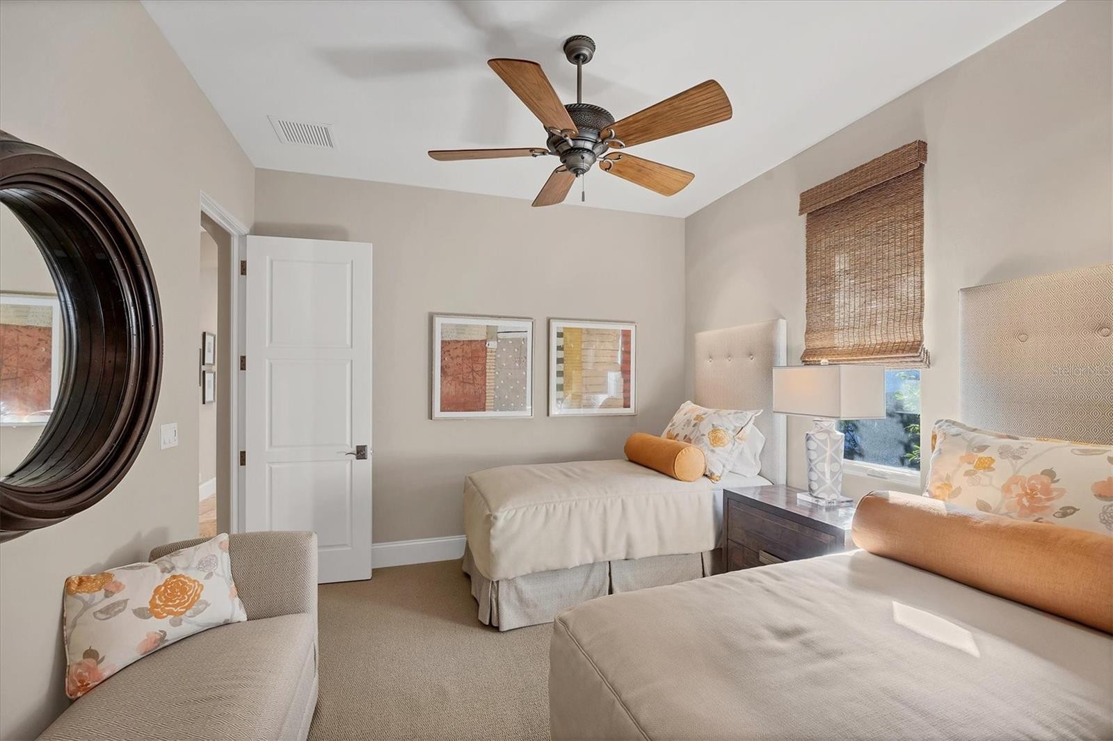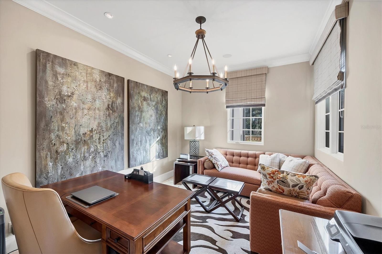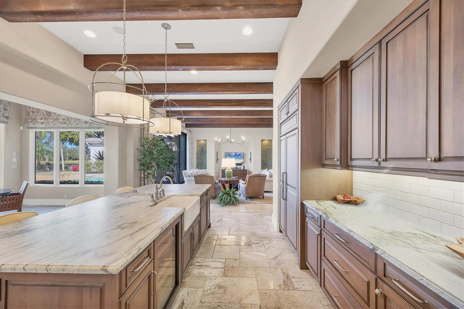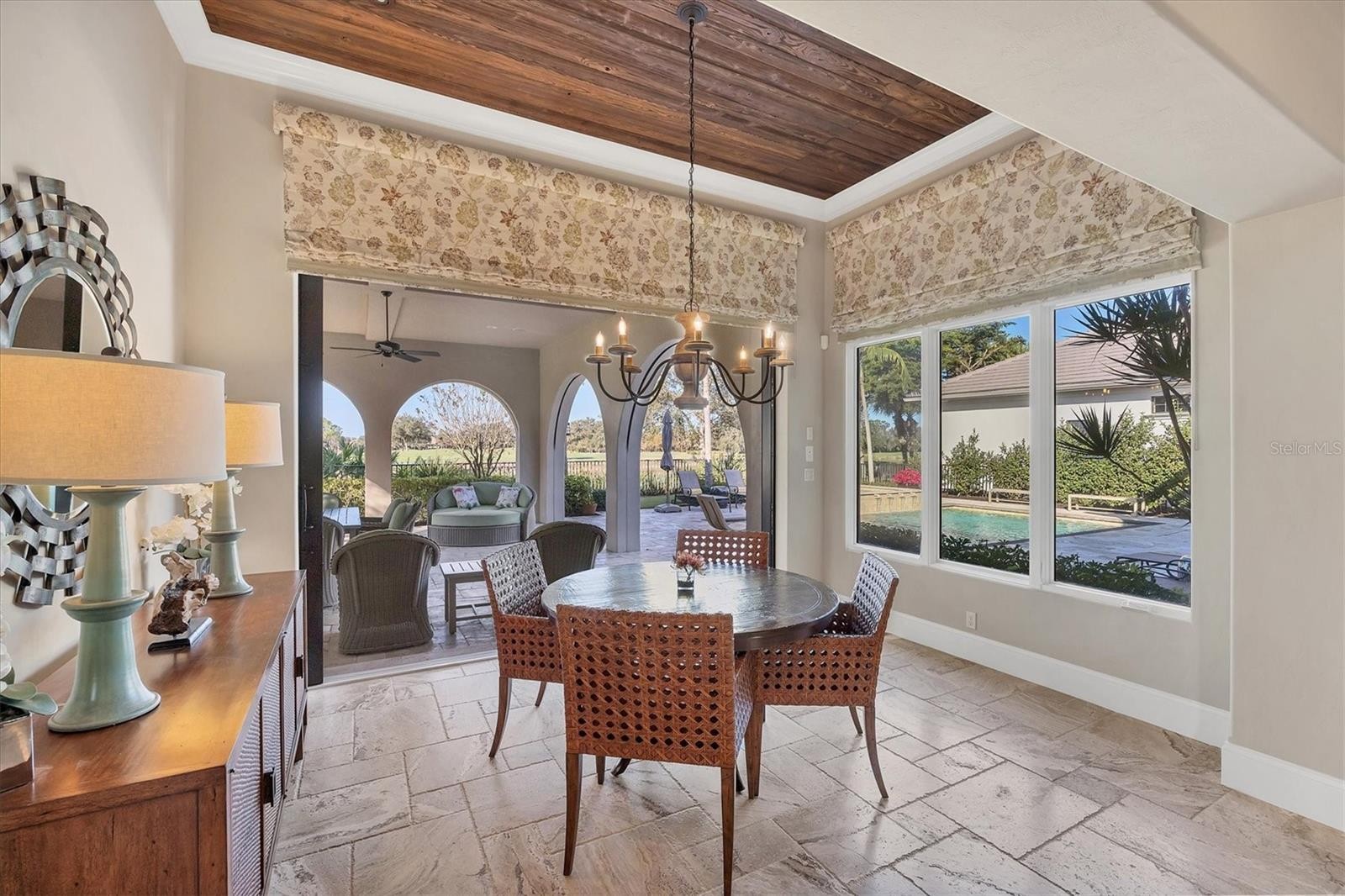 An exceptional former London Bay Homes model, this fully furnished estate residence makes a striking first impression with its timeless architectural façade, refined stone accents, and elegant arched details, all set amid lush landscaping on a private cul-de-sac. Thoughtfully curated with designer selected finishes throughout, the home blends classic sophistication with contemporary luxury. A dramatic single iron and glass arched entry door opens to an elegant open floor plan adorned with Turkish travertine flooring and exceptional architectural detailing throughout, including custom window treatments. The stunning great room is highlighted by a rustic beam ceiling and flows effortlessly into the formal dining room and gourmet inspired kitchen. Designer cabinetry and premium appliances are complemented by leathered granite countertops, a freestanding island with breakfast bar. The expansive casual dining area features a ceiling wrapped in richly toned wood planks as it flows effortlessly to the covered outdoor living space, enhanced by oversized glass pocketing sliders for true indoor-outdoor living. The stately office provides a refined and private workspace, ideal for today’s lifestyle. The luxurious primary suite serves as a serene retreat, featuring dual walk-in closets with custom built-in closet systems and a private door leading directly to the outdoor living area. Two spacious guest suites, each with its own ensuite bath, are thoughtfully positioned in a private wing on the opposite side of the home, offering exceptional comfort and privacy for guests. Outdoors, graceful arches frame sweeping sunset views over the golf course and lake, extending to a resort-style living space complete with an outdoor kitchen with professional grade grill, motorized retractable screens leading out to the tranquil pool with sun shelf and raised spa with waterfalls. This exceptional residence delivers an unparalleled lifestyle of privacy, elegance, and resort-style living in one of Sarasota’s most prestigious golf communities. The Founders Club offers an unparalleled lifestyle surrounded by 700 acres of natural Florida beauty. With just 262 homesites, this low-density enclave is designed for privacy and serenity. Residents enjoy access to a recreation center offering yoga and pilates classes, as well as Har-Tru tennis courts, pickleball, basketball, sand volleyball, and a kid's playground. Membership at the Founders Golf Club is optional offering both golf and social memberships. The renowned Robert Trent Jones Jr. golf course offers members easy tee times and is one of the only walkable courses in the region. Members enjoy a a grand Southern-style clubhouse, fine dining, a year-round social calendar, and a 24/7 fitness facility. It’s more than a home, it’s a lifestyle curated for those who appreciate understated luxury and quiet prestige. All just minutes from exquisite dining, shopping, and the vibrant art scene of downtown Sarasota, as well as Sarasota's incredible beaches.