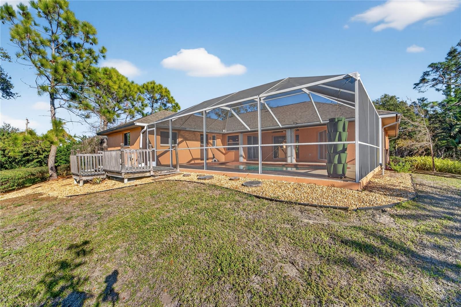 Discover the perfect blend of privacy, space, and opportunity on this beautifully wooded 3.14-acre estate just minutes from the heart of Venice and less than two miles to the beach. Tucked behind a gated entrance, this serene country retreat offers over 2,000 square feet of comfortable living with three bedrooms and two bathrooms, thoughtfully designed for both everyday living and entertaining. Inside, enjoy the warmth and charm of a wood-burning fireplace, while multiple sliding glass doors throughout the home open directly to the heated pool, creating a true indoor-outdoor lifestyle. Surrounded by mature trees and natural beauty, the property features a peaceful pond, providing a tranquil backdrop for relaxation and outdoor living. The home has been built up higher for added peace of mind regarding flooding, has hurricane shutters on the screened in lanai and is zoned to allow for subdividing, offering exceptional flexibility for a multi-home compound, future investment, or long-term planning. Major updates include a 2018 roof with transferrable warranty, 2025 air conditioning system, and 2024 hot water heater, delivering confidence and reduced maintenance. With well and septic in place, this private oasis offers the freedom of country living without sacrificing proximity to shopping, dining, and the Gulf beaches nearby. A rare opportunity to own a gated acreage property where privacy, lifestyle, and long-term potential come together—just minutes from Venice and the gulf coast.