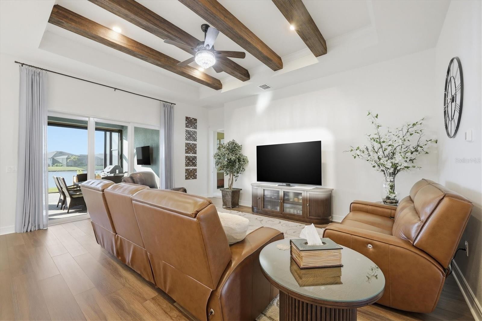 The reasons buyers love the PRESTIGE floorplan are many. A half bath for guests. A primary bedroom that features two walk-in closets. An additional oversized walk-in storage closet- just across from the kitchen. BUT it is the soaring 11ft ceilings that allow this home to feel much larger than 2080 sq ft! Inside this home, the wow continues as the sellers added wood-look beams in the foyer and gathering room, a perfectly placed drop zone just inside the garage. Speaking of the garage, there are solidly built high storage units. Outside, remote-controlled storm screens serve a dual purpose- safety but also keep the cooled or warmed air inside for additional entertaining space. A big, beautiful southerly pond view is visible from the Cafe, Gathering Room and Primary bedroom. Impact windows and doors provide safety and soundproofing; a Super shower with bench in the primary ensuite allows for aging in place and the guest bath has a walk-in shower also. The extended covered lanai and screened patio offers everything anyone could want in a Florida home. Located in the very active and competitive Del Webb Bay View where you can be as busy as you want to be! Pickleball, Tennis, Bocce, Table tennis, shuffleboard, etc. A heated resort style pool, resistance pool and lap pool, hot tub, community garden, clubs galore and with a restaurant on site, Bay View is golf cart friendly. Not to be forgotten- Two dog parks for our furry friends. Located 1.5 miles from I75 and 275.