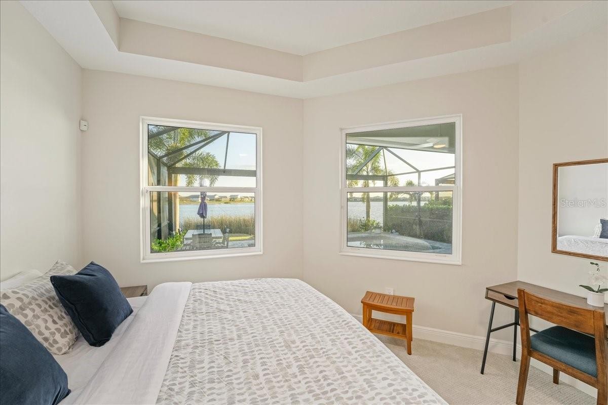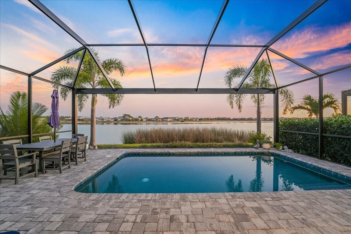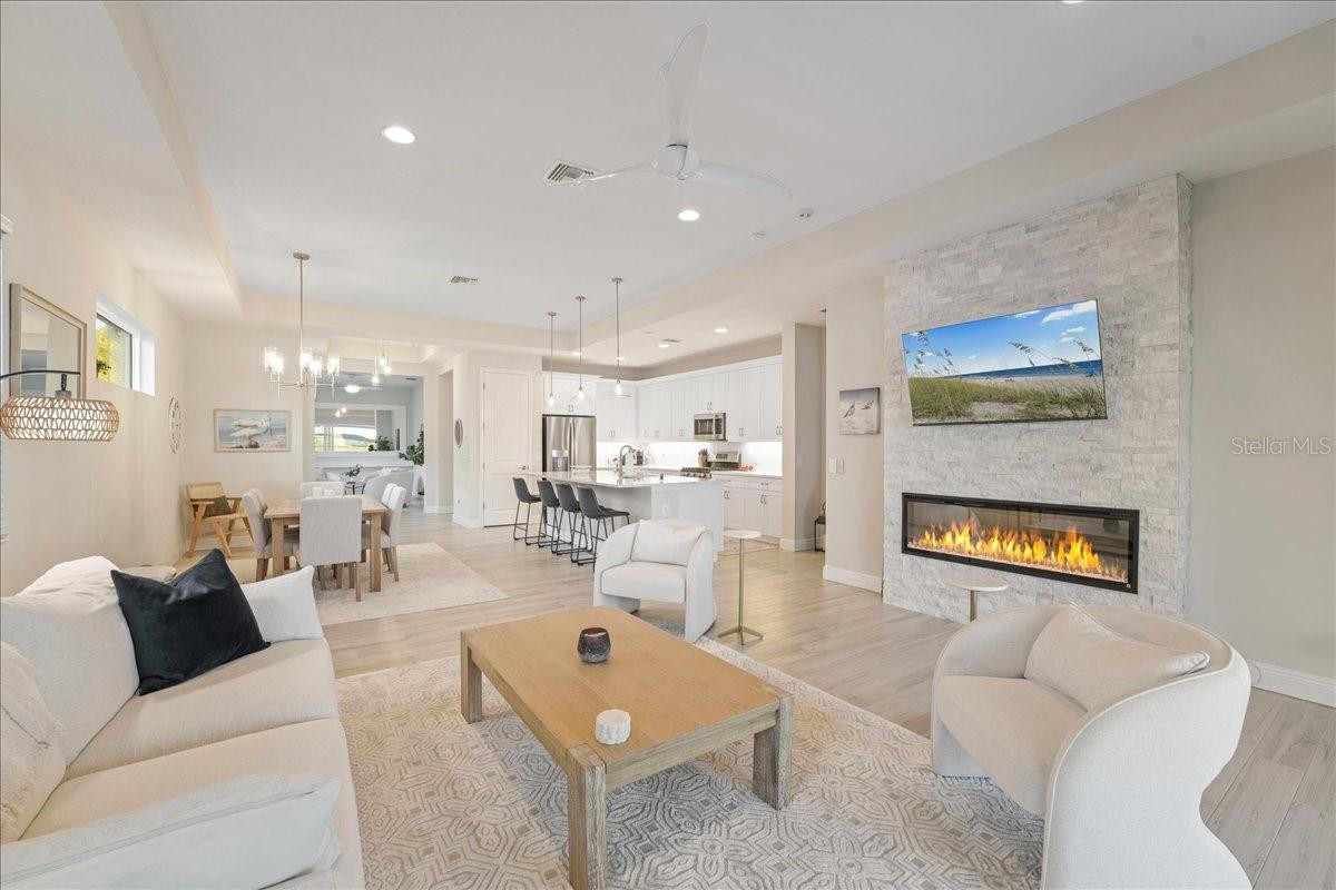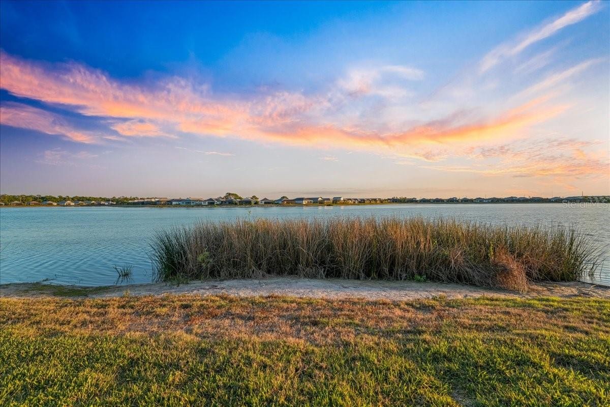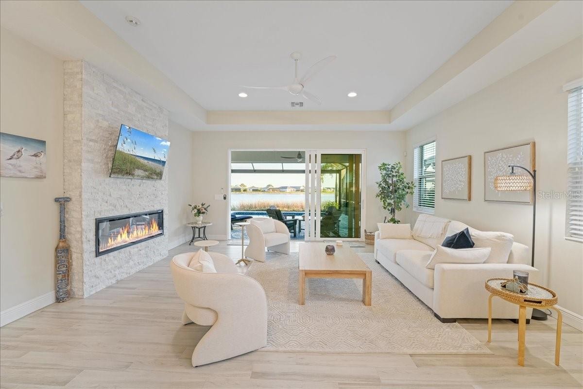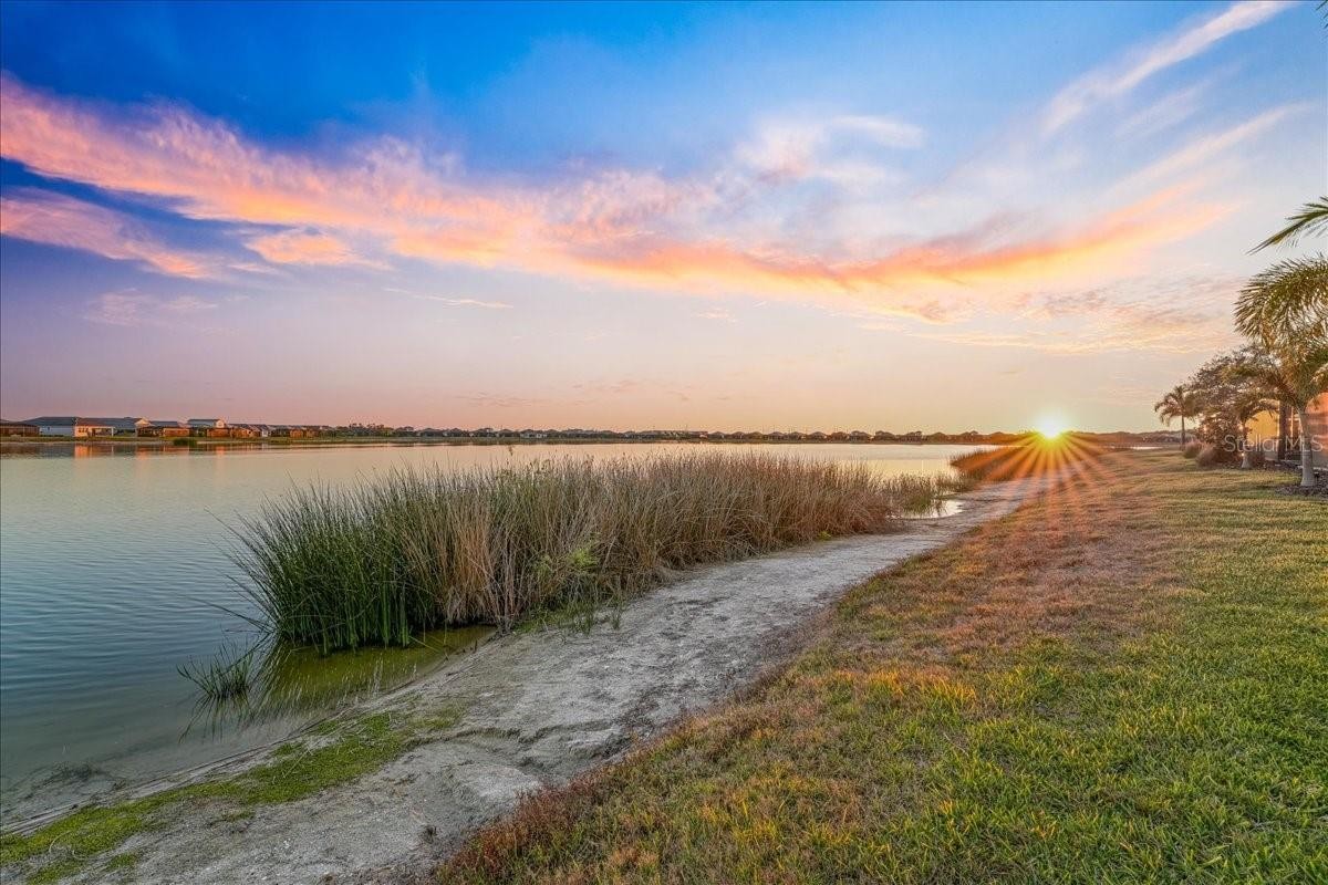 Under contract-accepting backup offers. Wake up to shimmering lake views and unforgettable sunsets in this beautifully designed waterfront residence at Lakehouse Cove at Waterside. Thoughtfully crafted in 2022 by Homes by Towne, this 3 Bedroom + Den Skiff floor plan offers the perfect blend of modern elegance, comfort, and effortless indoor-outdoor living. Inside, the open-concept layout is filled with natural light and showcases refined finishes throughout, including quartz countertops, custom cabinetry, under-cabinet lighting, a custom stone fireplace and custom mirror & moldings. The heart of the home flows seamlessly into a spacious living and dining area, creating an inviting space for everyday living and entertaining alike. Step through expansive sliders to a screened lanai that captures wide-open lake views — an ideal spot to enjoy your morning coffee or unwind at sunset. The outdoor setting feels like a private retreat, perfectly positioned for peaceful mornings and evening gatherings. The primary suite offers a tranquil escape with serene water views and a spa-inspired bath featuring dual vanities and elegant finishes. Two additional bedrooms, two full bathrooms, and a versatile den or home office provide flexibility for guests, work-from-home needs, or creative space. A dedicated laundry room and two-car garage add everyday convenience, while thoughtful upgrades throughout enhance both style and functionality. Lakehouse Cove delivers a true resort-style lifestyle with amenities that include a pool and spa, clubhouse with catering kitchen, fitness center, kayak launch, boating access, pickleball courts, fire pits, and scenic gathering areas designed for both relaxation and connection. Ideally located just minutes from Waterside Place, Lakewood Ranch Main Street, world-class beaches, dining, shopping, and Sarasota-Bradenton International Airport, this home offers effortless access to the best of the Gulf Coast lifestyle. This is a rare opportunity to enjoy waterfront living in one of Sarasota’s most sought-after communities — where every day feels like a getaway.