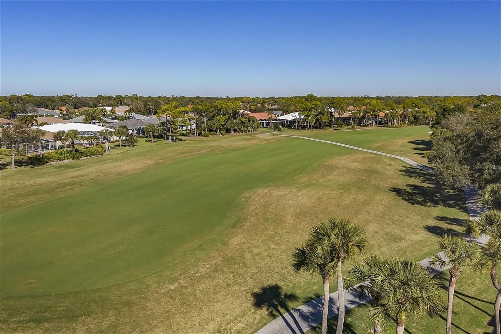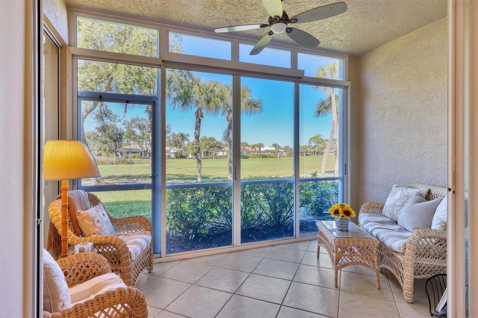 This highly sought-after first-floor condo, in Stoneybrook Golf & Country Club, offers 2 bedrooms, 2 full baths, front and rear lanais, and a detached garage. Thoughtfully updated, the residence features newer appliances, tile flooring throughout the main living areas, and a glass-enclosed rear lanai—perfect for enjoying year-round indoor-outdoor living. Enjoy serene views of the 18th fairway with a picturesque backdrop of a pond, palm trees, and mature live oaks. Located in Veranda Greens North, residents enjoy a nearby community pool and tennis court, along with full access to the exceptional Stoneybrook Golf & Country Club lifestyle. Amenities include a recently modernized 18-hole championship golf course, tennis, fitness center, pro shop, bocce ball, and a restaurant with both indoor and outdoor dining, plus a full bar. Ideally situated near the Legacy Trail and just minutes from Nokomis Beach, Siesta Key Beach, shopping, dining, and entertainment. This unit is being sold turnkey furnished, making it truly move-in ready. As an added value, the seller has paid the 2024 golf course modernization assessment in full saving the buyer over $6,000. More than a home, this is the Stoneybrook lifestyle.