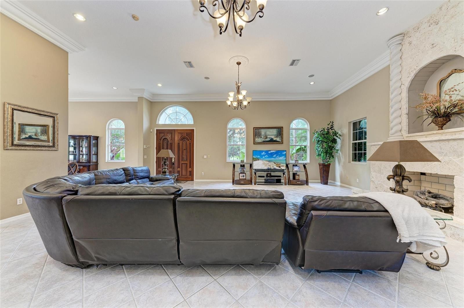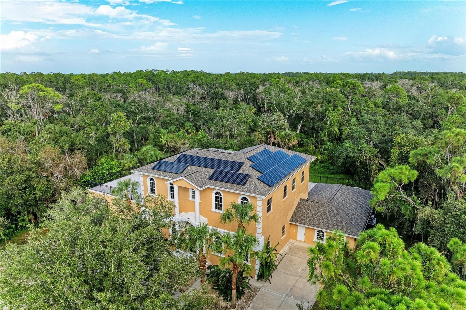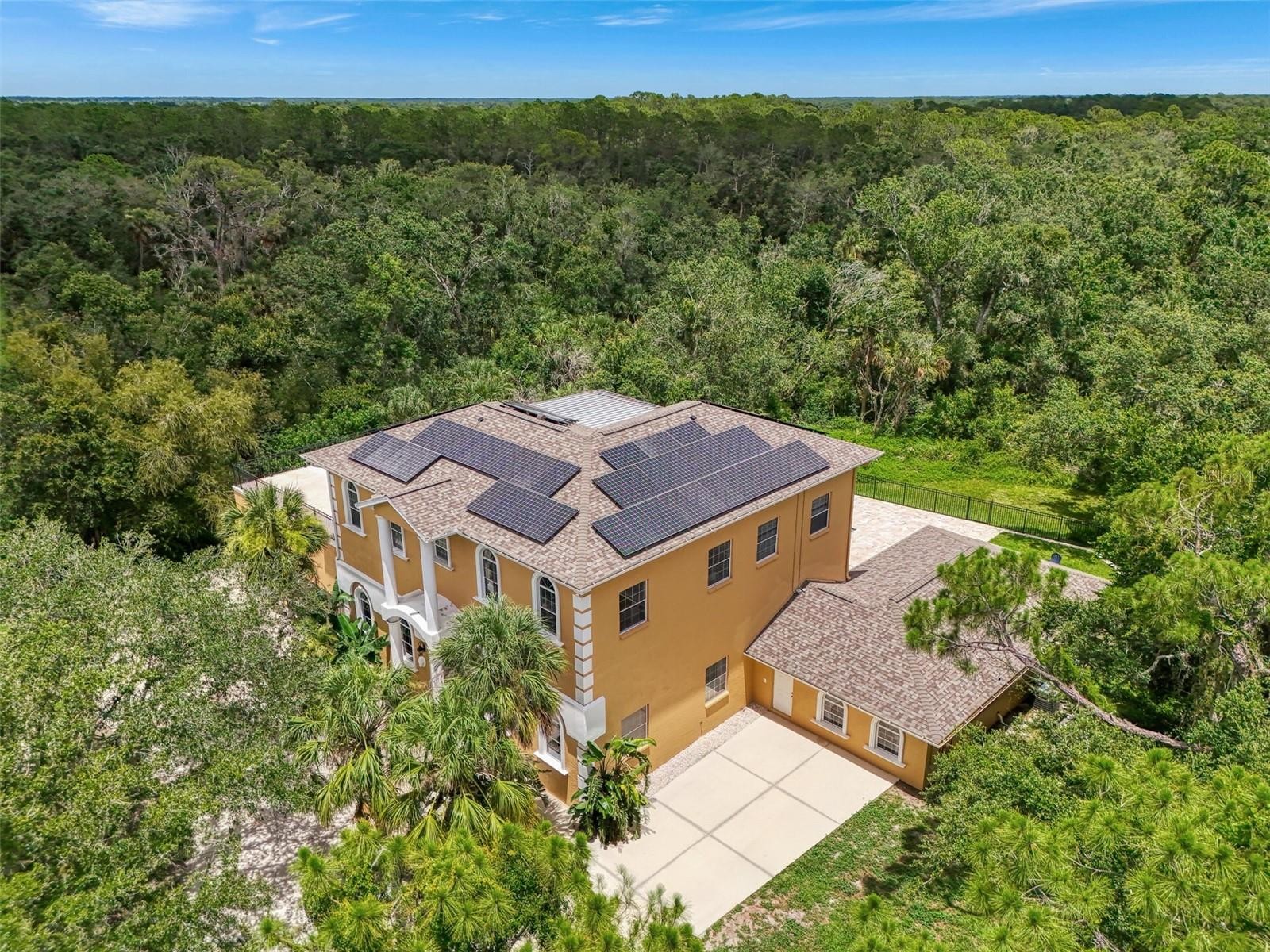 NO DEED RESTRICTIONS | SOLAR | NEW ROOF| TRAVERTINE HEATED POOL & SPA | RV GARAGE | 8 ACRES | 5-MINUTES TO TOWN! Rare opportunity to own a one-of-a-kind estate offering over 5,700 sq. ft. of living space on more than 8 private, wooded acres—just minutes from town, and only 1-mile to Lorraine & Fruitville Rd. NO HOA & NO Deed Restrictions! Hi & Dry NO FLOOD INSURANCE, NO WATER BILL, BARELY AN ELEC BILL with OWNED SOLAR PANELS. This custom 2-story home features 4 Spacious Bedrooms, could easily be 6-BEDROOMS, with the 2-BONUS ROOMS, or divide the 24-ft Guest Bedroom in two. There is ALSO an attached IN-LAW SUITE—ideal for MULTI-GENERATIONAL LIVING. Soaring 15-ft CEILINGS on BOTH FLOORS create a GRAND & EXPANSIVE feel throughout. The GREAT ROOM centers around a stunning CORAL STONE FIREPLACE and flows into a large entertainment room with wet bar and views of the pool. There is a HUGE 1500SQFT ROOFTOP OUTDOOR CONCRETE SUN-DECK FOR ALL YOUR ENTERTAINMENT NEEDS, along with a COVERED, SCREENED, 2nd-Flr BACK PORCH to kick back, sip your drinks and enjoy your PRIVATE OASIS! Enjoy the outdoors in your resort-style TRAVERTINE POOL & SPA, complete with ZERO-ENTRY SUN-SHELF, Firepit Area, and plumbing for an outdoor pool bath & shower. The attached 6-CAR GARAGE or RV BAY offers reinforced concrete construction, two 50-amp plugs, and doubles as a Hurricane Shelter. Built with BLOCK CONSTRUCTION on BOTH FLOORS, the home includes a BRAND-NEW SHINGLE ROOF in JUNE 2025, 64-OWNED SOLAR PANELS, and INVESTORS -- PRICED BELOW RECENT APPRAISAL NOW SUPER PRIVATE 8 WOODED ACRE SETTING. This ACREAGE property allows up to 3 STRUCTURES FOR THIS SITE!