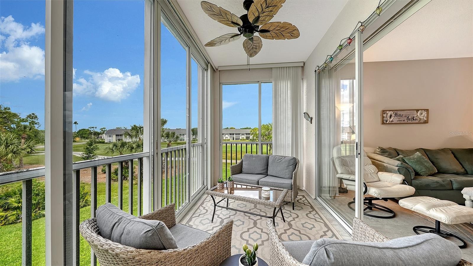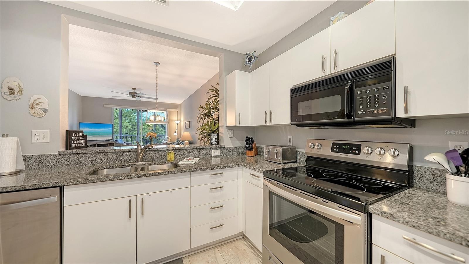 Live the country club lifestyle in this tastefully updated condo at CLUB SOUTH CIR., a popular community within STONEYBROOK GOLF & COUNTRY CLUB. LUXURY VINYL FLOORING flows throughout the main living area with plush carpeting in both bedrooms. An UPDATED KITCHEN featuring newer cabinets, stainless steel appliances, STONE countertops, and a charming cafe table for two in front of the large kitchen window completes the picture. The primary bedroom comfortably accommodates a king bed and features an UPDATED BATHROOM with a higher vanity, a granite countertop, and a tiled walk-in shower. The dining area is open to the living room and is tastefully decorated and the home is being sold TURN-KEY FURNISHED. The GLASS-ENCLOSED lanai with sliders allows year-round enjoyment and relaxation while offering a spectacular view of the golf course on one side and the lake on the other. For added security for years to came A NEW AIR CONDITIONER was installed in March of 2026. This exceptional condo has a washer and dryer, is located in an elevator building, has one covered parking space, and a storage shed. Club South amenities include a heated pool, a screened eating area, a grilling area, plus tennis and pickleball courts. Stoneybrook is an amenity-rich community, including a newly modernized 18-hole golf course, lighted Har-'tru tennis courts, a pro shop, fitness center, bocce ball court, a driving range, and much more. The clubhouse features fine and casual dining, a full bar, outdoor dining patio, a large heated pool and spa, all the social activities you would expect from a country club, like yoga, mahjong, trivia, water aerobics, and much more. The gated community is centrally located on Palmer Ranch, close to shopping, the YMCA, Costco, and borders the access to the Legacy walking and biking trail, and is less than 15 minutes from the sugar sandy beaches of Siesta Key. This home offers so much more than a condo to live in, but a lifestyle to enjoy.
