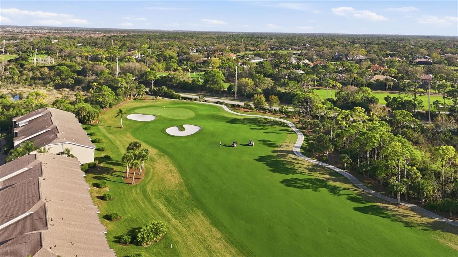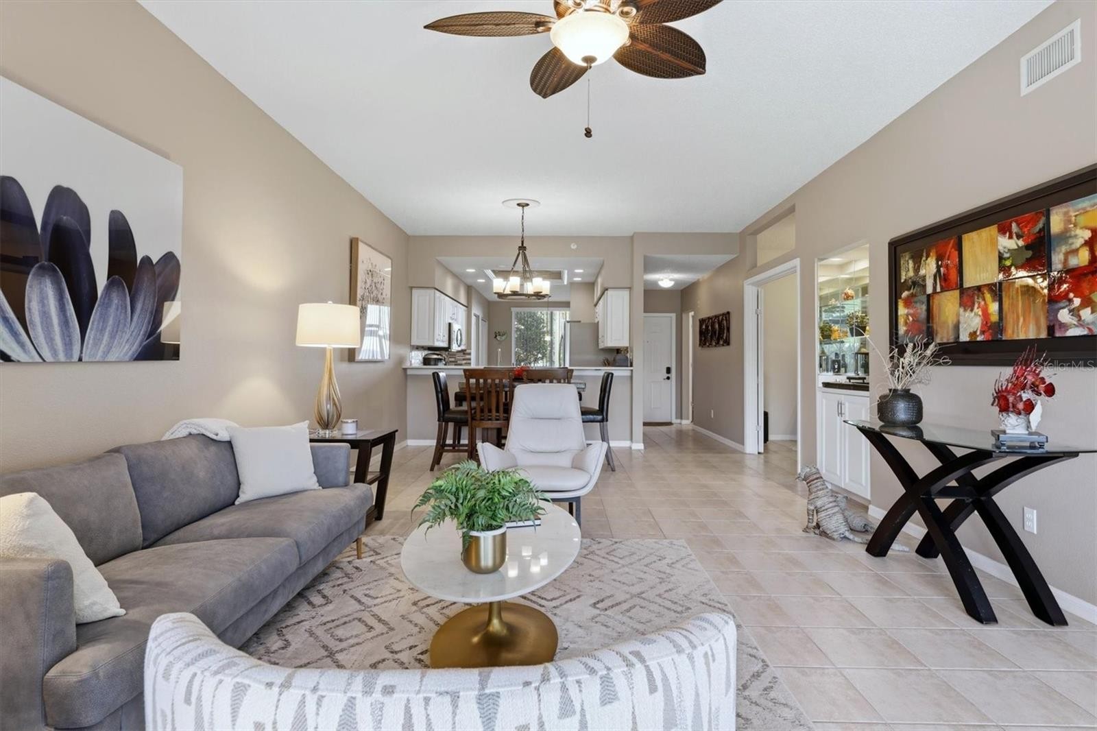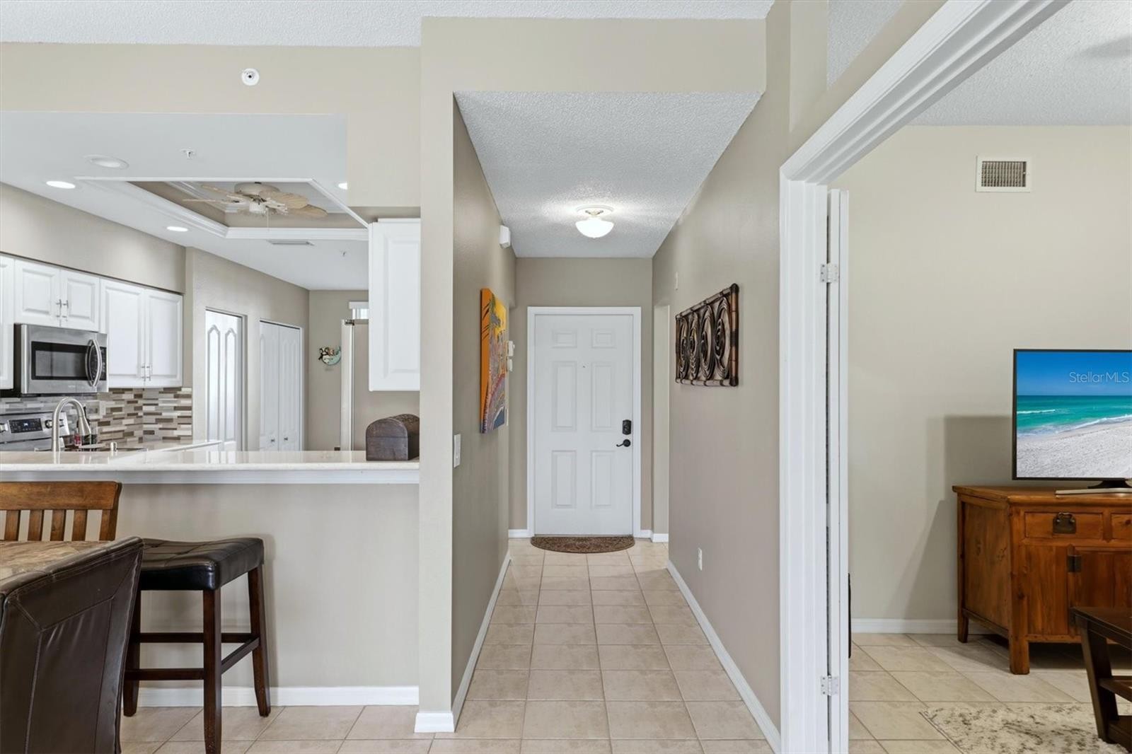 Rarely available ground-floor Barrington Veranda offering 1,414 sq. ft. of beautifully curated, magazine-worthy living space in Stoneybrook Golf & Country Club. From the moment you step onto the paver front lanai and enter the welcoming foyer, it’s clear this home is something special. The thoughtfully designed floor plan features tile flooring throughout the main living areas, including the glass-enclosed rear lanai that functions as a bright sunroom, while both bedrooms feature luxury vinyl plank flooring. The updated kitchen is both stylish and functional with quartz countertops, white cabinetry with brushed nickel hardware, stainless steel appliances, and a separate dinette area with sliding glass doors leading to the front lanai. The kitchen flows seamlessly into the dining and living areas, creating an ideal layout for entertaining. A versatile den just off the living room easily doubles as a guest room with a sleeper sofa, providing additional accommodations when needed. The glass-enclosed rear lanai offers a cozy retreat to relax with a glass of wine while enjoying peaceful sunset views overlooking the 4th fairway and green. The primary suite features a bay window with golf course views, two walk-in closets, and an updated ensuite bath. The guest bedroom is located on the opposite side of the condo for privacy and is conveniently situated near a full bathroom. A dedicated laundry room with additional storage adds everyday convenience. Decorated in neutral tones, the residence has been recently furnished with pieces from Copenhagen, complemented by unique artwork—including several original pieces—and distinctive area rugs. Offered turnkey furnished, this home is truly move-in ready. Located in the Fairway Verandas II section of Stoneybrook, residents enjoy full access to the community’s exceptional amenities, including a recently modernized 18-hole championship golf course, tennis courts, fitness center, pro shop, bocce, and a clubhouse with restaurant, bar, and indoor/outdoor dining. Ideally located near the Legacy Trail and just minutes from Nokomis Beach, Siesta Key Beach, shopping, dining, and entertainment. Bonus: The seller has paid the 2024 golf course modernization assessment in full, saving the buyer over $6,000. Don’t just buy a condo—experience the Stoneybrook lifestyle.