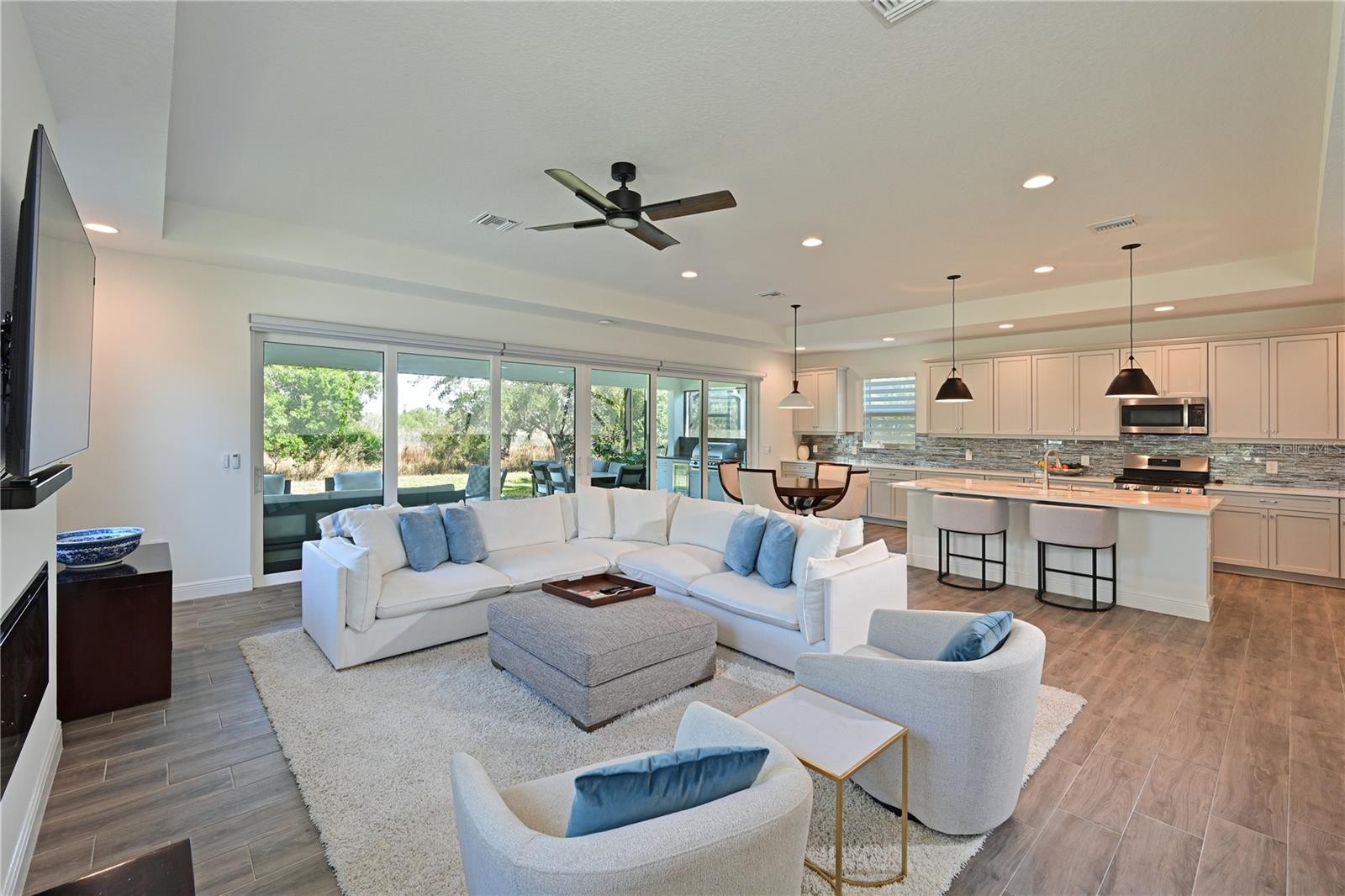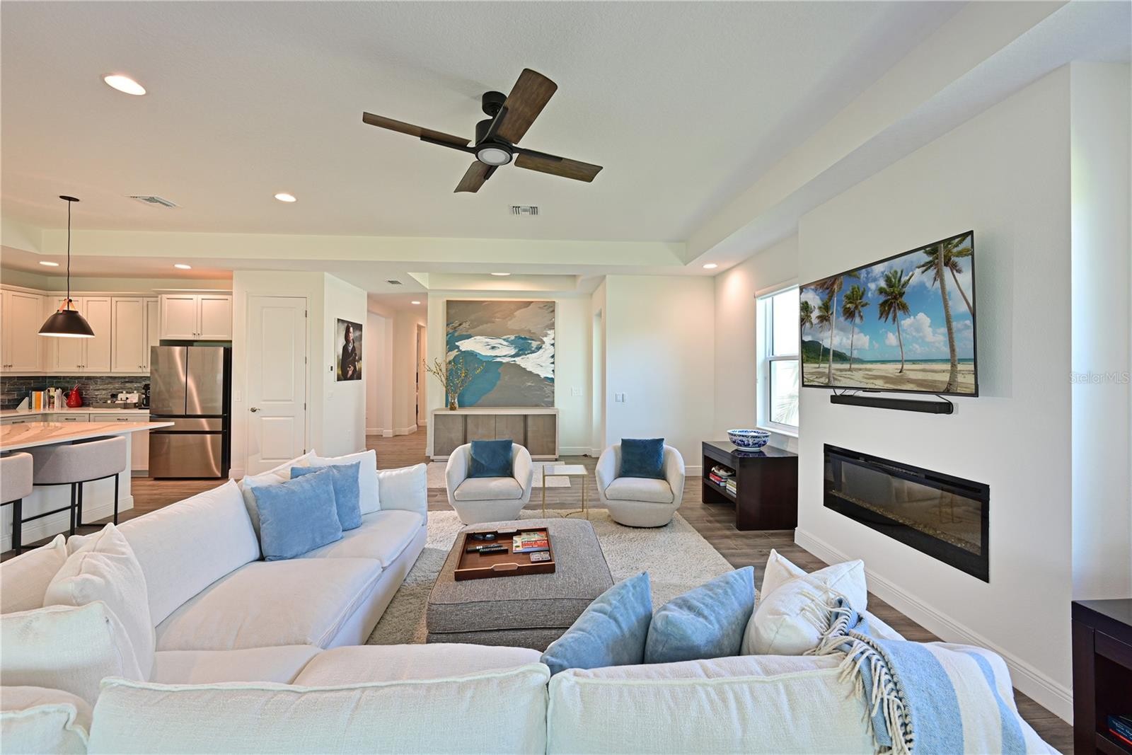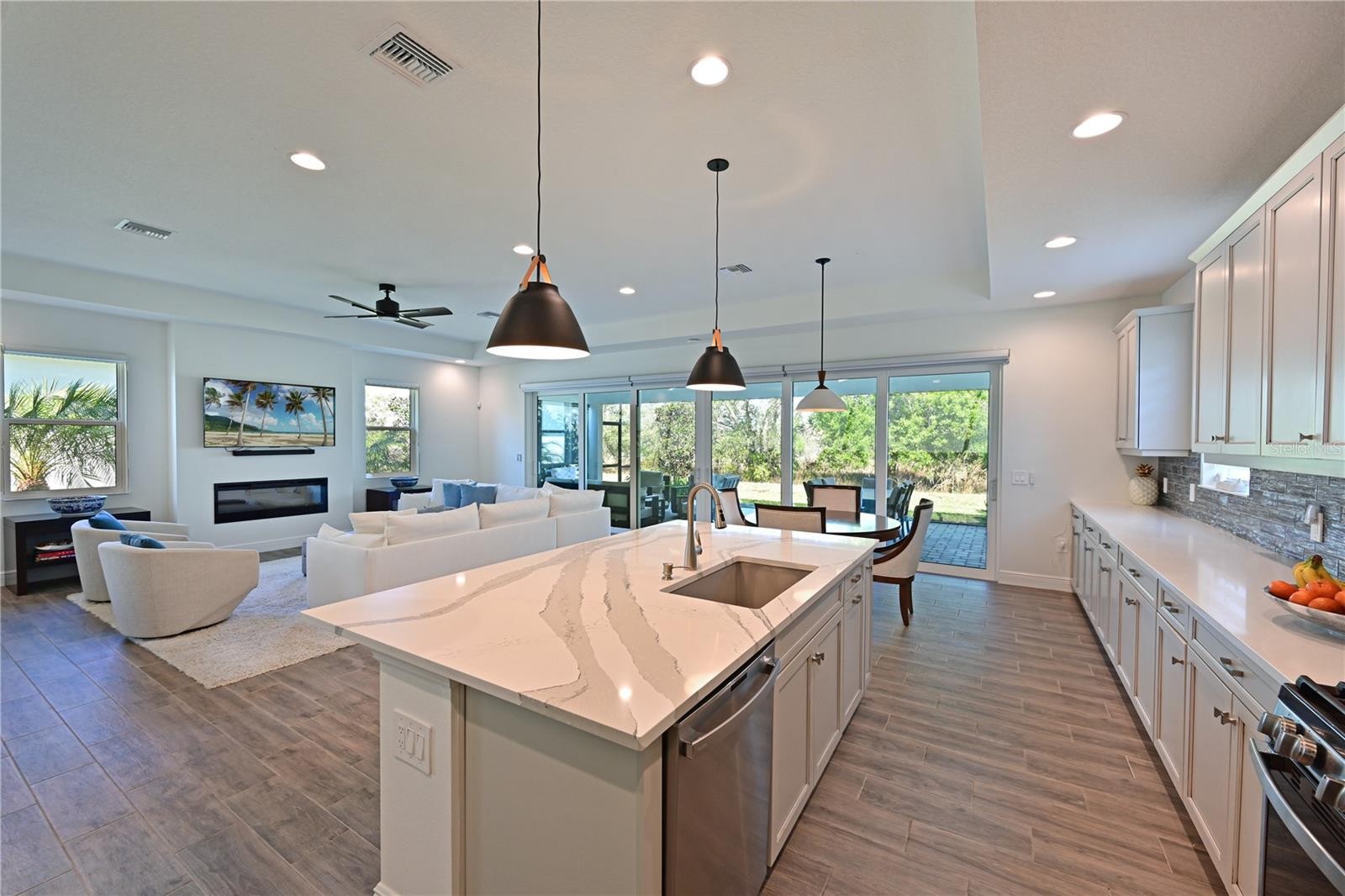 Under contract-accepting backup offers. Step inside this stunning, like-new home in one of Waterside’s most desirable communities. This impeccably cared-for 2 bedroom + den residence is situated on a premium lot offering privacy and serene preserve views. The chef-inspired kitchen has been thoughtfully enhanced with quartz countertops, upgraded tile backsplash, granite composite sink, GE appliance package, gas stove, and designer lighting. Enjoy al fresco dining on the extended lanai, featuring an outdoor kitchen and seamless panorama frame enclosure that maximizes natural light and captures beautiful outdoor views. The expansive great room features a fireplace, tray ceiling and 16' sliders across the back - creating an ideal indoor-outdoor living experience. A spacious owner's suite with tray ceiling, sitting area, spa like bath and large walk in closet offer a serene environment. A spacious second bedroom is ideal for guests. Additional features of this home include hurricane impact windows throughout and custom built-in closets. Residents of Lakehouse Cove at Waterside enjoy access to resort-style amenities including a heated pool, fitness center, pickleball courts, kayak launch, dog park, and miles of scenic walking trails. Nearby Waterside Place offers an array of excellent restaurants, shopping and vibrant community events including a Sunday farmer's market, and weekly street festival.
