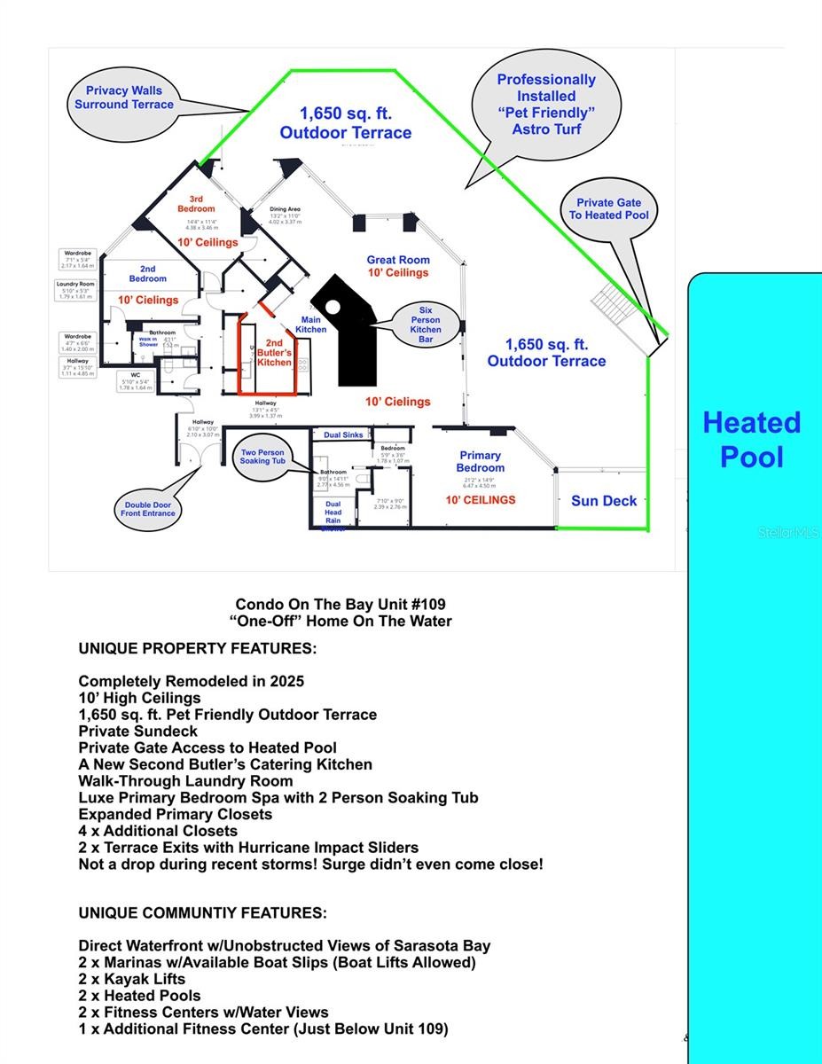 Direct Waterfront with over 1,800 S.F., Private Outdoor Oasis. One of a kind condo that feels like a waterfront house. 10' HIGH CEILINGS. High & Dry. Never Flooded. No Assessments. Two Kitchens. Expansive Outdoor Living with Pet-Friendly YARD with Astroturf. Fully renovated, unobstructed water views and an unparalleled, pet friendly walled outdoor living space that was professionally designed with AstroTurf, perfect for entertaining or relaxing in total privacy. Enjoy DIRECT, PRIVATE ACCESS to the heated community pool, two fitness centers, a marina with BOAT SLIPS WITH BOAT LIFTS, and a sunset fishing pier—all just steps from your door. Inside, the newly remodeled interior features a gourmet kitchen with premium finishes, PLUS A SECOND BUTLER'S/CATERING KITCHEN for effortless entertaining. The primary suite is a true sanctuary, complete with a double vanity, two-person soaking tub, and dual rain showers. Each of the three spacious bedrooms includes a large walk-in closet, providing ample storage. Beyond the gates, The Bay, Sarasota’s vibrant new waterfront park, awaits—offering live entertainment, yoga and fitness classes, concessions, and more. Walk to 12 acclaimed restaurants in the Rosemary District within six blocks, or take a leisurely stroll just nine blocks to Downtown Sarasota’s Main Street, where endless dining, shopping, and entertainment options await. This exclusive waterfront retreat offers the perfect blend of luxury, convenience, and lifestyle. Schedule your private showing today!