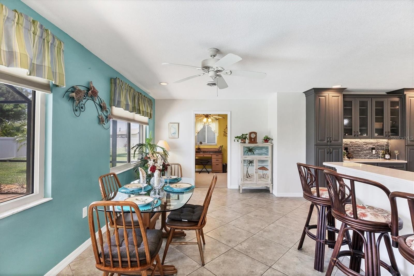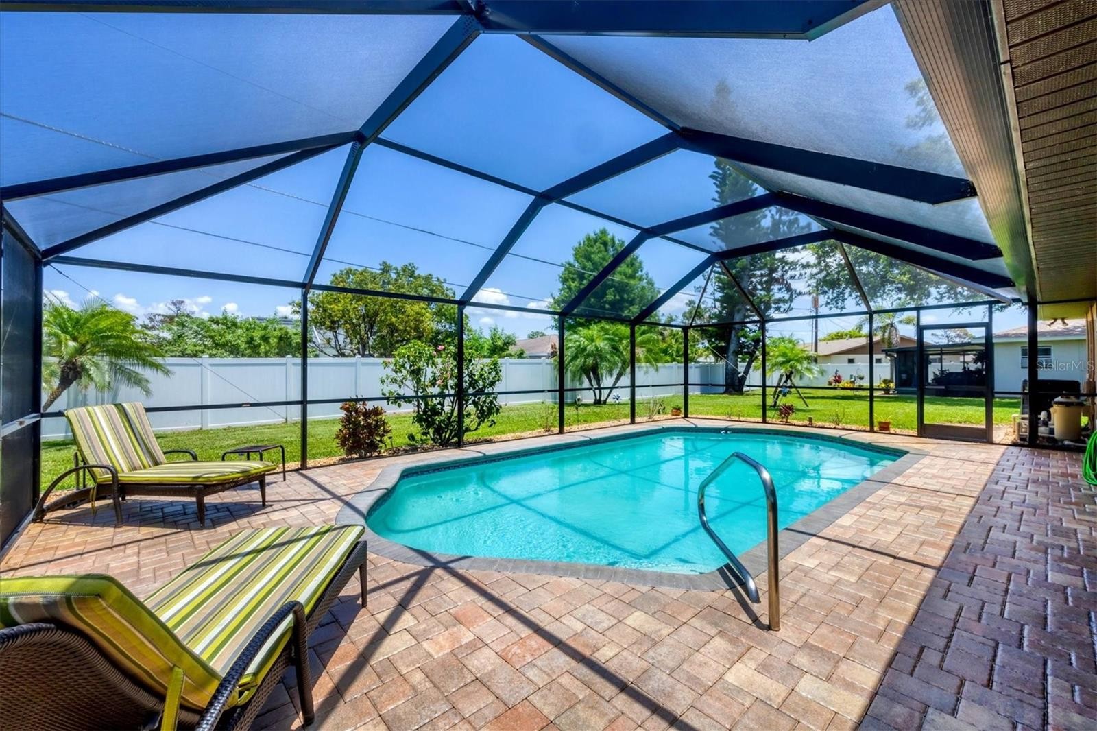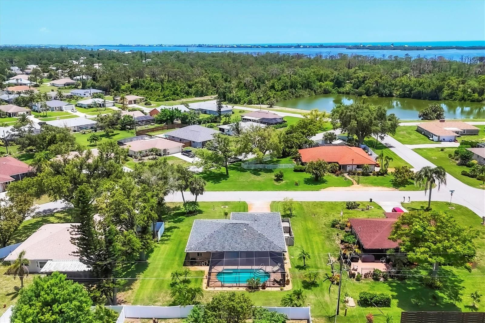 If you’re in search of a home within a highly desirable community, Bay Vista should be at the top of your list. This deed-restricted neighborhood is perfectly situated near an array of amenities and is adjacent to the tranquil Lemon Bay Park, which offers 210 acres of scenic shoreline and walking trails. Adding to its appeal is the remarkably low annual HOA fee of just $60. Bay Vista’s location is unbeatable—only six miles from the stunning Manasota and Englewood beaches—and it’s a short distance to downtown Dearborn Street, a lively hub featuring shops, restaurants, entertainment, a weekly farmers market in season, and community events at Pioneer Park and Indian Mound. This delightful two-bedroom, two-bathroom residence includes a versatile bonus room currently serving as an office, with the potential to convert into a third bedroom. The property has a heated pool, a newer roof, a newly installed pool cage and heater, a new pool cover, a new hot water tank, and hurricane windows paired with a hurricane-rated garage door for added security. Being positioned in an X flood zone offers further peace of mind during inclement weather. The interior is thoughtfully designed, with elegant tile flooring throughout the main living area and a spacious great room. The kitchen stands out with its open layout, featuring a central island with abundant storage, a generous eat-at counter with stools, and a raised breakfast bar. Custom additions such as a built-in China cabinet/double pantry and a dry bar/coffee station elevate the functionality and charm of this space. The dining area is flooded with natural light, offering lovely views of the pool and the expansive yard. A split floor plan ensures privacy for the bedrooms, making it an excellent choice for families or guests. The primary bedroom is a haven of comfort, complete with a walk-in closet and an ensuite bathroom adorned with granite countertops, a glass-enclosed walk-in shower, and stylish designer tiles. The guest bedroom offers direct access to the screened lanai through sliding glass doors, seamlessly connecting indoor and outdoor spaces. The outdoor area is equally inviting, with brick-paved surroundings enhancing the screened lanai and heated pool. This private oasis is perfect for relaxation or entertainment. Additional features include a washer, dryer, and laundry tub for added convenience. Combining style, comfort, and coastal living, this home is a true gem. Don’t miss the chance to make it yours—schedule showing today!