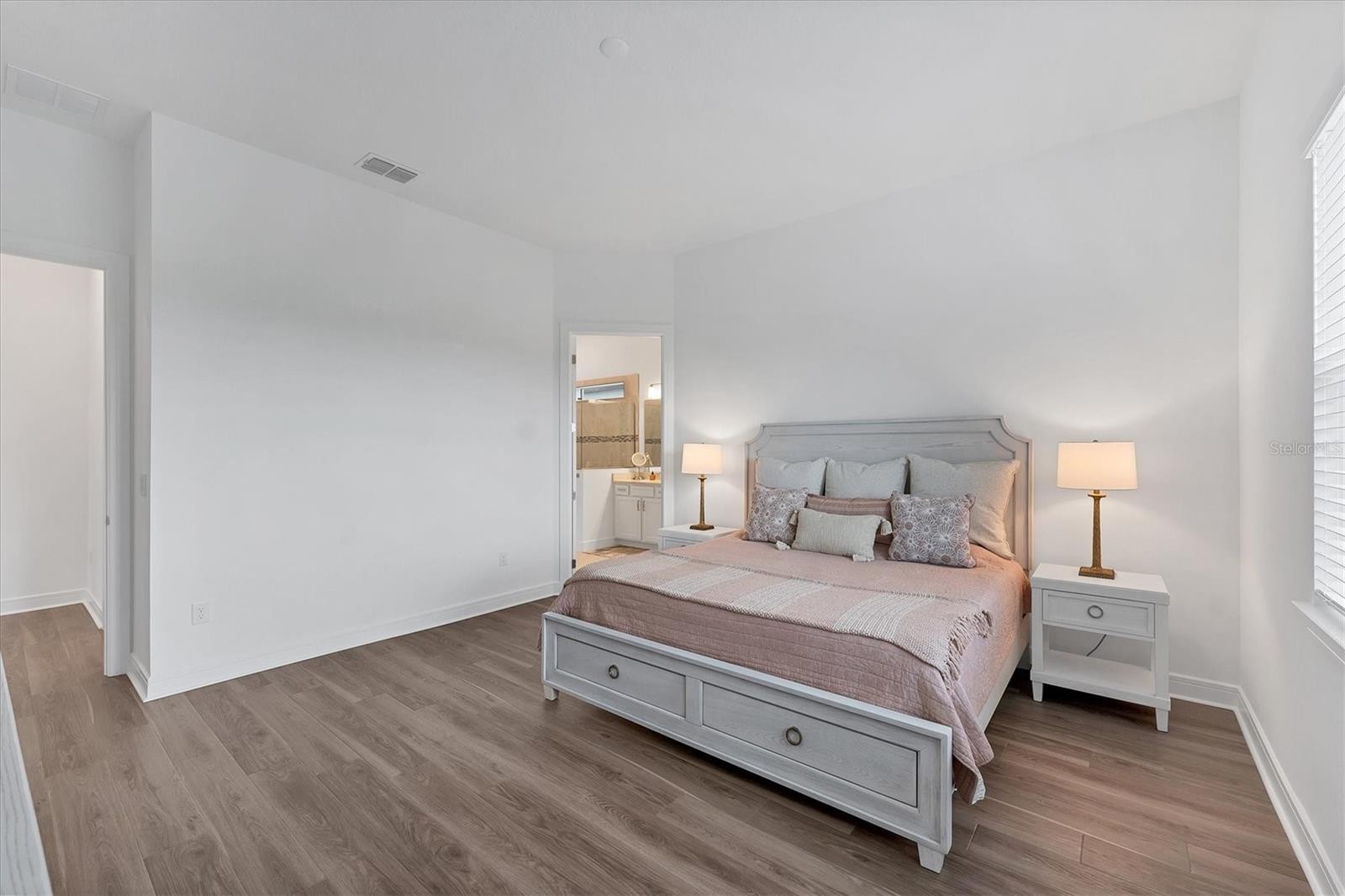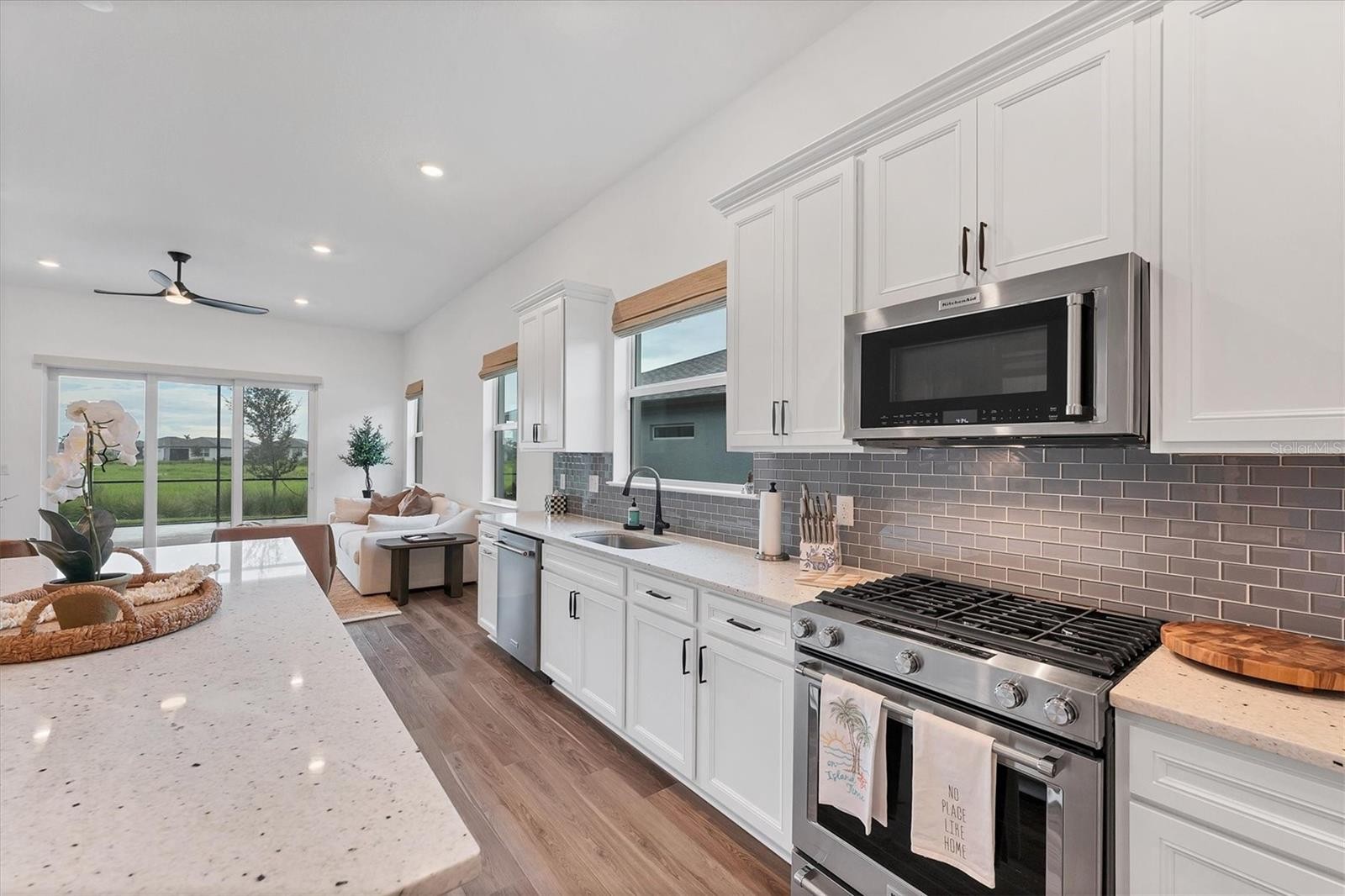 The MAINSTAY floor plan offers an uncommon option in Bay View, a very active gated 55+ community. Larger than a Mystique (most popular floor plan), it offers great storage and a laundry room within the primary suite. This 2BR/2BA + Den home offers 1,972 sq ft of luxury living with hurricane impact windows/doors, in-wall pest control, and transferable warranties. The gourmet kitchen features KitchenAid appliances, quartz countertops, and an oversized island. Enjoy luxury vinyl plank flooring throughout (no carpet), a den with French doors, and a spacious primary suite with walk-in closet and spa-style bath. Relax on the extended screened lanai with peaceful conservation views. Frankly, this home was used rarely and was never decorated. You'll feel its newness when inside. The owner relished the lifestyle on a 2nd visit and immediately built bigger! The extended garage includes epoxy flooring and golf cart space. Resort-style amenities include a clubhouse, fitness center, pools, spa, pickleball, tennis, and bocce courts; a community garden, bandshell pavilion, two dog parks and a restaurant, The Sailfish Grill! Just 1.5 miles to I-75/I-275 allows easy access to beaches, airports, shopping, and dining. Please note:2025 tax shown includes the CDD fee and is not homesteaded