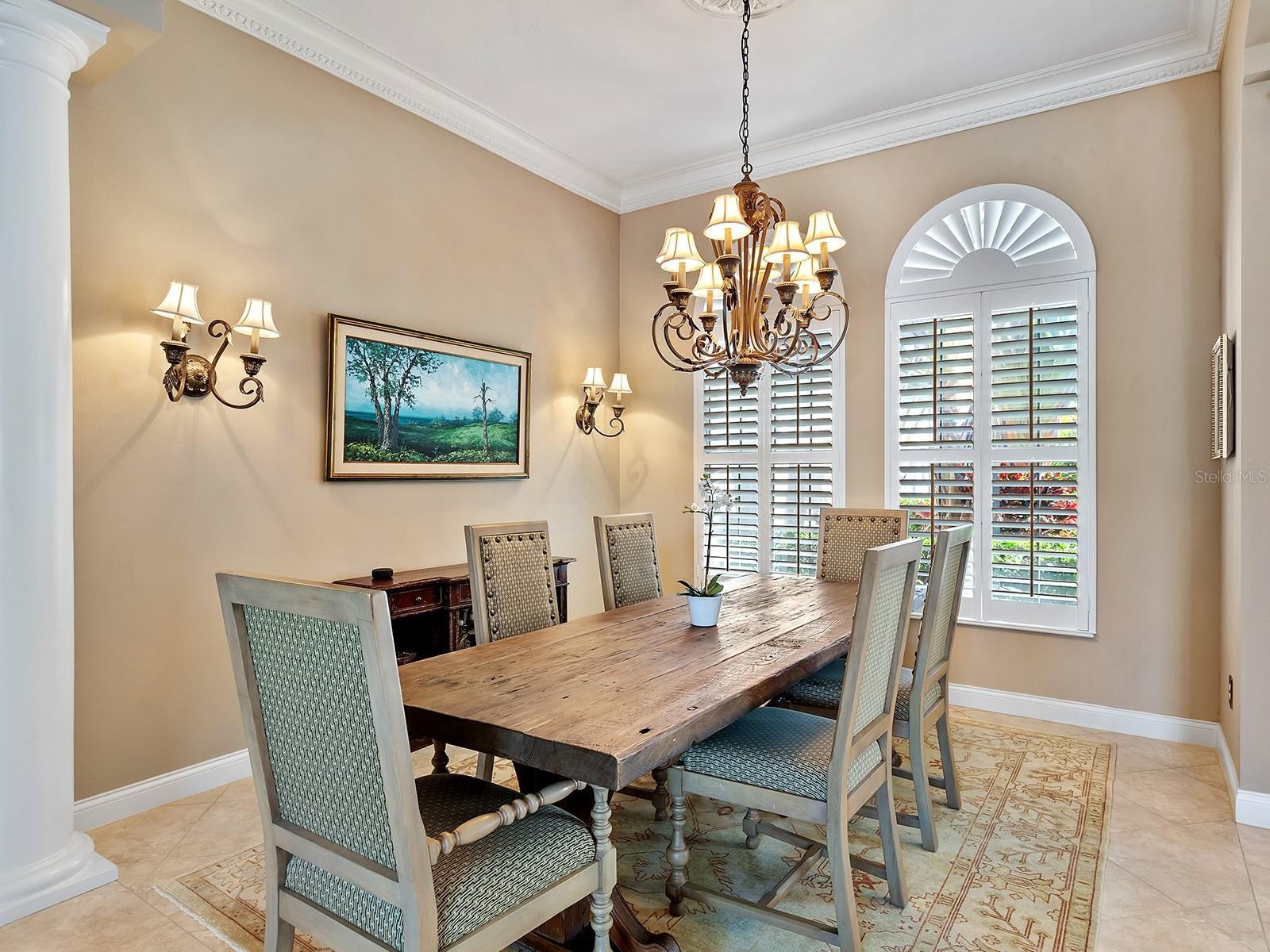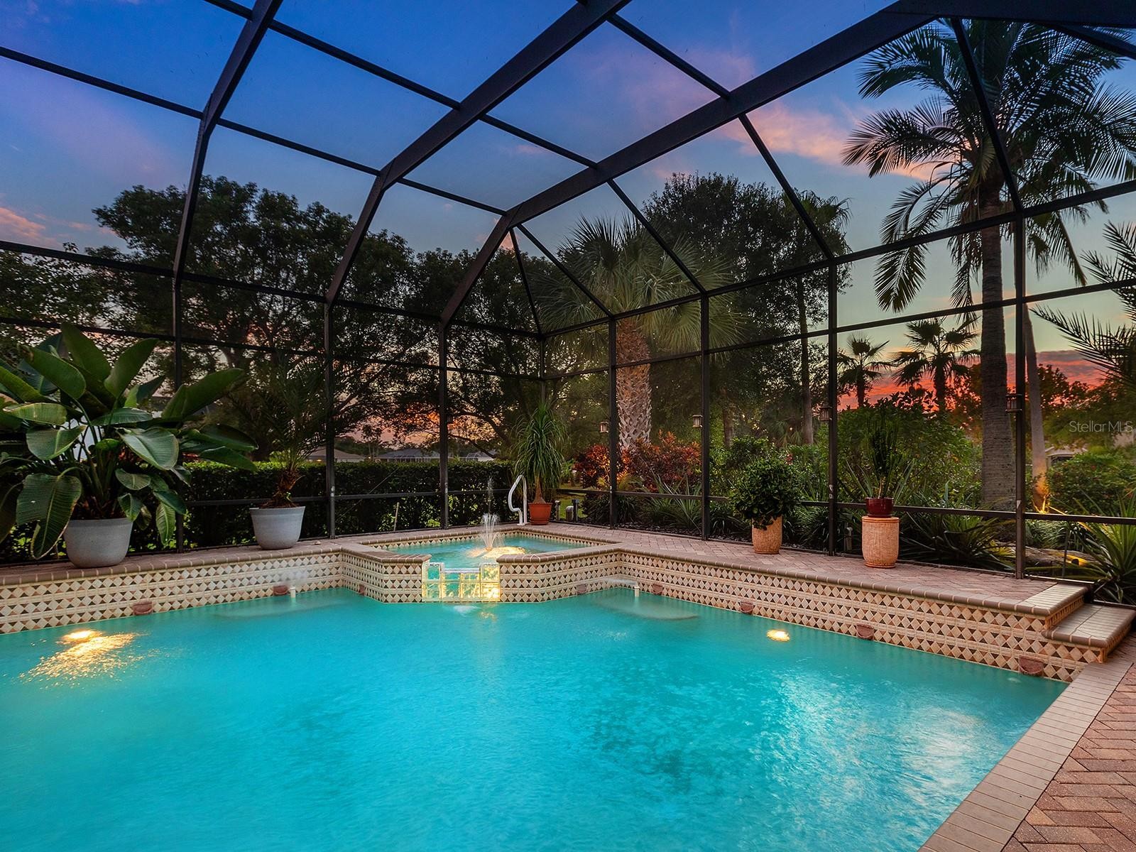 Distinctive from the moment you arrive, this 2003 Todd Johnson–built residence in The River Club showcases timeless architecture. A circular paver driveway with landscaped island and a secondary rear drive lead to dual garages accommodating up to eight vehicles and a golf cart. The home includes a new tile roof (Oct. 2025), fresh exterior paint, and recent upgrades throughout. The foyer features marble-inlaid tile floors, a glass-and-iron front door, custom moldings, columns, and arched openings. The living room offers wood floors, crown molding, custom draperies, and pocketing sliders to the lanai, while the dining room includes arched plantation-shuttered windows and an art niche. The kitchen offers granite countertops, a tumbled limestone backsplash with matching vent hood, and Monogram appliances including a refrigerator, wall oven, microwave, and five-burner cooktop. A Bosch dishwasher was added in 2025. Additional features include a stone basin sink, island, breakfast bar with beadboard detail, built-in desk, and a breakfast nook with aquarium windows, bench seating, and chandelier. The family room has pocketing sliders, columns framing a stone and marble TV enclosure, surround sound, and a wood tray ceiling with layered crown molding and uplighting. A private office with built-ins opens to the lanai and connects to the secondary garage. The primary suite includes wood floors, a bay-window sitting area, and two custom walk-in closets. The en-suite bath features a Jacuzzi tub, dual vanities, linen closet and Roman-style shower with three showerheads. Two main-level guest suites have wood floors, crown molding, and built-in closets, one with access to the pool bath offering a vanity with granite countertop, tile-inlaid shower, and linen closet. The valet area provides cabinetry with granite countertops and tile backsplash, while the laundry room includes cabinetry, a stainless-steel sink, and LG washer and dryer. A half bath completes the main level. A wood staircase with iron railing leads to a bonus room with wet bar with a refrigerator, microwave, sink, granite countertops, limestone backsplash, wine rack, and under-cabinet lighting. A full bath with vanity and granite countertop and a nearby storage closet add convenience. The adjacent guest suite offers sliders to the terrace, dual closets, floating shelves, and a furniture niche. Outdoor living includes a screened lanai with lake views, wood-ceiling covered areas, paver decking, and a heated pool and spa. The outdoor kitchen features a ProFire® grill, refrigerator, sink, tile backsplash, and solid-surface countertops. A stationary awning shades the open patio connecting to the backyard. The garages include an oversized air-conditioned 5+ car, RV or boat storage space(29 Wide’X 45’Long X13’4” inside height) with epoxy floors, workstations, bike racks, pegboard wall, pendant lighting, storage, and space to add a lift or golf simulator, plus another three-car garage with golf cart space, built-in cabinetry, and air-conditioned storage. A mounted tablet manages smart-home features, supported by a central vacuum and nine cameras. Systems include three HVAC units, a hybrid energy-efficient water heater, and new pool equipment (2025). With low HOA fees and no CDD, this home is set in River Club, just steps from the 18-hole semi-public golf course and minutes from Gulf-Coast beaches, Lakewood Ranch and Sarasota’s shopping, dining, medical centers, and top-rated schools.