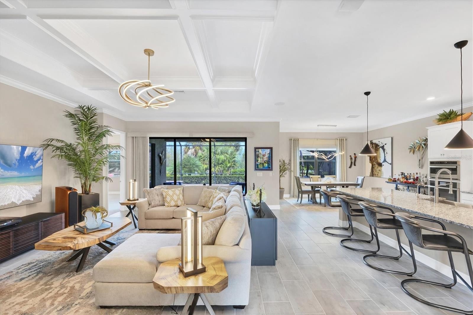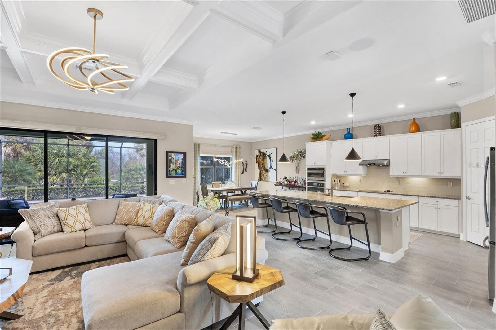 One or more photo(s) has been virtually staged. Welcome to this STUNNING home in the highly sought after SARASOTA NATIONAL GOLF AND COUNTRY CLUB! Come live in this VIBRANT community by letting yourself indulge in the most popular floor plan on the most coveted street in the neighborhood. Sitting at the end of this cul de sac street, this Summerville is sure to please w/tons of upgrades. Offering 3BD/3BA/DEN & 3 CAR GARAGE. TWO GOLF MEMBERSHIPS COME WITH THIS HOME, NO INITIATION FEE REQUIRED. When you drive up to the home curb appeal is off the charts w/ pavered drive/sidewalk, upgraded brick front, & leaded glass double doors all surrounded by beautifully designed tropical landscaping. Upon entering the home you will notice the rectangle plank PORCELAIN TILE flooring that runs throughout the main areas of the home. Walk through the foyer & come to the heart of the home-the GREAT ROOM, which brings living area, kitchen,& dining together in a functionally elegant combination. Gourmet Kitchen has GRANITE countertops, STAINLESS STEEL APPLIANCES (upgraded oven/microwave convection oven),extra large stainless steel FARMERS SINK, & easy pot fill HANSGROHE faucet. PENDANT LIGHTS, EXTRA RECESSED LIGHTS, & UNDER CABINET LIGHTING, makes sure the Chef doesn't miss a beat. KINETICO H2O double water filtration system & Revers Osmosis for drinking water. Crown molding, high end lighting & fixtures throughout home. Expansive Living room has gracious coffered ceiling design,& sliding doors out to the VERY PRIVATE,VERY SPACIOUS lanai & HEATED PRIVATE POOL/SPA. Lots of different areas to enjoy-float in the pool, soak in the hot tub, lounge in the sun, sit undercover rain or shine & enjoy the tropical landscaping all around the lanai creating your own private oasis. STORM SMART, REMOTE CONTROL HURRICANE SCREEN for lanai. Furniture can all be left undercover and protected. Master bedroom w/tray ceiling, sliders to lanai & has en suite bathroom that is a dream. Two separate vanities for individual space & a wondrous double shower that will elevate your senses. LARGE WALK IN CUSTOM DESIGNED CLOSETS. Guest bedroom 1 has en suite bathroom while guest bedroom 2 has its own private space and bathroom right next door. Laundry room offers wash sink & extra cabinets. 3 CAR GARAGE has lots of room for cars and storage. Two heavy duty storage racks to keep things off the floor. EV PLUG in garage(charger ready). HAVE YOU SEEN THE PROPERTY AT NIGHT? Additional landscape lighting in front, back, & on lanai. Improved irrigation system with Hunter remote control for programmed scheduling. Added additional sprinkler heads in front and back. No expense was spared on this GORGEOUS home so MAKE YOUR APPOINTMENT TO SEE IT TODAY!! Sarasota National is a magnificent community w/over 1300 acres designated for preservation, conservation, lakes, & open space with amazing views, Proclaimed as an Audubon International Certified Sanctuary, making it the most gorgeous and enjoyable golf course to play at in the area. Offering resort style amenities w/huge resort style pool/ spa,Tiki Bar to serve refreshing drinks & a bite of lunch, tennis courts, pickle ball, Bocce courts, coffee lounge/library/card room/meeting place, 7000 sq ft fitness facilities offering classes and day spa, & a 30,000 sq ft Clubhouse with dining and spectacular views. 18 Hole championship golf course surrounded by native wetlands and preserves provides an exhilarating and dramatic back drop for your golfing adventure. Come find YOUR Florida lifestyle TODAY!