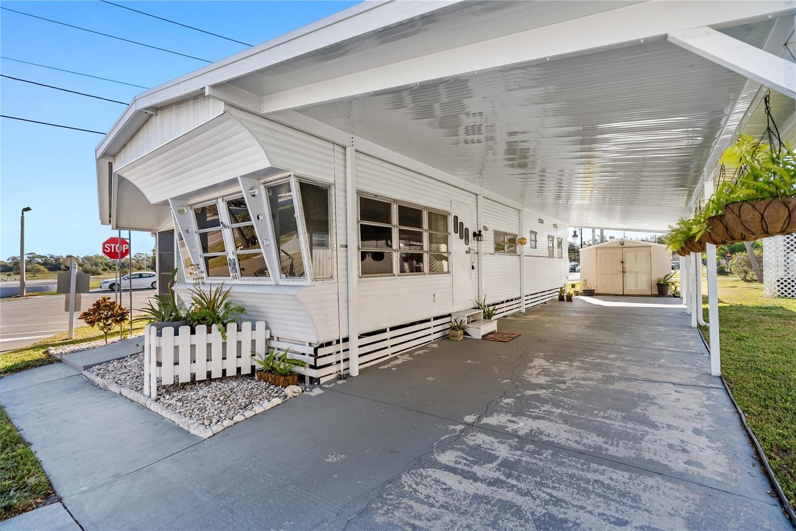 Welcome to DeSoto Place – a land-owned 55+ community in the heart of Sarasota. This beautifully preserved and thoughtfully updated 1958 vintage mobile home offers a rare blend of character, comfort, and convenience. Situated on a large lot with approved plans for a hedge between the home and the road, the setting provides both space and future privacy options. Inside, you’ll find a warm and welcoming 2-bedroom, 1-bath layout with updated plumbing and flooring, an inside laundry, and a cozy, comfortable feel that makes this home easy to love. The enclosed lanai adds valuable living space, perfect for relaxing or entertaining year-round. Outside features are equally impressive, including a carport accommodating up to three vehicles, a shed with electric, and hanging ferns along the carport supported by irrigation, adding charm and curb appeal. The home has been well cared for, maintaining its vintage integrity while offering modern comforts. Located just minutes from Sarasota-Bradenton International Airport, shopping, dining, and medical facilities, this home is ideally positioned for both seasonal and full-time living. DeSoto Place residents enjoy access to a clubhouse, swimming pool, shuffleboard courts, and an active community atmosphere. A truly special opportunity to own a land-owned, vintage gem in a desirable Sarasota location—comfortable, unique, and full of character.