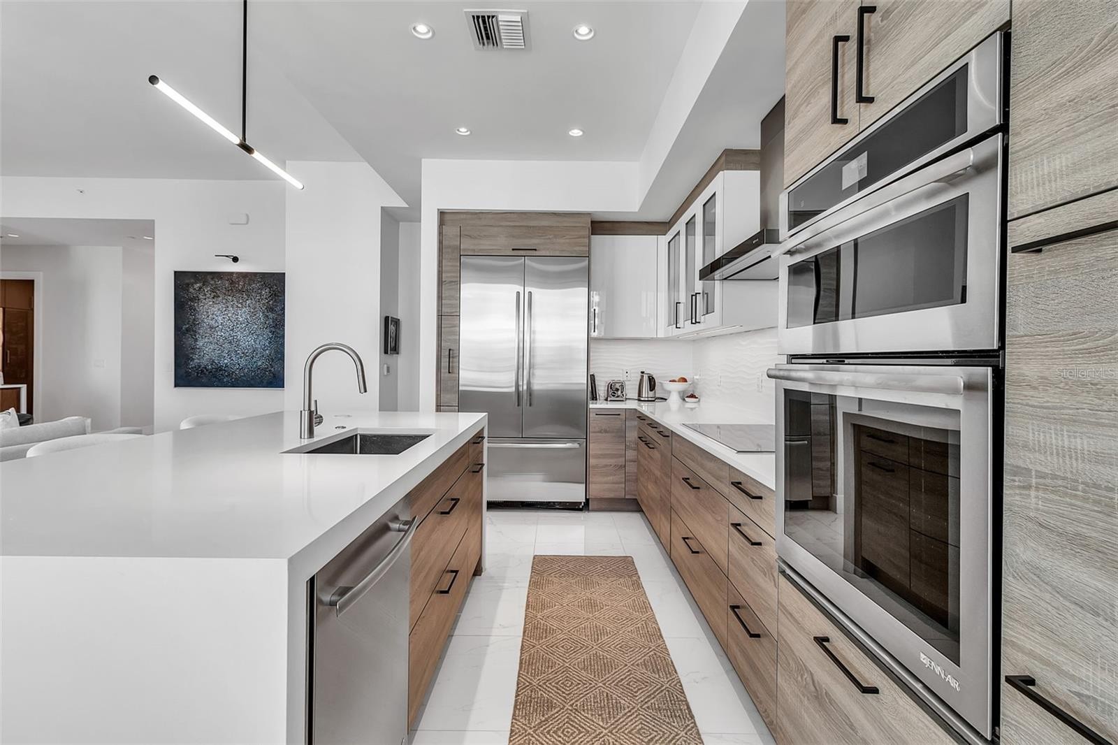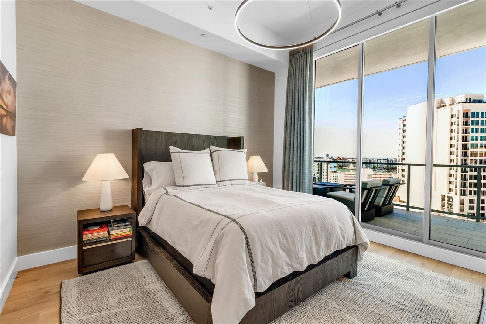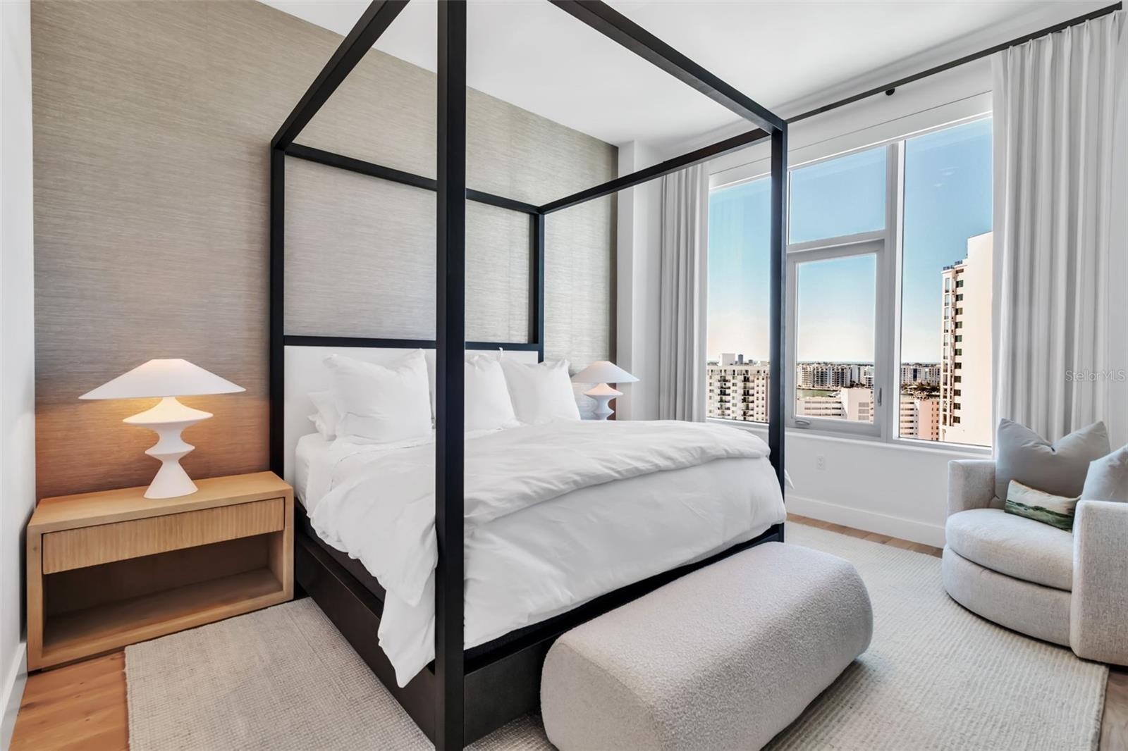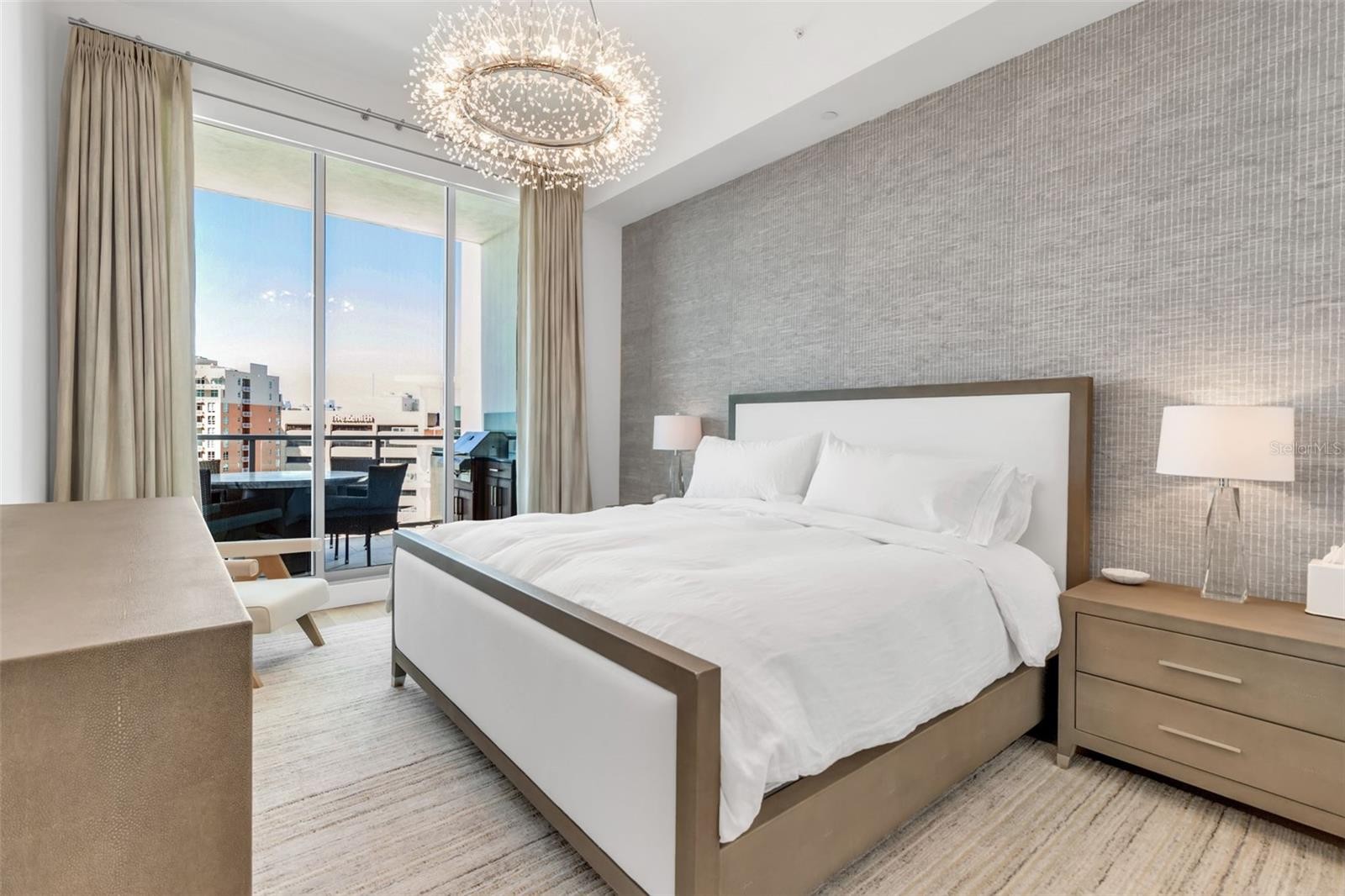 Penthouse level at The Mark Sarasota, featuring a complete cosmetic renovation by the current owners. Enjoy sweeping west-facing views of Sarasota Bay and downtown Sarasota from this refined residence offering 2,485 square feet under air plus 342 square feet of terrace space, for a total of 2,827 square feet. The thoughtfully designed split-bedroom floor plan includes three ensuite bedrooms, a den/office, three full baths, and one-half bath, with a private primary suite wing. Timeless in design, the gourmet kitchen is appointed with Nolte European cabinetry, JennAir stainless steel appliances, upgraded induction range, quartz countertops with a new 6 cm waterfall island, and a modern tile backsplash—ideal for entertaining. Open-concept living and dining areas feature soaring 11-foot ceilings, floor-to-ceiling glass, and large-format porcelain tile flooring, creating a bright, architecturally refined interior. An expansive west-facing terrace extends the living space outdoors with a built-in grill and beverage refrigerator, perfect for sunset dining. The primary suite is a luxurious retreat with two walk-in closets and a spa-inspired bath offering an oversized double vanity, quartz countertops, walk-in shower, and soaking tub. Two guest ensuites include generous closets, while the den off the foyer serves as an ideal home office. New Legno European white oak oil-waxed floors enhance all bedrooms. Additional highlights include all-new lighting fixtures throughout, new full-length mirrors in all bedrooms, new bathroom glass shelving and hardware, a large laundry room with utility sink and new floor to ceiling custom cabinetry, a new smart Lutron system controlling lighting and shades, and a new custom wet bar with Sub-Zero beverage drawers and a Scotsman ice maker. Enjoy abundant natural light and glowing Sarasota Bay sunsets overlooking the tropical pool deck. Two deeded parking spaces, with EV charging, plus a climate-controlled storage unit just steps from the residence. The fifth-floor amenity level offers a resort-style heated saltwater pool and spa, fire pit, lounge areas, grilling pavilion, bar, club room with catering kitchen, billiards, newsroom, and a premier fitness center with yoga and spin studio. Located in the heart of downtown Sarasota, enjoy walkable access to top rated restaurants, the Saturday Farmers Market, galleries, salons, cultural venues, Marina Jack, and Lido Beach just over the Ringling Bridge. With 24-hour concierge service, secure access, on-site management, and pet-friendly living, this residence delivers effortless luxury and coastal sophistication at one of Sarasota’s most coveted addresses.