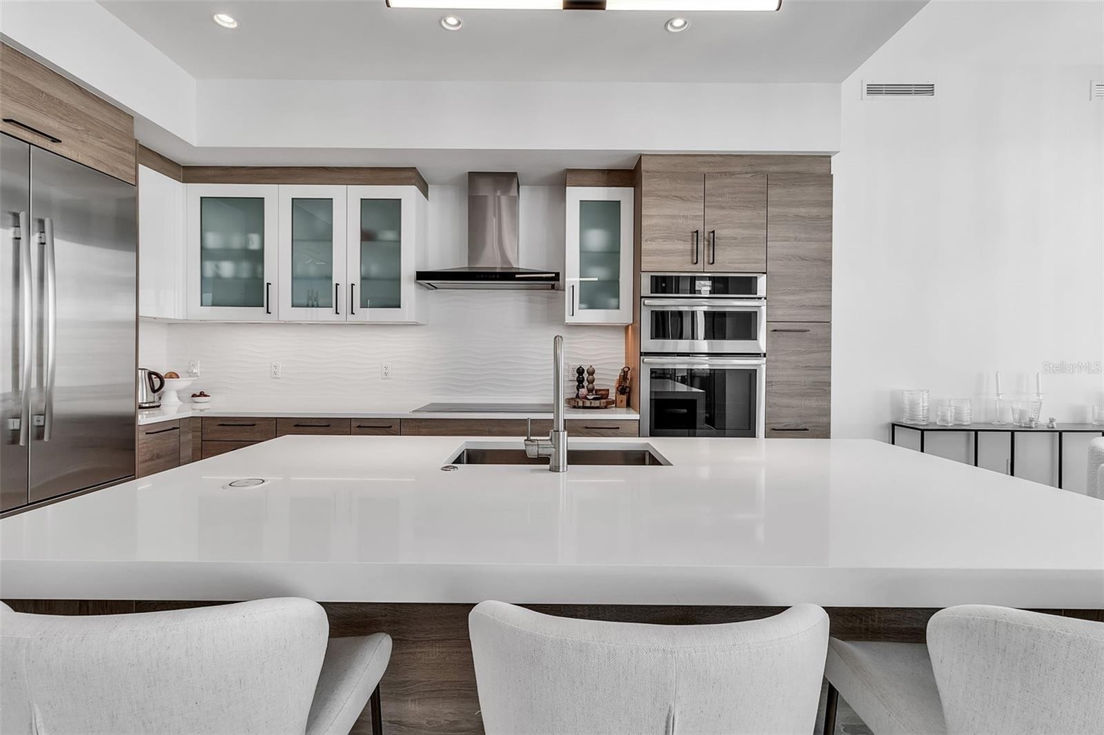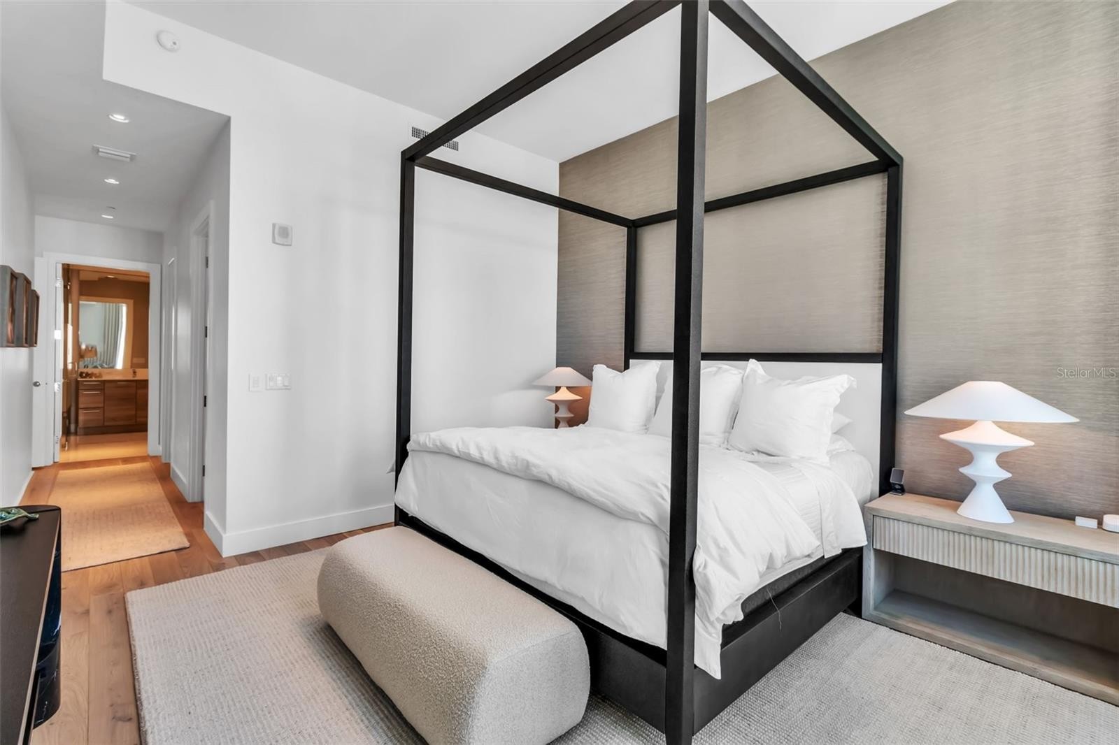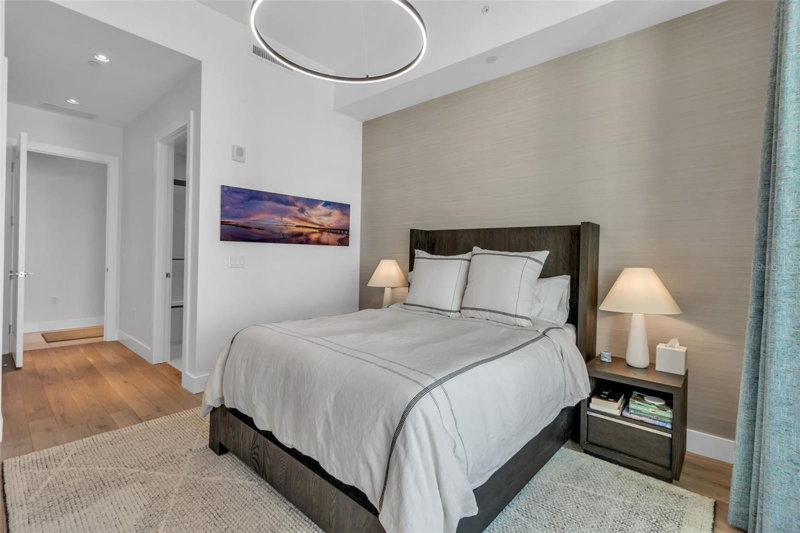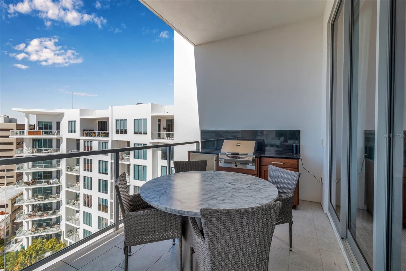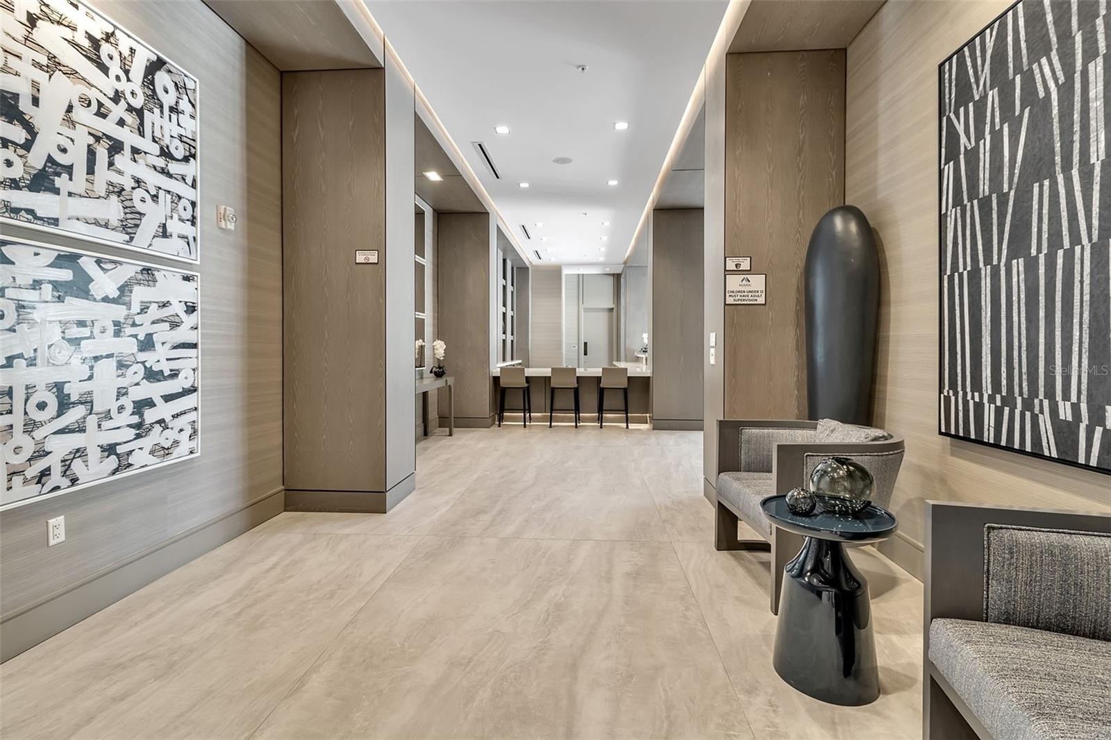 Penthouse level at The Mark Sarasota, featuring a complete cosmetic renovation by the current owners. Enjoy sweeping west-facing views of Sarasota Bay and downtown Sarasota from this refined residence offering 2,485 square feet under air plus 342 square feet of terrace space, for a total of 2,827 square feet. The thoughtfully designed split-bedroom floor plan includes three ensuite bedrooms, a den/office, three full baths, and one-half bath, with a private primary suite wing. Timeless in design, the gourmet kitchen is appointed with Nolte European cabinetry, JennAir stainless steel appliances, upgraded induction range, quartz countertops with a new 6 cm waterfall island, and a modern tile backsplash—ideal for entertaining. Open-concept living and dining areas feature soaring 11-foot ceilings, floor-to-ceiling glass, and large-format porcelain tile flooring, creating a bright, architecturally refined interior. An expansive west-facing terrace extends the living space outdoors with a built-in grill and beverage refrigerator, perfect for sunset dining. The primary suite is a luxurious retreat with two walk-in closets and a spa-inspired bath offering an oversized double vanity, quartz countertops, walk-in shower, and soaking tub. Two guest ensuites include generous closets, while the den off the foyer serves as an ideal home office. New Legno European white oak oil-waxed floors enhance all bedrooms. Additional highlights include all-new lighting fixtures throughout, new full-length mirrors in all bedrooms, new bathroom glass shelving and hardware, a large laundry room with utility sink and new floor to ceiling custom cabinetry, a new smart Lutron system controlling lighting and shades, and a new custom wet bar with Sub-Zero beverage drawers and a Scotsman ice maker. Enjoy abundant natural light and glowing Sarasota Bay sunsets overlooking the tropical pool deck. Two deeded parking spaces, with EV charging, plus a climate-controlled storage unit just steps from the residence. The fifth-floor amenity level offers a resort-style heated saltwater pool and spa, fire pit, lounge areas, grilling pavilion, bar, club room with catering kitchen, billiards, newsroom, and a premier fitness center with yoga and spin studio. Located in the heart of downtown Sarasota, enjoy walkable access to top rated restaurants, the Saturday Farmers Market, galleries, salons, cultural venues, Marina Jack, and Lido Beach just over the Ringling Bridge. With 24-hour concierge service, secure access, on-site management, and pet-friendly living, this residence delivers effortless luxury and coastal sophistication at one of Sarasota’s most coveted addresses.