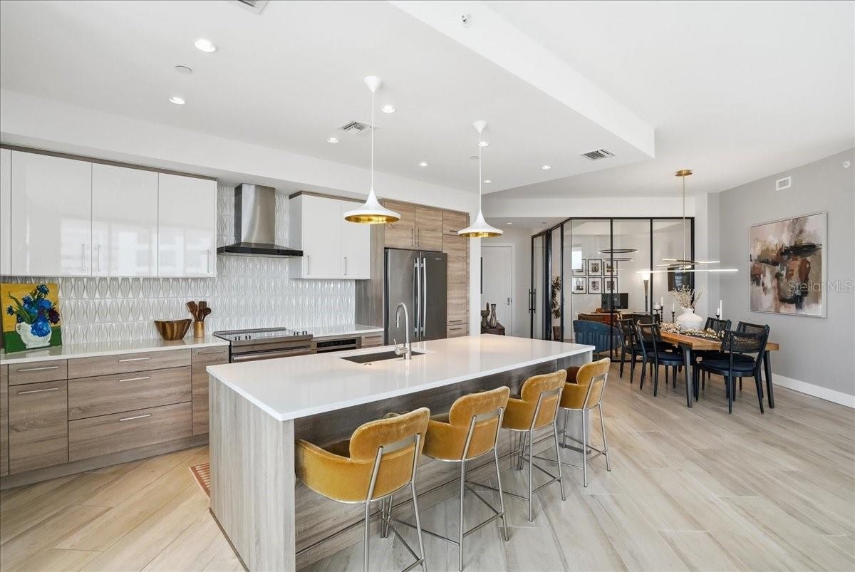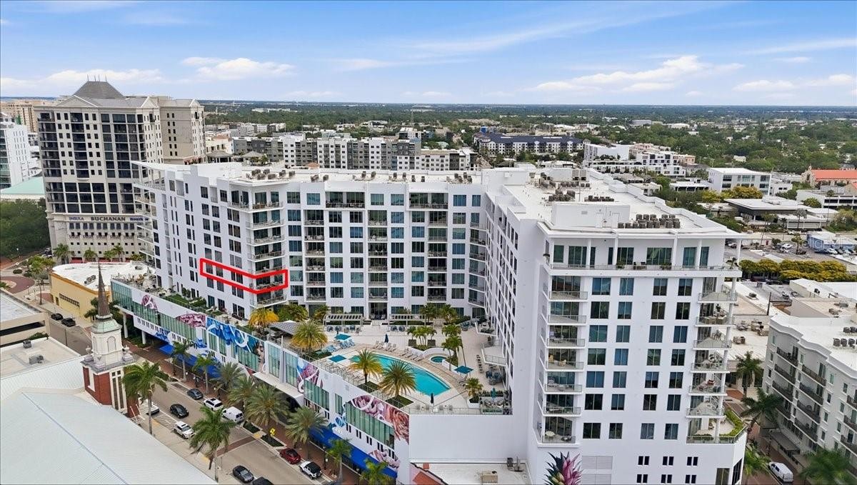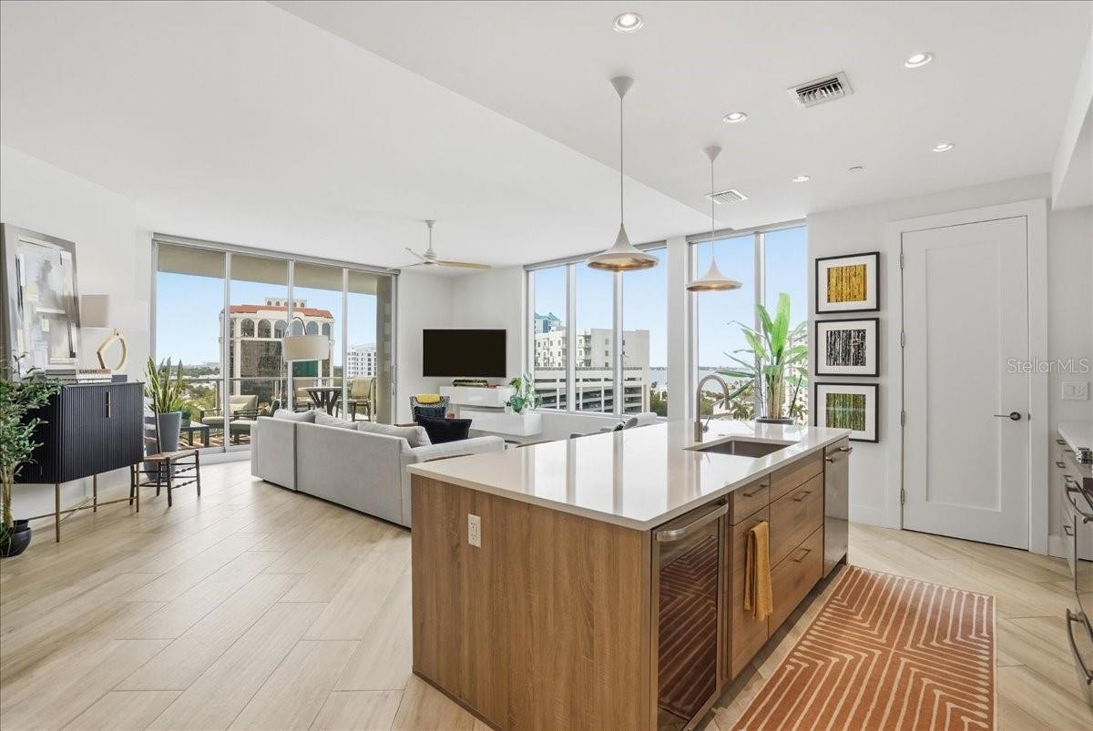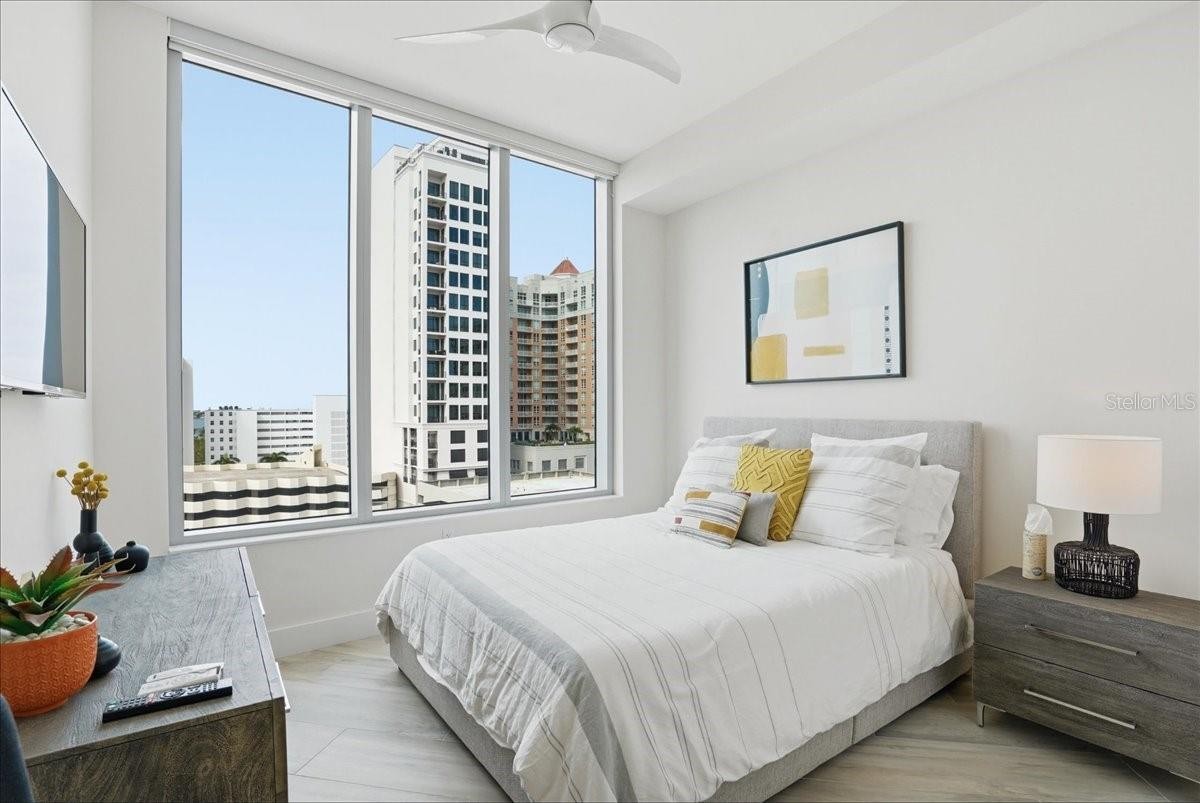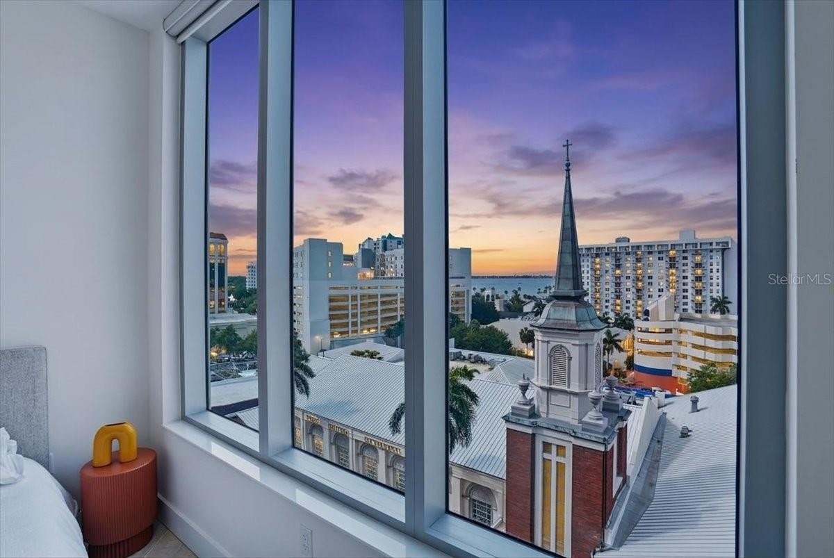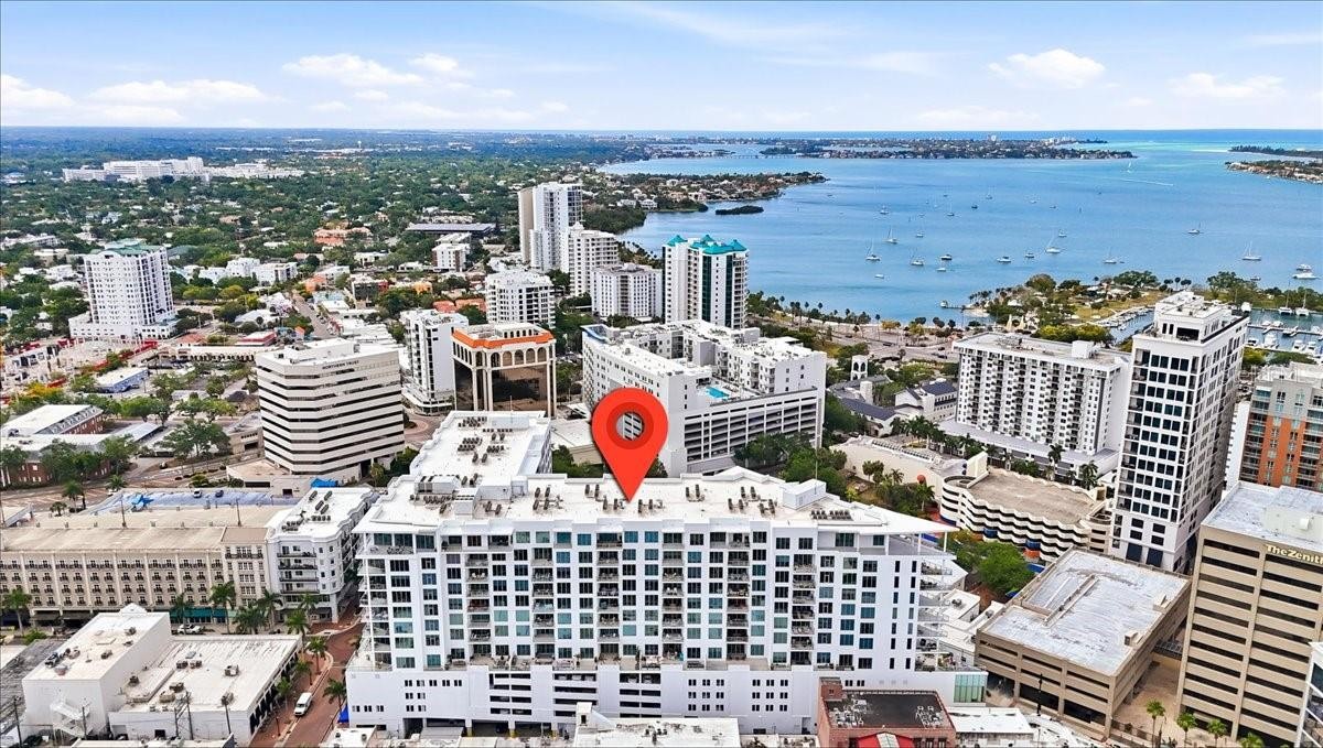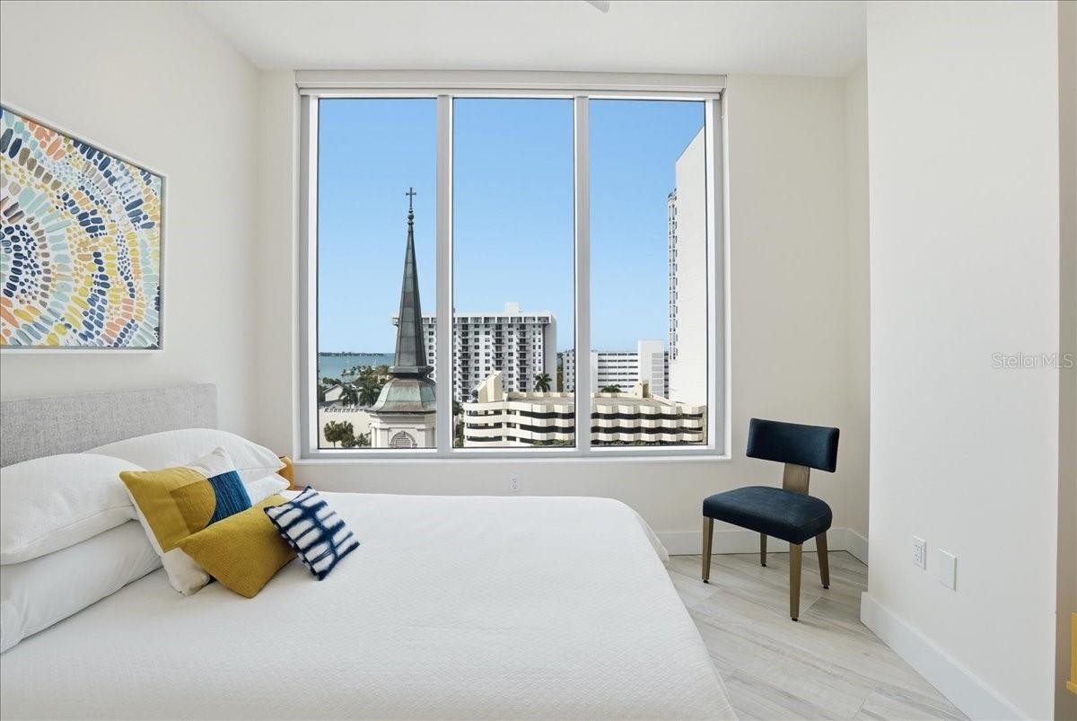 Design forward luxury at The Mark, where elevated living meets refined coastal elegance. This impeccably maintained End unit residence features three-bedroom, three and a half bath with a private office and showcases a seamless blend of sophistication and comfort, all framed by captivating Sarasota Bay views. From the moment you enter, walls of glass invite natural light to pour into the expansive living and dining spaces, creating an airy ambiance with soaring 10-foot ceilings. Breathtaking panoramic views of Sarasota's vibrant skyline and bay vistas from the living areas and bedrooms. Upscale custom remote-controlled window treatments allow you soft daylight with privacy when wanted. The open-concept design flows effortlessly to a generously sized balcony—accessible from both the family room and the primary retreat—offering a serene setting to enjoy morning sunrises or evening sunsets over the Sarasota Bay. A standout feature, the glass-enclosed office provides the perfect balance of privacy and connectivity—ideal for working from home while remaining visually engaged with the main living areas. The chef’s kitchen is both striking and functional, appointed with sophisticated European-style 2-tone cabinetry with soft close drawers, quartz countertops, and a full suite of Jenn-Air stainless appliances. Clean lines and a light, modern palette, and porcelain tile throughout enhance the home’s timeless appeal. The primary suite is a true retreat, featuring private balcony access, two custom walk-in closets with built-ins, and a spa-inspired bath with dual vanities, a frameless glass shower, and refined finishes throughout. Two additional bedrooms with en-suite bathrooms provide comfort and privacy for guests. A stylishly appointed powder bath is ideal for all of your guests and family. Every detail has been thoughtfully curated, from designer lighting to high-quality materials, delivering a polished and cohesive aesthetic throughout the residence. The residence includes 2 premium 3rd floor adjacent parking spaces in the secured parking garage and a storage unit within the building on the same level as unit. Quick access just 2 floors down to the amazing 5th floor amenities Residents of The Mark enjoy world-class amenities, including a large pool deck area, 65 foot resort-style heated saltwater pool and spa, cabana areas, fire pit and lounge area, outdoor grills, state-of-the-art fitness center, club lounge with a fireplace, bar, billiards, catering kitchen, and newsroom cafe, and 24-hour concierge services—all just steps from Sarasota’s vibrant dining, shopping, and cultural scene. A rare opportunity to own a sophisticated bay-view residence in the heart of downtown Sarasota