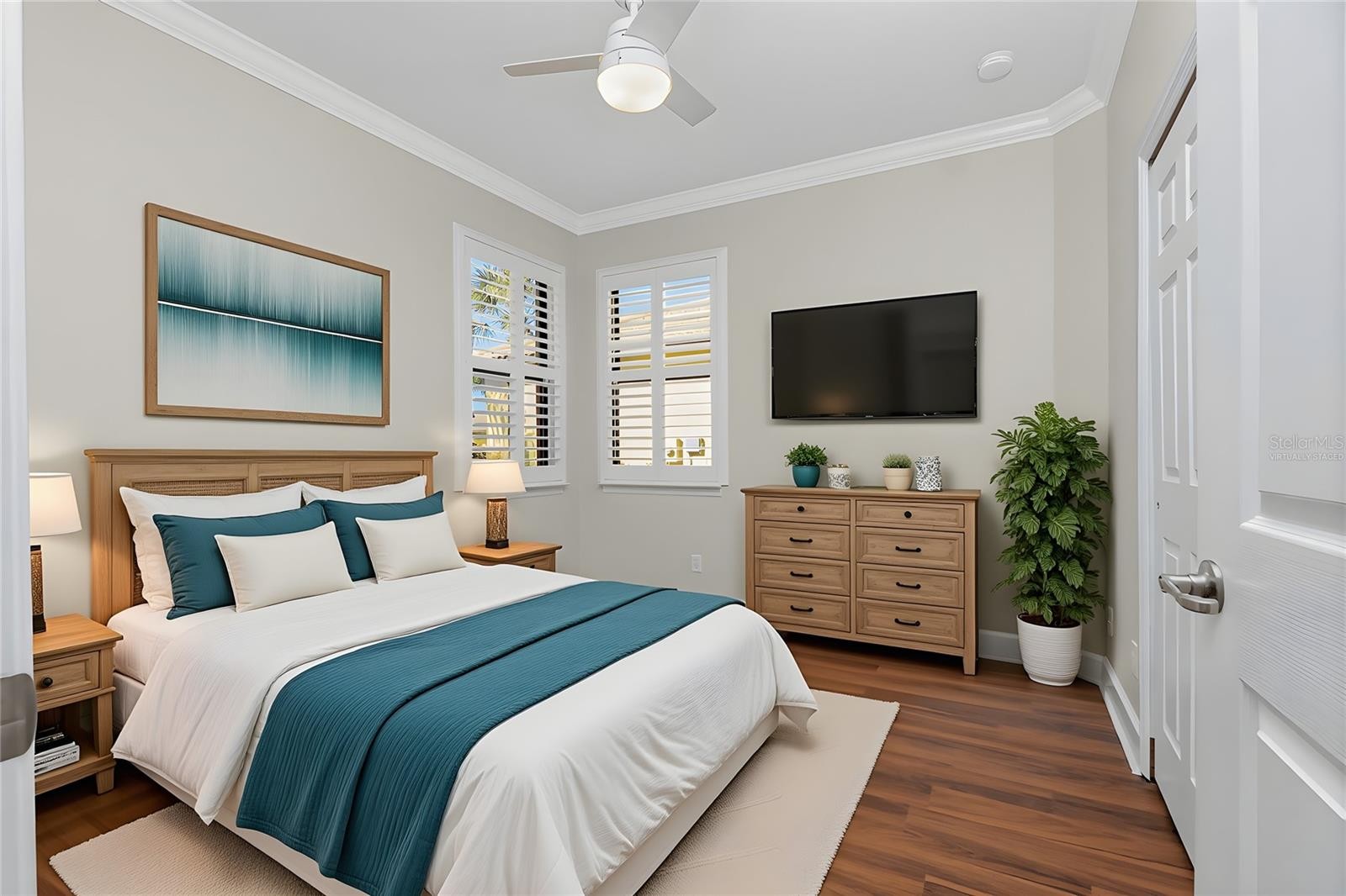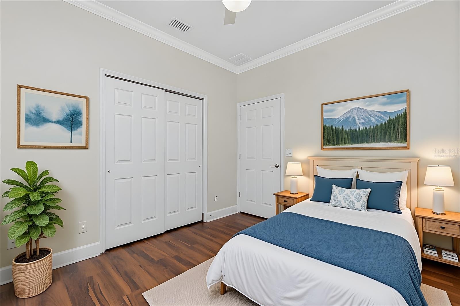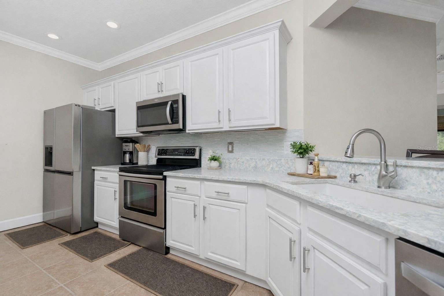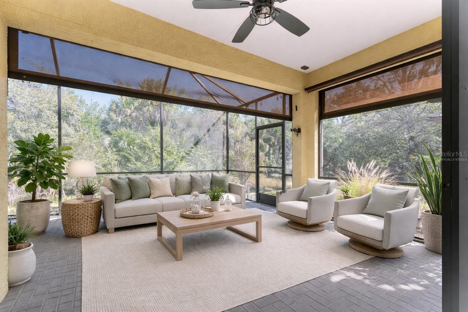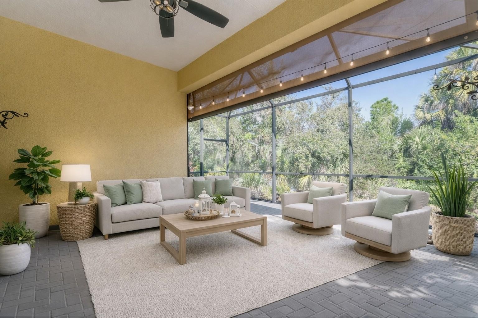 One or more photo(s) has been virtually staged. Welcome to 11162 Campazzo Dr!! You are going to fall in love with this light-filled and tastefully UPDATED end-unit villa with NO REAR NEIGHBORS, offering 2 bedrooms, 2 bathrooms, and a flexible den space. The home features a completely CARPET-FREE interior with a thoughtfully updated mix of flooring throughout — all replaced within the last year. The main living areas and most rooms feature tile for easy maintenance, while the primary bedroom offers attractive Pergo laminate flooring. One secondary bedroom includes updated vinyl flooring, and the office/den showcases beautiful bamboo flooring, adding warmth and character to the space. The entire home has also been freshly painted, creating a clean, move-in ready feel. The beautifully refreshed kitchen showcases QUARTZ COUNTERTOPS, an oversized sink and upgraded faucet, and a sleek glass tile backsplash. All STAINLESS APPLIANCES are BRAND NEW except the range, including the French door refrigerator, adding both style and functionality. The spacious primary suite enjoys peaceful preserve views and features a stylishly renovated ensuite bath with dual quartz vanities and a large, bright tiled walk-in shower that creates a spa-inspired feel. The main living area is further enhanced by a cozy electric fireplace, perfect for adding ambiance and comfort. Step outside to the extended lanai and unwind while taking in the serene, unobstructed preserve backdrop — perfect for morning coffee, evening relaxation, or entertaining guests. The space is further enhanced by convenient ELECTRIC HURRICANE SHADES, providing added protection, privacy, and year-round comfort. Within the last 2 years, NOTABLE UPGRADES include REMODELED PRIMARY BATHROOM, NEW QUARTZ KITCHEN COUNTERTOPS, UPGRADED KITCHEN SINK AND FAUCET, NEW GLASS TILE BACKSPLASH, NEW HOT WATER HEATER, NEW HVAC SYSTEM, FRESH INTERIOR PAINT, UPDATED FLOORING in select rooms, and the addition of GARAGE CEILING STORAGE RACKS for excellent organization and maximized overhead space and AC was replaced in 2022. The home has been meticulously maintained and shows true pride of ownership. The versatile den offers endless possibilities — ideal for a home office, reading retreat, or guest space. Residents of this desirable 55+ community enjoy resort-style amenities including a heated pool and spa, resistance pool, fitness center, clubhouse, bocce, billiards, and more.