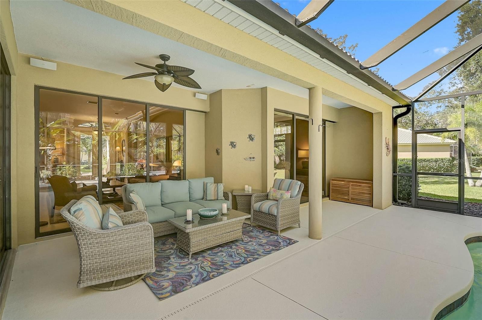 Experience Florida living at its finest in this exceptional Lee Wetherington 4-bedroom, 3-bath executive home plus office, complete with a 3-car garage and set on a private preserve lot in the coveted Savannah Lakes section of River Wilderness Golf & Country Club. Meticulously maintained and beautifully upgraded, this residence blends timeless elegance with modern comfort. The open-concept layout showcases upscale finishes throughout, including 10” crown molding, tray ceilings, Plantation shutters, rich hardwood floors, granite countertops, and stainless steel appliances. The gourmet kitchen flows effortlessly into the living and dining spaces—perfect for everyday living or entertaining guests. Step outside and enjoy your own private oasis. The expansive lanai features a heated pool and spa, a custom-built outdoor kitchen with a Memphis wood pellet grill, live-edge bar, and granite countertops, and a West Coast custom awning for shaded comfort. Recent enhancements include new pool equipment, heater, and filter system (2021–2025), no-see-um re-screening, updated lanai surface and lighting, and upgraded outdoor landscape and accent lighting to set the perfect evening ambiance. Inside, thoughtful improvements continue with a new refrigerator (2022), dishwasher (2021), upgraded lighting fixtures throughout, and custom tile and shelving in the primary bath shower. Discover refined living where comfort, style, and quality craftsmanship come together in one of Parrish’s most desirable communities. River Wilderness offers a lifestyle of comfort and security with a 24-hour manned guard gate, community boat ramp on the Manatee River, and optional memberships for Golf, Tennis, Athletic, and Social activities—all without mandatory fees. With the Ft. Hamer Bridge providing easy access to Lakewood Ranch, you’ll enjoy the best of both privacy and convenience. This home is move-in ready and waiting for its next owner to enjoy all that River Wilderness has to offer.