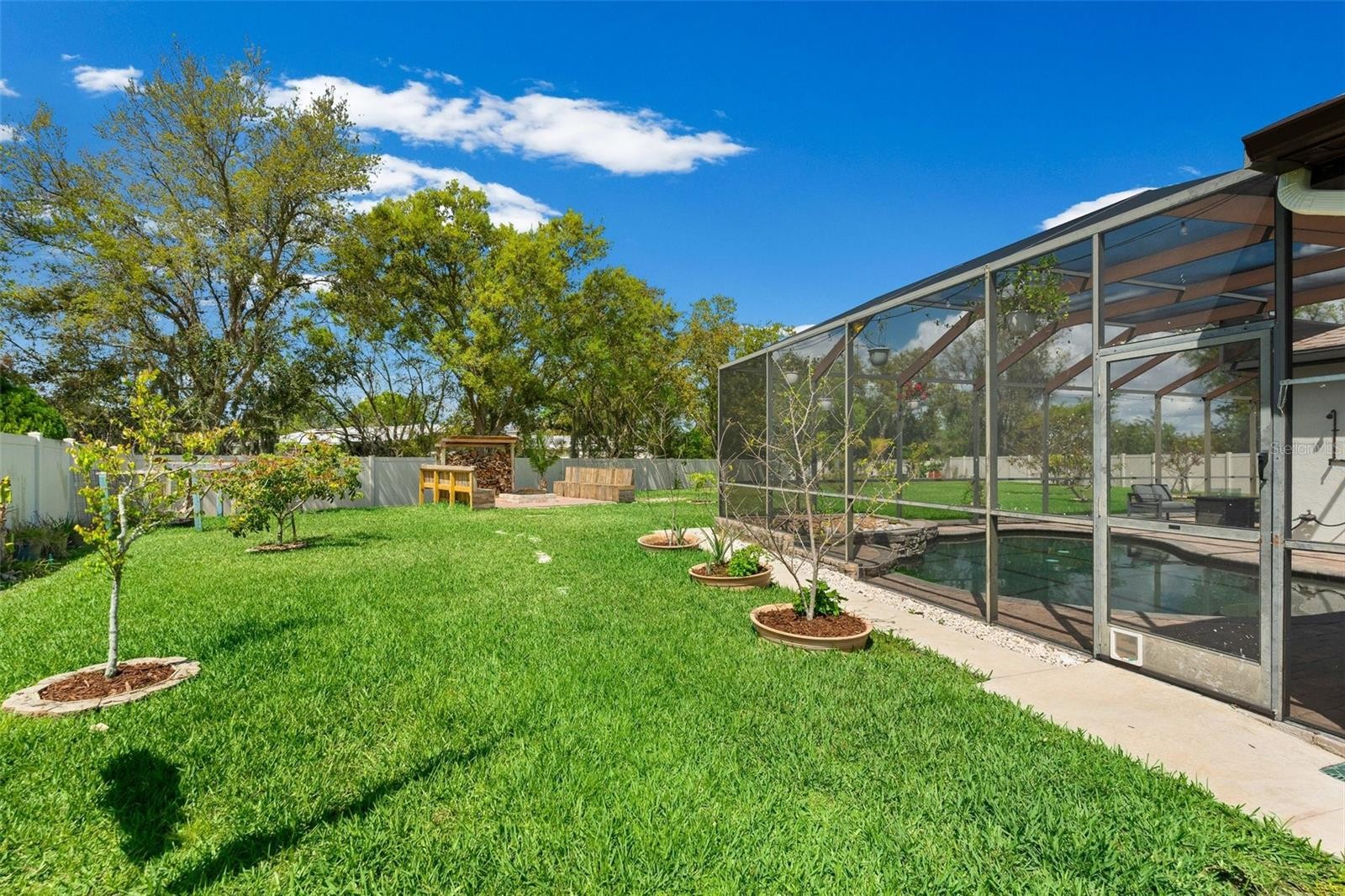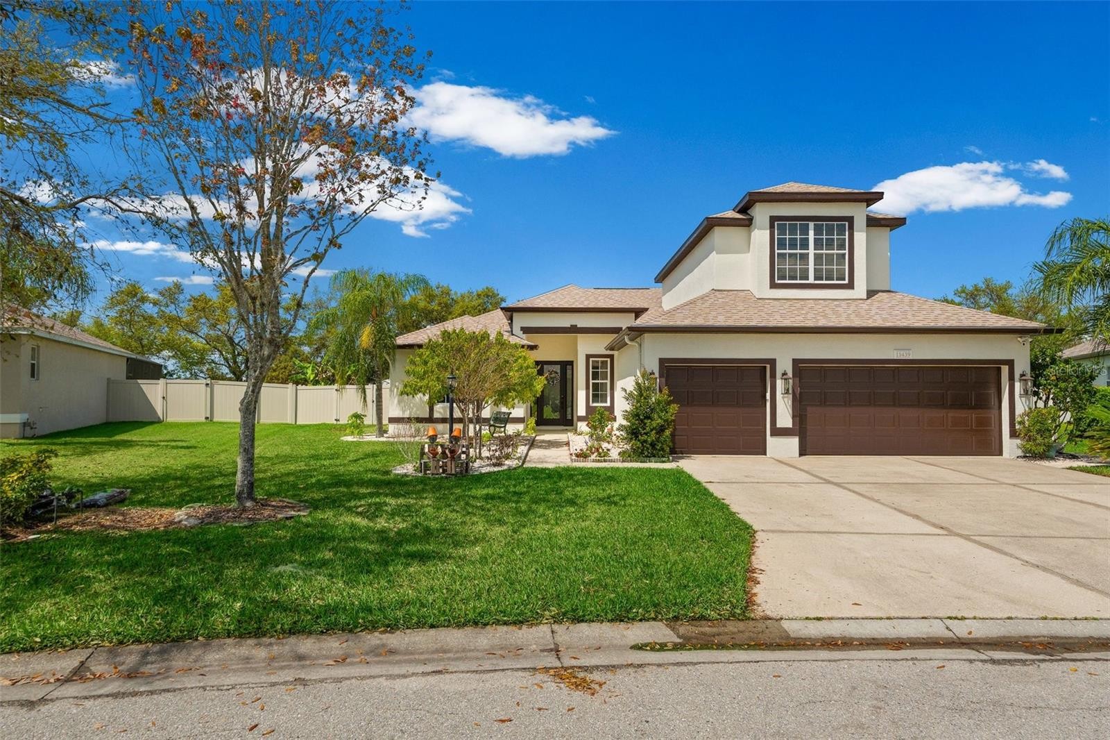 Welcome home to this stunning, nearly 100% renovated luxury estate, where modern elegance meets an expansive outdoor oasis. Situated on an oversized, fully fenced lot with no CDD fees, this property offers the rare combination of privacy and sophisticated design. Step inside to find breathtaking 1x5 wood-look tile flooring that flows through an open layout accented by crown molding and custom designer light fixtures. The gourmet kitchen is a showstopper, featuring sleek quartz countertops, and pop-up countertop chargers. No detail was spared in the 2024 overhaul, which also includes a new roof, HVAC, water heater, and garage door. The backyard is a private resort, anchored by a custom saltwater pool with a tranquil fountain and a brand-new pool pump. Gather around the custom outdoor fire pit with built-in bench seating, or explore the lush landscaping featuring multiple exotic fruit trees serviced by a drip line irrigation system. Functional upgrades abound with underground gutters, a 10x10 storage shed, and fresh exterior paint.Perfectly positioned for convenience, you are minutes away from major commuter routes and the vibrant new developments of shops and dining. This is a "new construction" feel without the wait or the extra fees! The community amenities include a resort style pool, basket ball, pickleball, playground, and walking trails all for a very affordable $106 per month!